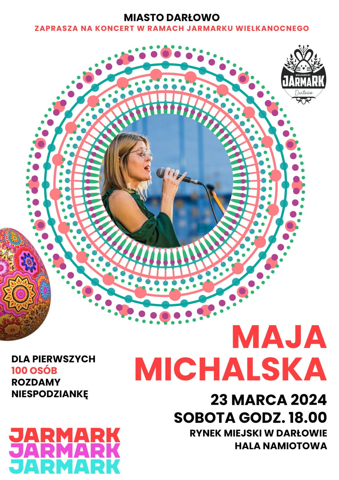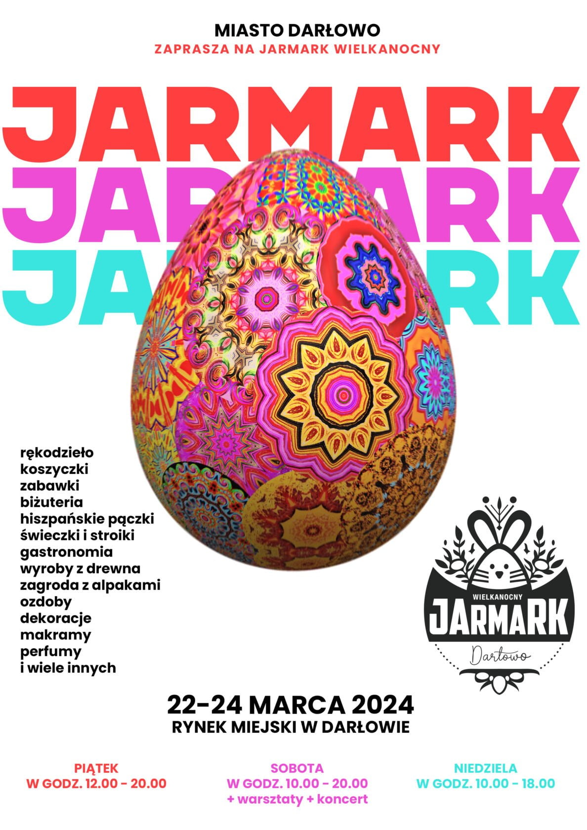 Po sukcesie Jarmarku Bożonarodzeniowego Miasto Darłowo szykuje dla Państwa kolejne wydarzenie targowe z okazji zbliżających się Świąt Wielkanocnych. Jarmark Wielkanocny odbędzie się już w dniach 22-24 marca. Organizatorzy na płycie darłowskiego rynku wybudują dwie hale namiotowe, w których przez trzy dni będzie można zakupić liczne specjały od regionalnych wystawców. Tu królować będzie rękodzieło, ozdoby, stroiki, koszyczki, zabawki, gastronomia, wyroby z drewna, dekoracje i wiele innych atrakcji. Znajdzie się również miejsce na zagrodę z alpakami. Dzieci i rodziców zapraszamy szczególnie w dniu 23 marca o godz. 13.00 (sobota) na warsztaty z robienia palm wielkanocnych z Anną Grabowską. Spragnionych muzycznych uniesień zapraszamy również w sobotę na koncert. O godz. 18.00 swoim talentem uraczy nas Maja Michalska. Dla pierwszych stu osób, którzy przybędą na koncert rozdamy pamiątkowe jarmarczne drewniane kieliszki na jajka sygnowane jedynym słusznym hasłem: “lubiędarłowo”. Jarmark funkcjonować będzie w następujących godzinach: