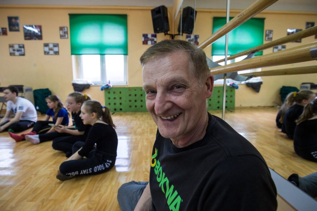 Starszy mężczyzna uśmiecha się w sali gimnastycznej z dziećmi