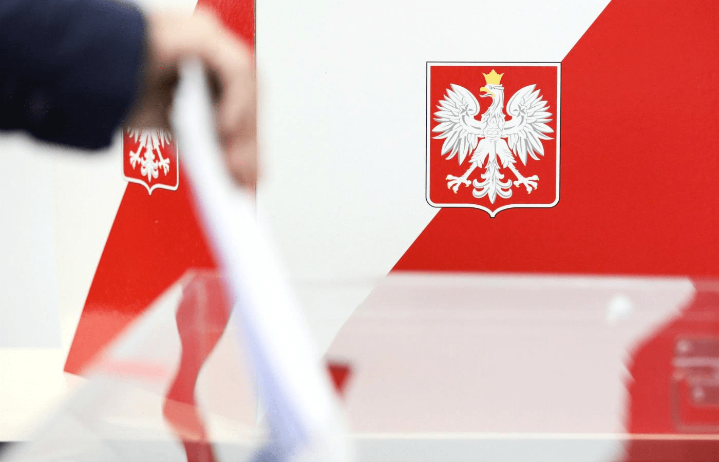 Flaga Polski z godłem, ręką wrzucającą kartkę