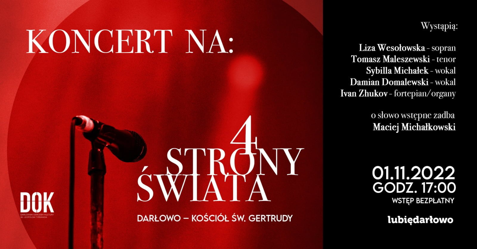 Darłowski Ośrodek Kultury zaprasza wszystkich mieszkańców Darłowa, Turystów i Gości do udziału w wyjątkowym wydarzeniu muzycznym. Koncert pn. Na 4 Strony Świata dedykowany jest głownie tym, którzy odeszli, za którymi tęsknimy i których nosimy w sercu.