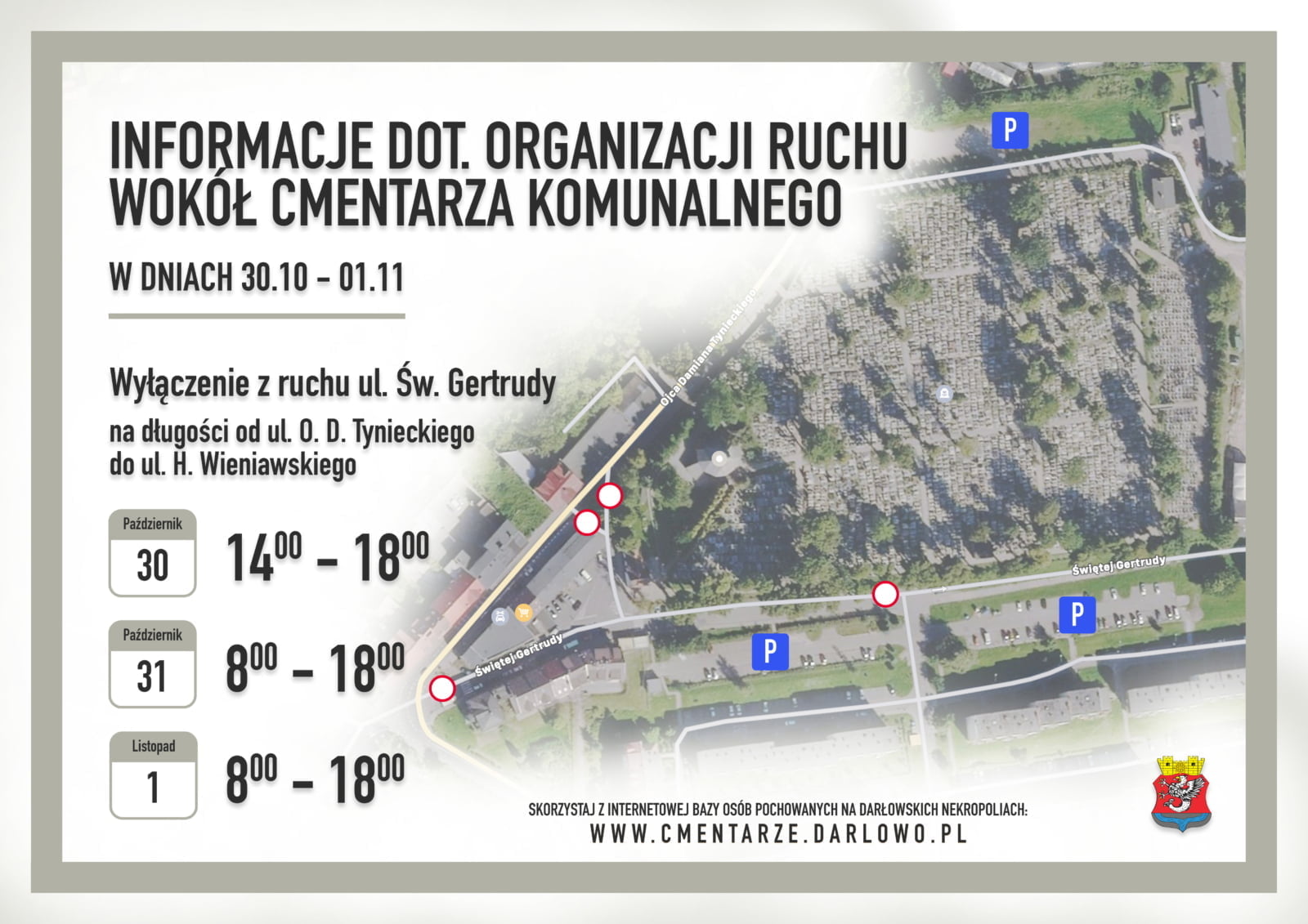 W związku ze zwiększonym natężeniem ruchu pieszego przy głównych wejściach na najstarszą nekropolię w Darłowie zmianie ulegnie organizacja ruchu drogowego. 30 października w godz. 14:00-18:00, a także 31 października oraz 1 listopada w godz. 8:00-18:00 zamknięta będzie ul. Św. Gertrudy na długości od ul. O. D. Tynieckiego do ul. H. Wieniawskiego.