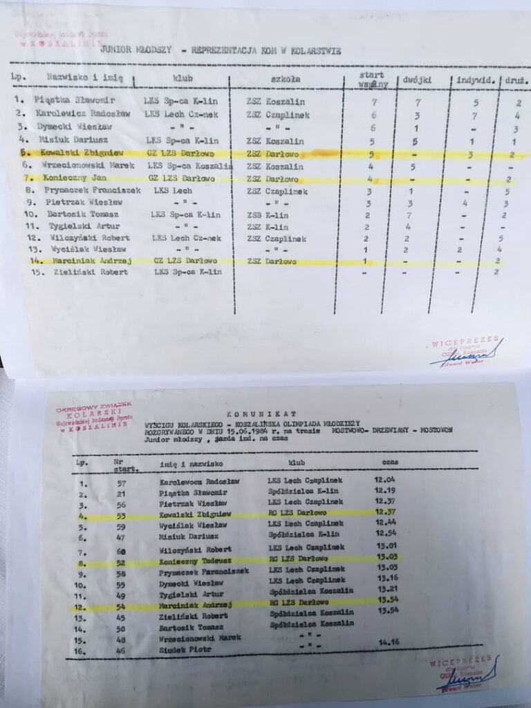 Już kilkanaście miesięcy później nazwiska naszych kolarzy, juniorów zaczęły pojawiać się na listach najlepszych zawodników zawodów. Byli to: Zbyszek Kowalski, Tadeusz Konieczny czy Andrzej Marciniak. Skutkowało to powołaniem tych chłopców do reprezentacji województwa na Olimpiadę Młodzieży.
