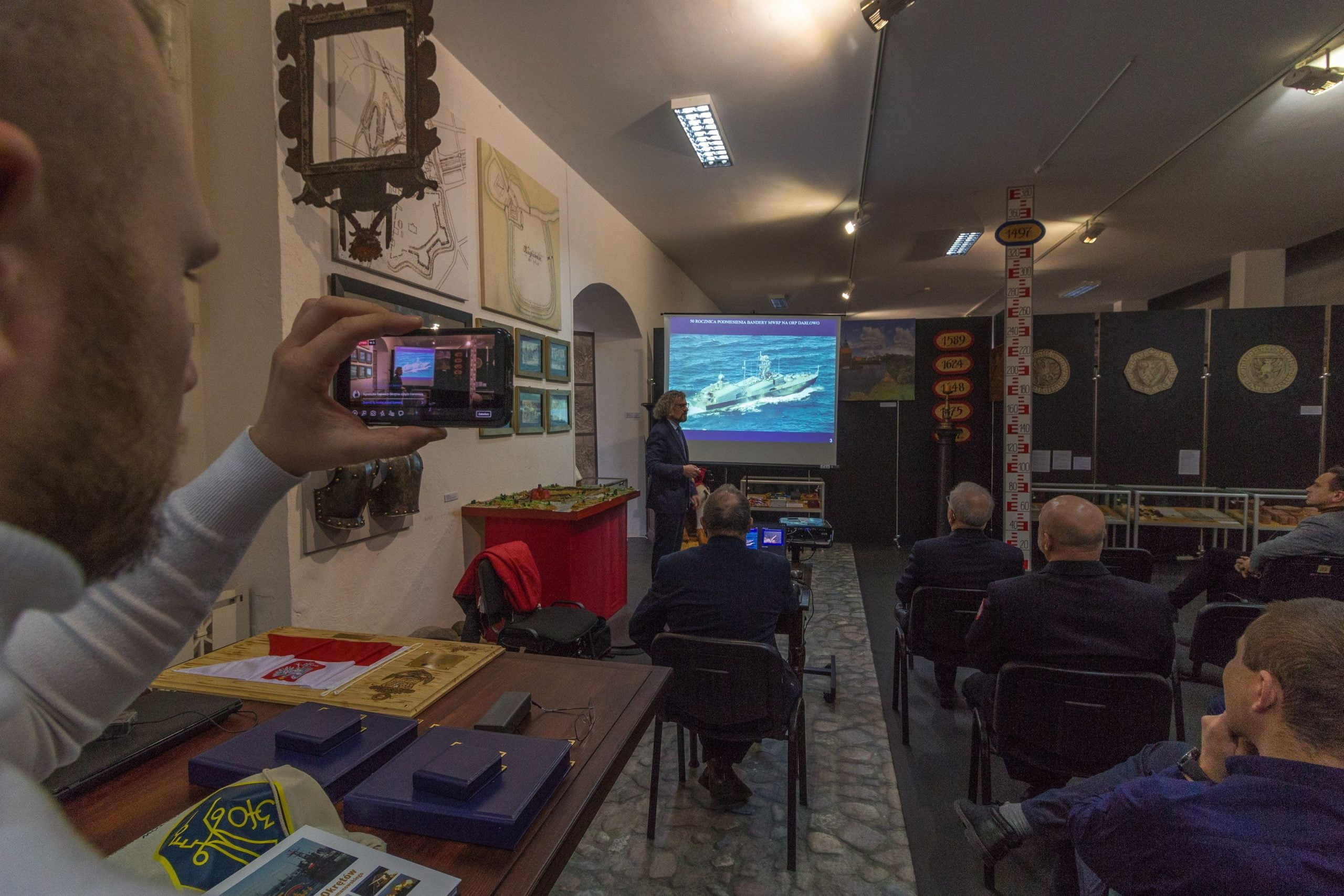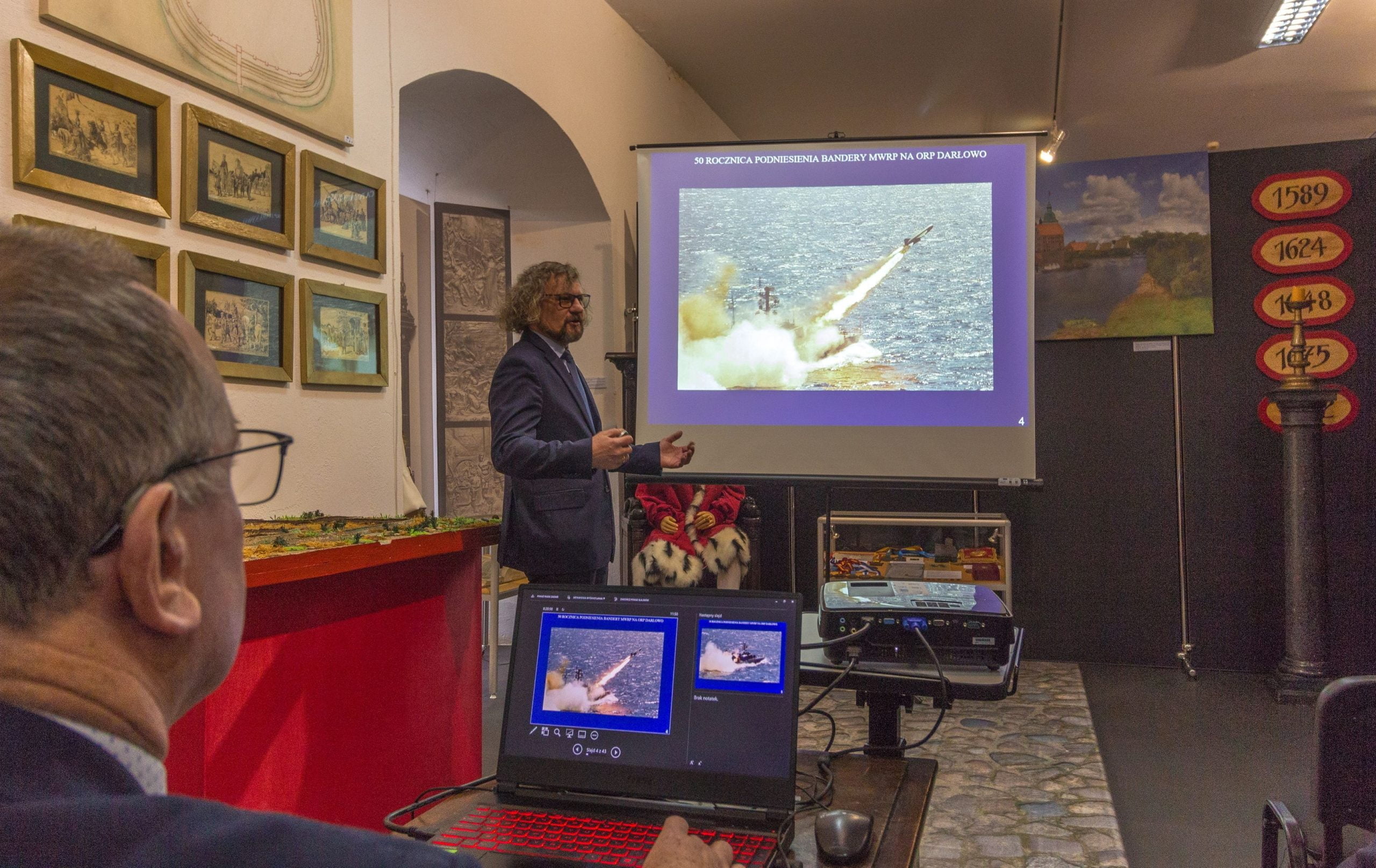 W związku z tym mogliśmy zobaczyć z bliska niesamowitą wystawę zachowanych oryginalnych elementów wyposażenia ORP „Darłowo” (wystawa cały czas jest dostępna dla zwiedzających w Zamku Książąt Pomorskich w Darłowie). Niezwykle ciekawą atrakcją były prezentacje multimedialne dotyczące okrętów rakietowych klasy „205” w służbie Marynarki Wojennej RP, które były prowadzone przez byłych dowódców ORP „Darłowo”. Prowadzący bardzo chętnie odpowiadali na liczne pytania słuchaczy. Smaczku całemu wydarzeniu dodawało to, że można było osobiście porozmawiać z byłymi dowódcami, co niewątpliwie bardzo cieszyło obecnych na spotkaniu miłośników wojskowości.