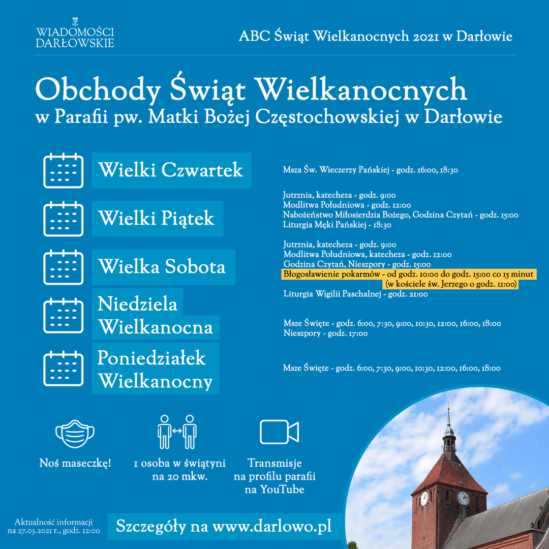 Parafia informuje, że za pośrednictwem kanału na YouTube: „Parafia MB Częstochowskiej w Darłowie” odbędą się transmisje uroczystości wg harmonogramu: 01.04, 02.04 – godz. 18:30, 02.04 – godz. 21:00, 04.04 – godz. 10:30, 12:00, 05.04 – godz. 10:30, 12:00.