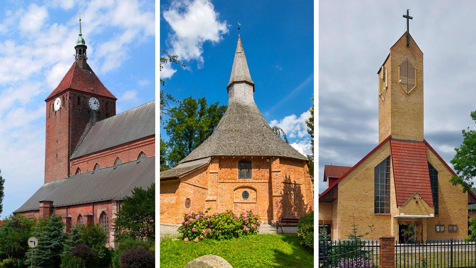 Trzy różne kościoły w Polsce, ceglany, z trzcinowym dachem