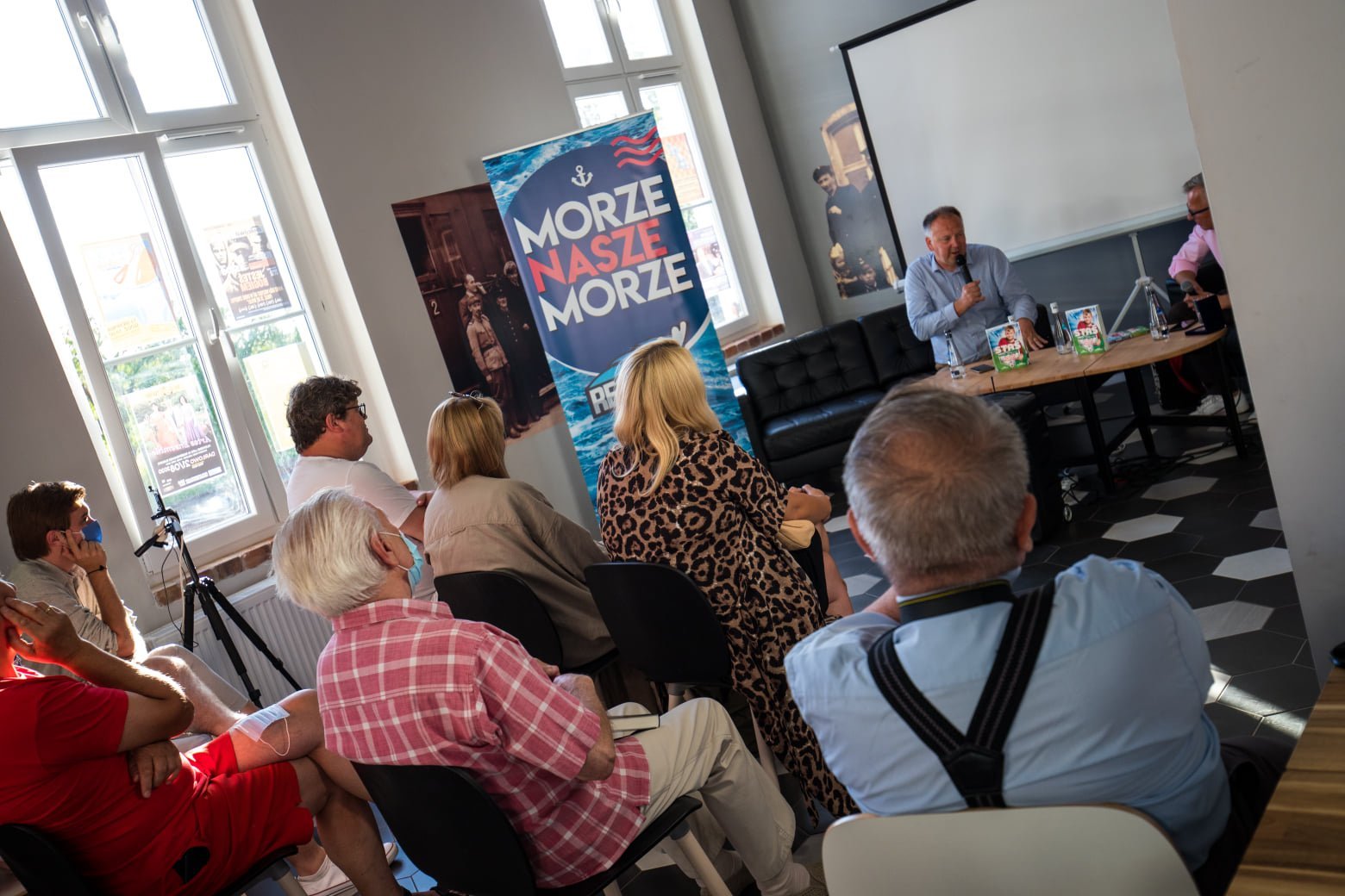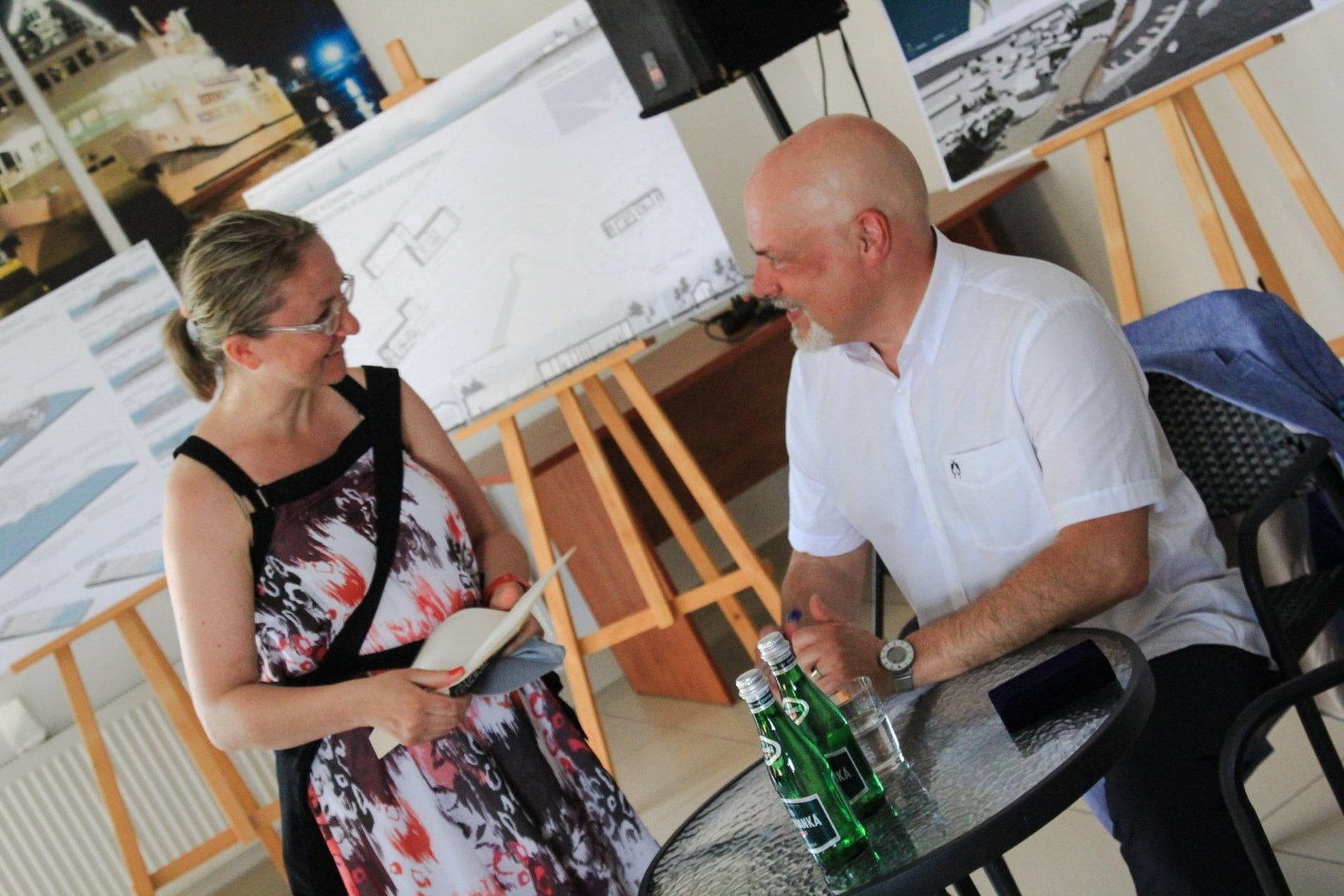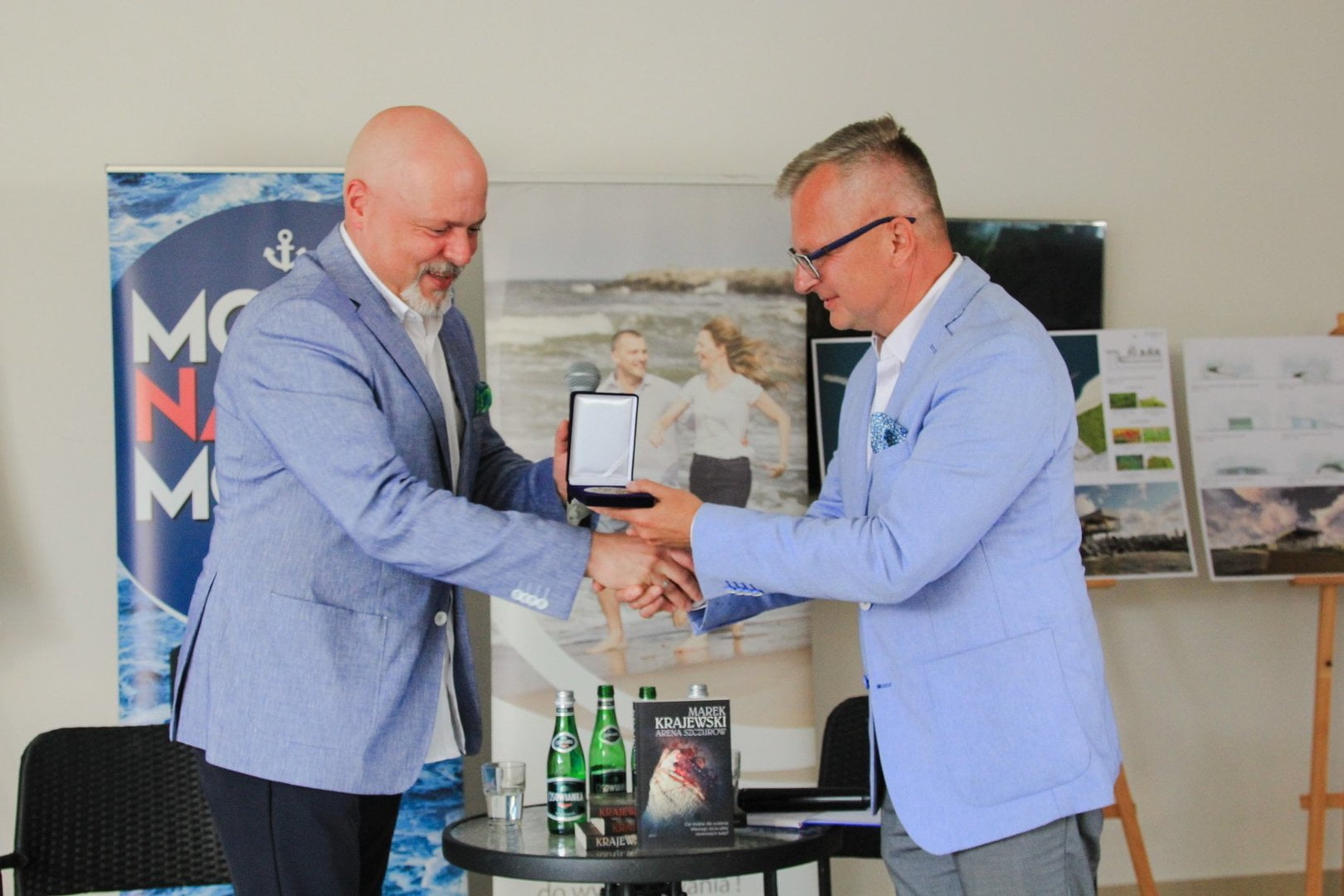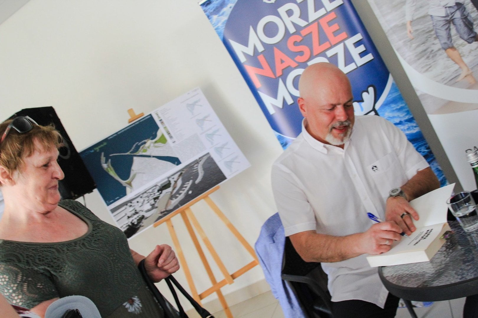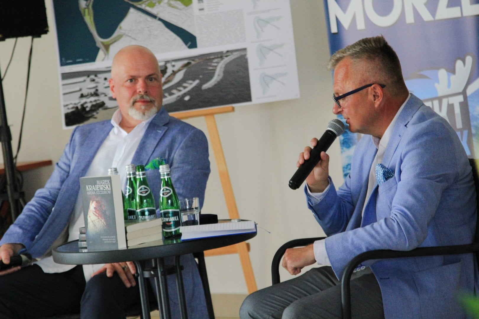 Ze znawstwem i wielką znajomością dzieł autorarozmowę poprowadził przyjaciel pisarza Arkadiusz Klimowicz – Burmistrz Darłowa. Pojawienie się pisarza w auli terminalu od razu przykuło uwagę uczestników spotkania. W Darłowie znacznie lepiej znają Marka Krajewskiego i jego twórczość, ponieważ jest on tu dosyć częstym gościem. Pierwszy raz był tu, będąc w Dąbkach na wakacjach, jako szesnastoletni młodzieniec. Z Darłowa wybrał sobie Małgorzatę swoją ukochaną muzę na małżonkę, która organizuje mu dogodne warunki do twórczości i dba o rozwój jego wielu talentów. Jest ona również pierwszym wymagającym recenzentem jego twórczości. Małgorzata i Marek Krajewscy byli pomysłodawcami Spotkań Literackich o tematyce kryminalnej, jakie były organizowane w Darłowie podczas Festiwalu Media i Sztuka. Był to jedyny w Polsce zjazd czołowych twórców powieści kryminalnych i osób związanych z tematyką kryminalną. Marek Krajewski był duchowym patronem i moderatorem Darłowskich Spotkań Literackich.W tych twórczych spotkaniach udział brali m.in.: Mariusz Czubaj, Marcin Wroński, Zygmunt Miłoszewski, Katarzyna Bonda, Paweł Jaszczuk oraz asy polskiej policji kryminalnej i medycy sądowi jak np. Paweł Leśniewski, Leszek Koźmiński, Jerzy Kawecki. Darłowo ze swoją atmosferą i gościnnością stanowi wyjątkowe miejsce do rozmów i spotkań z pisarzami powieści kryminalnych, ale też do przeprowadzania różnorodnych działań społeczno-artystycznych popularyzujących kulturę i sztukę. Wielka szkoda, że koronawirus uniemożliwił organizację tegorocznego już 10. Festiwalu Media i Sztuka zgodzili się prowadzący spotkanie Arkadiusz Klimowicz – burmistrz Darłowa i Marek Krajewski.