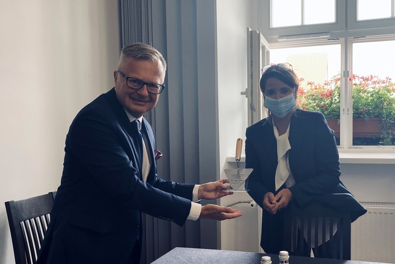 Arkadiusz Klimowicz podczas spotkania w urzędzie miejskim otrzymał natomiast symboliczną kielnię na znak dobrego partnerstwa publiczno-prywatnego.