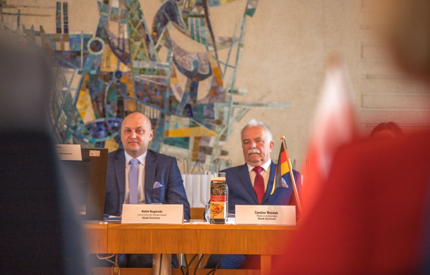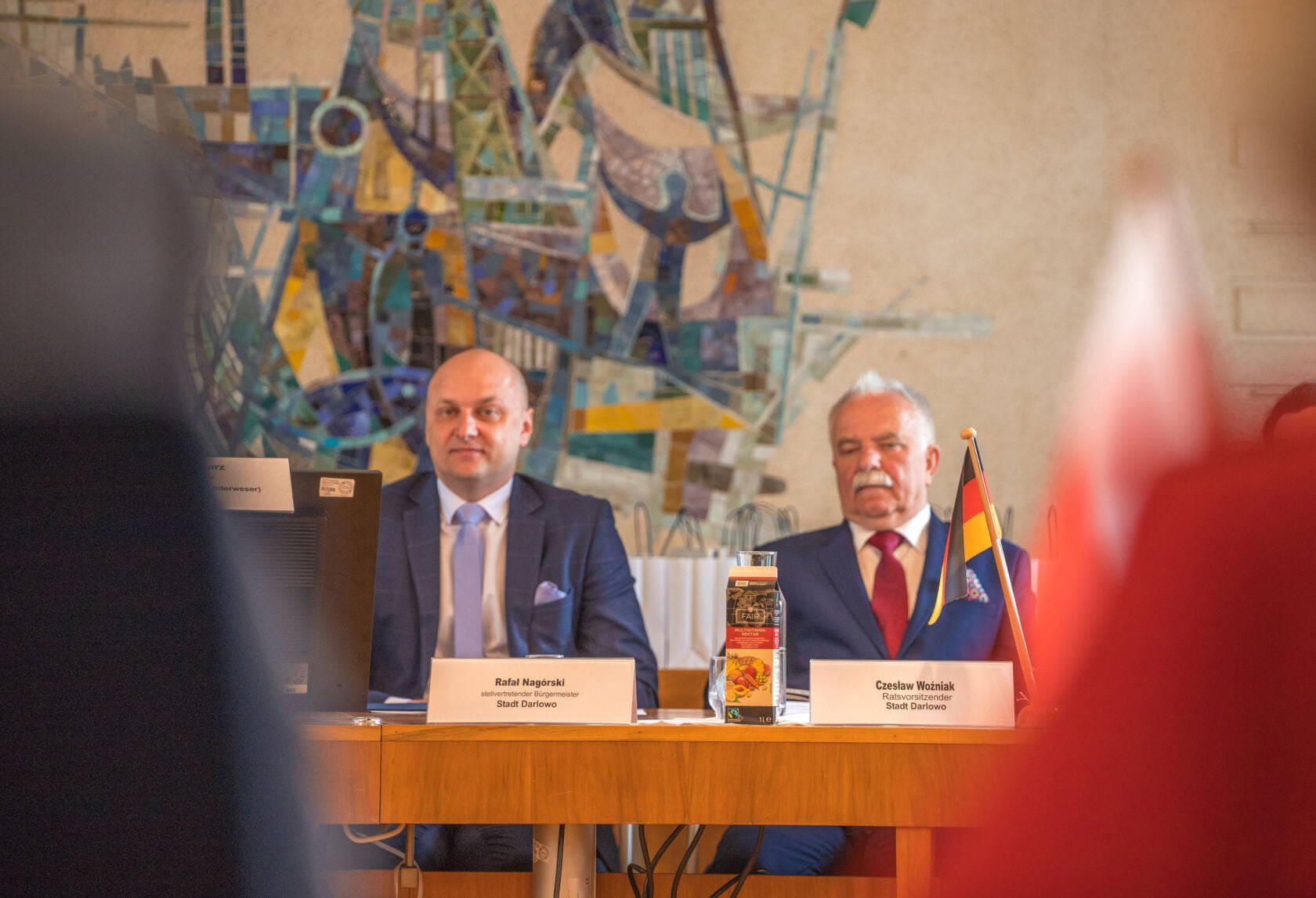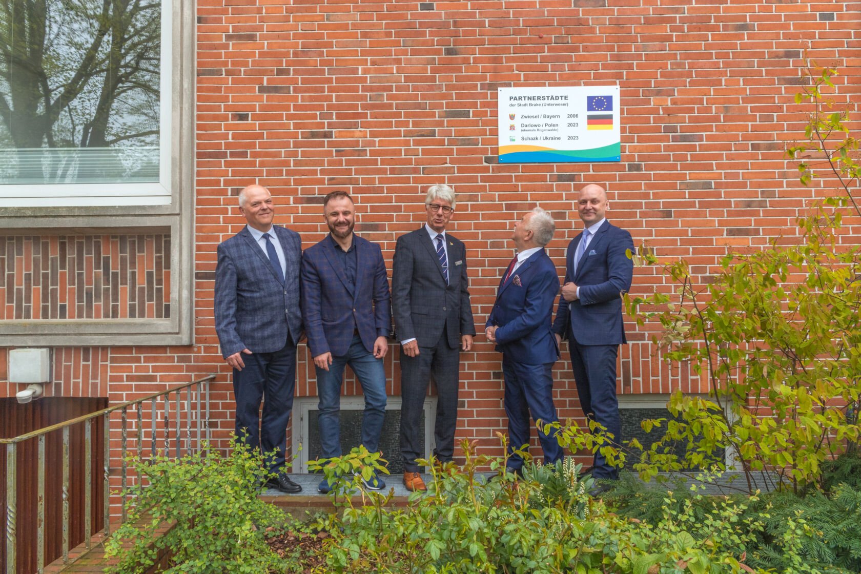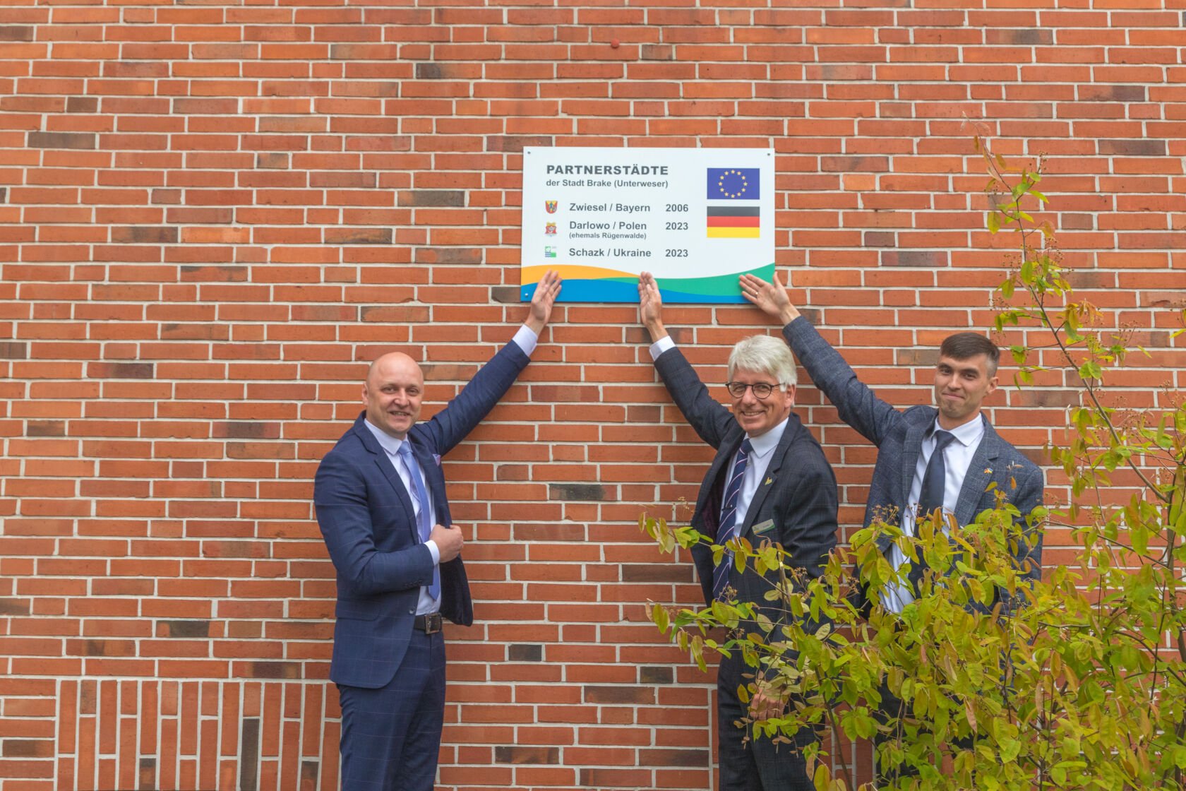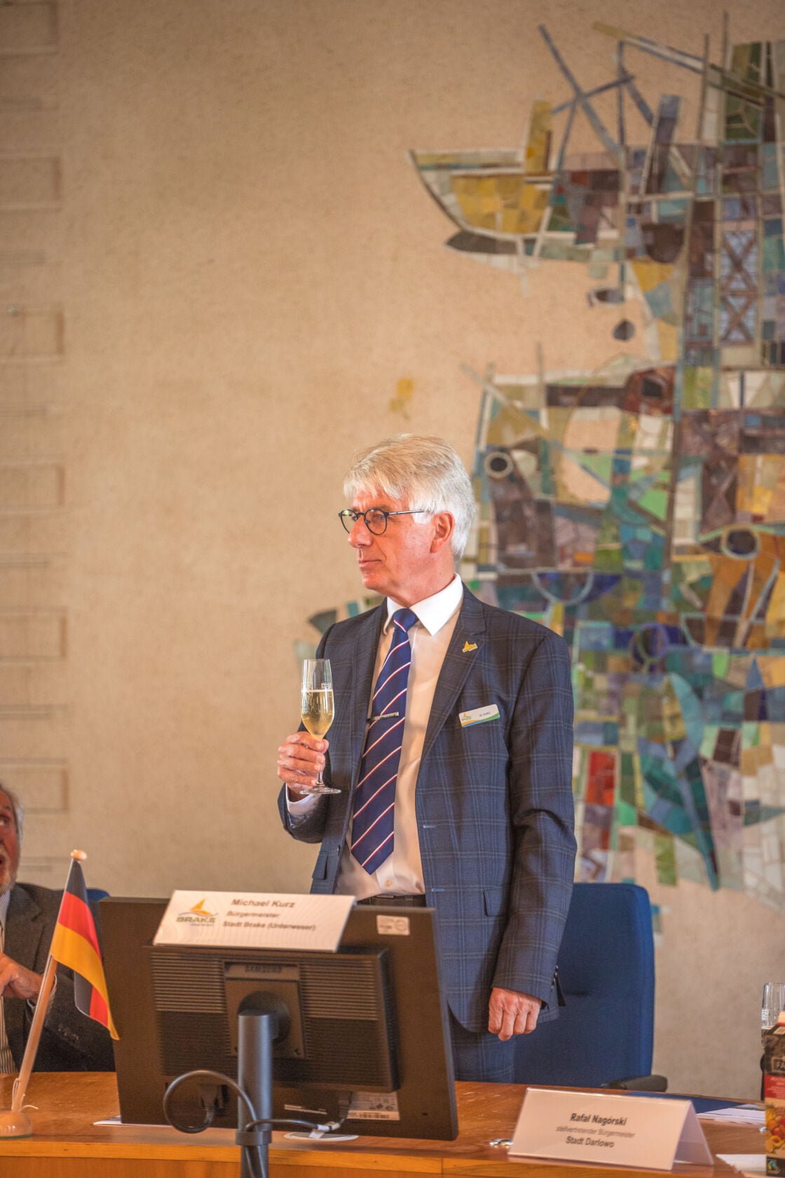 Darłowo podczas uroczystości reprezentowali: zastępca burmistrza – Rafał Nagórski, przewodniczący Rady Miejskiej Czesław Woźniak, kierownik referatu oświaty i spraw społecznych Zbigniew Mielczarski i kierownik biura promocji i komunikacji społecznej, odpowiedzialnego również za kontakty z zagranicznymi partnerami, Artur Wejnerowski. Darłowska delegacja przyjechała do Brake z „Darem Mieszkańców Darłowa”, czyli minisłuchowiskiem przygotowanym w dwóch wersjach językowych – po polsku i niemiecku. Możemy w nim posłuchać o historii miasta oraz o związku Darłowa z położoną nieopodal Brake fabryką Rugenwalder Muhle.