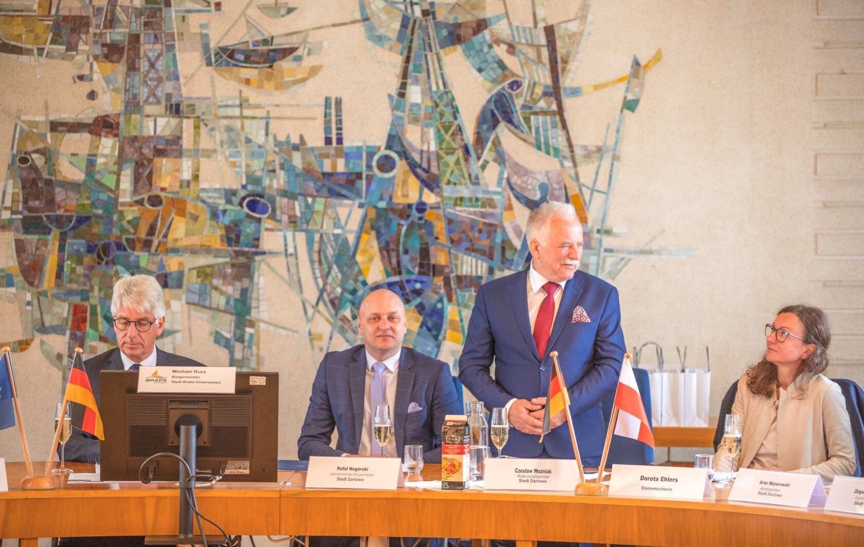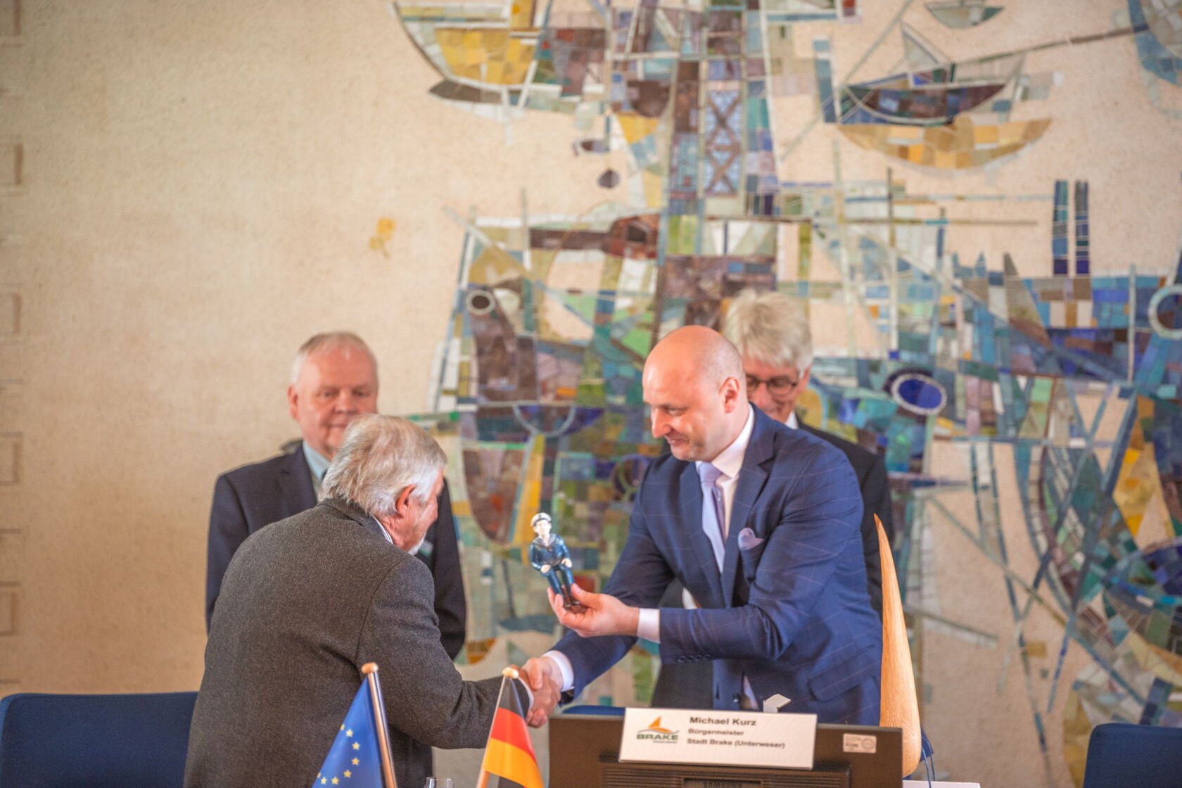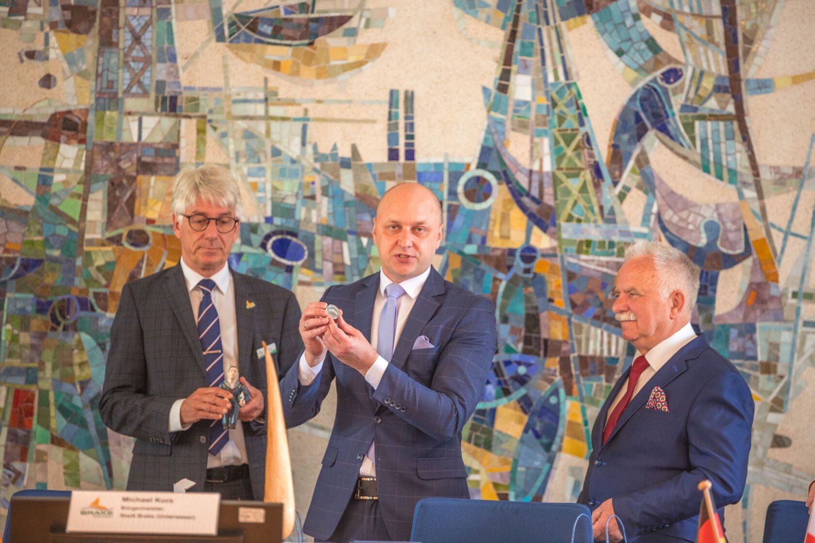 Osobom zaangażowanym w uroczystości podpisania umowy oraz 30 radnym Rady Miejskiej w Brake wręczono również specjalnie wybitą na tę okazję pamiątkową monetę.