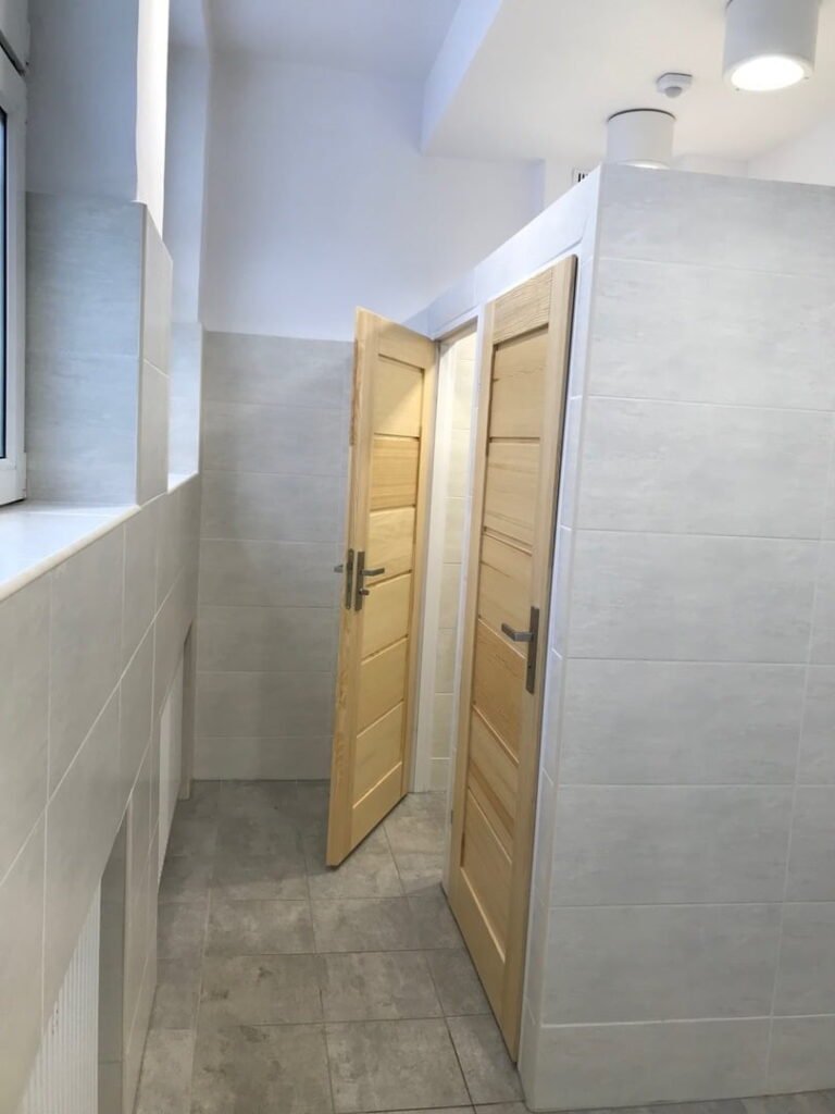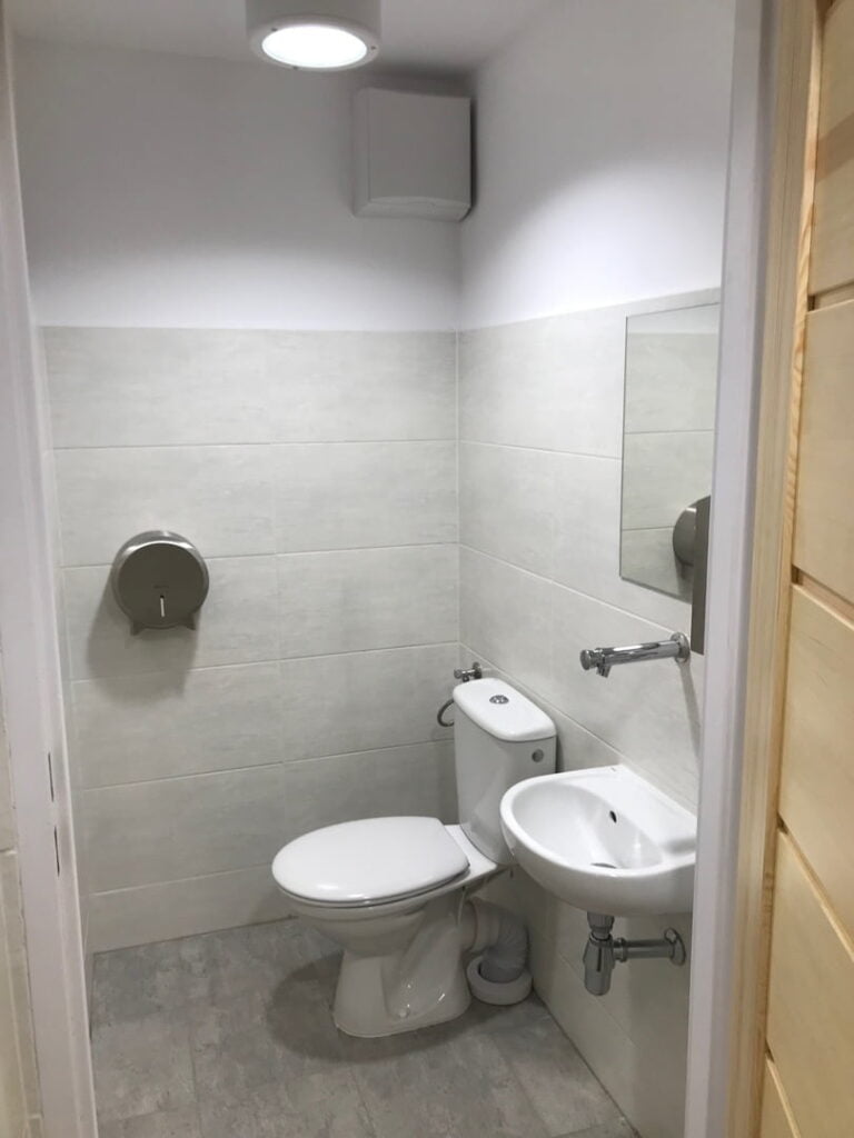 Zakres prac wymusił od nas całkowity remont łazienek. W związku z czym każda łazienka na nowo wyłożona została nową glazurą na podłogach i ścianach. Wewnątrz zamontowano nowe urządzenia sanitarne. Zamontowano też automatyczne oświetlenie.