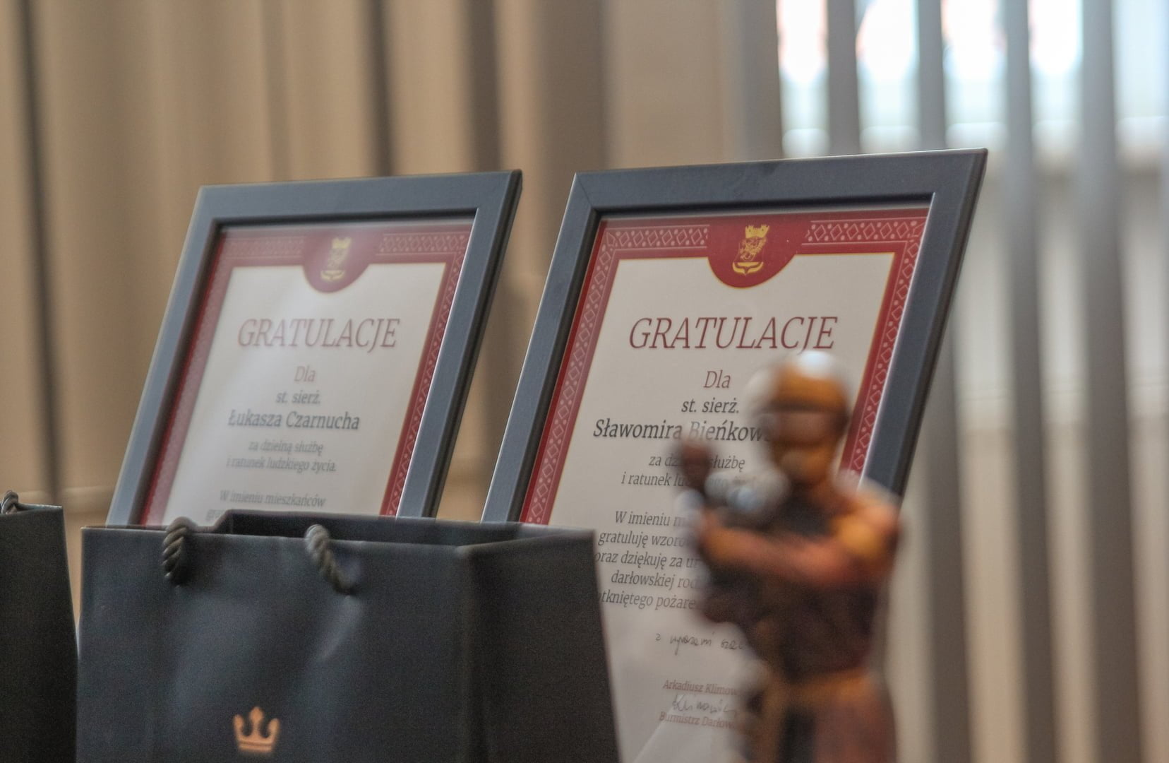 St. sierż. Łukasz Czarnuch i st. sierż. Sławomir Bieńkowski pojawili się na miejscu zdarzenia już 4 minuty po zgłoszeniu. Ewakuowali oni 4 osoby dorosłe (dwóch mężczyzn i dwie kobiety, w tym jedną poruszającą się na wózku inwalidzkim). Dzięki ich heroizmowi nikt nie ucierpiał. W uznaniu dla ich znamienitego zachowania przekazano im gratulacje i nagrody rzeczowe.