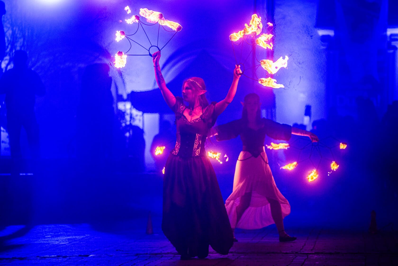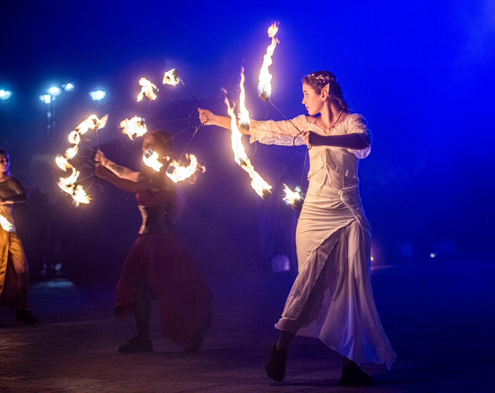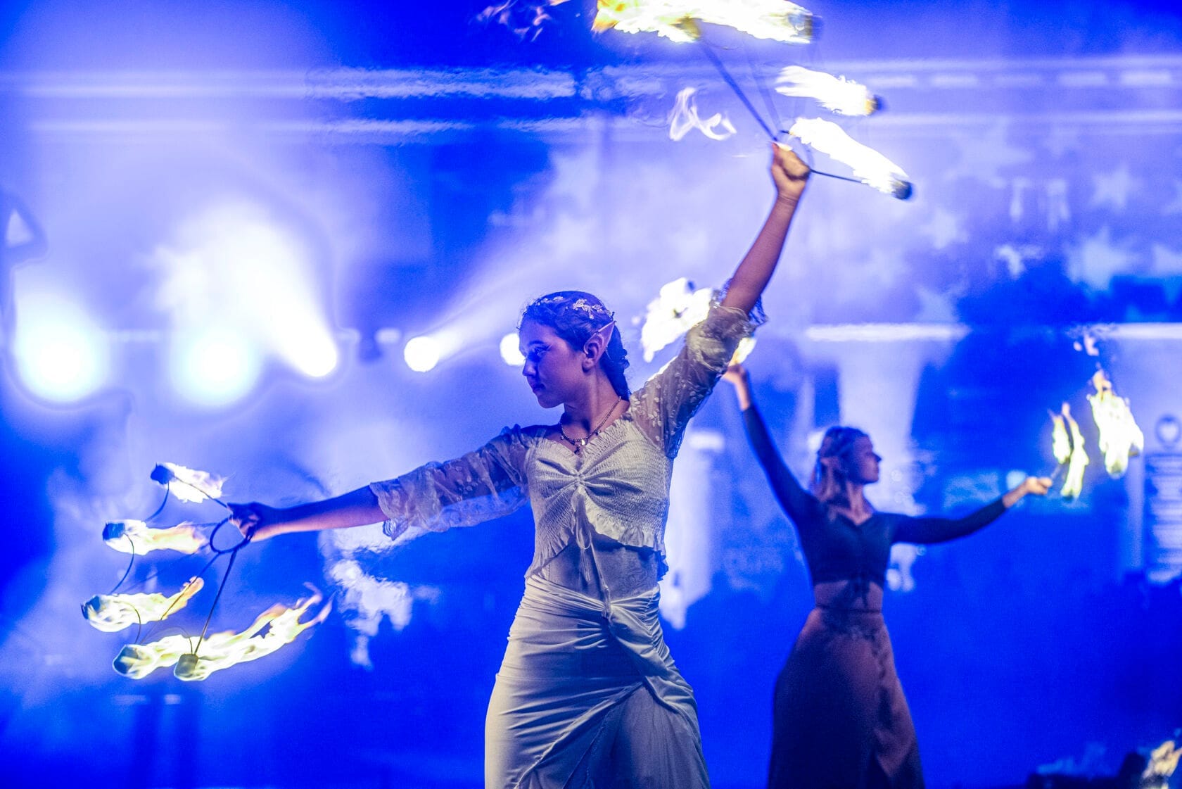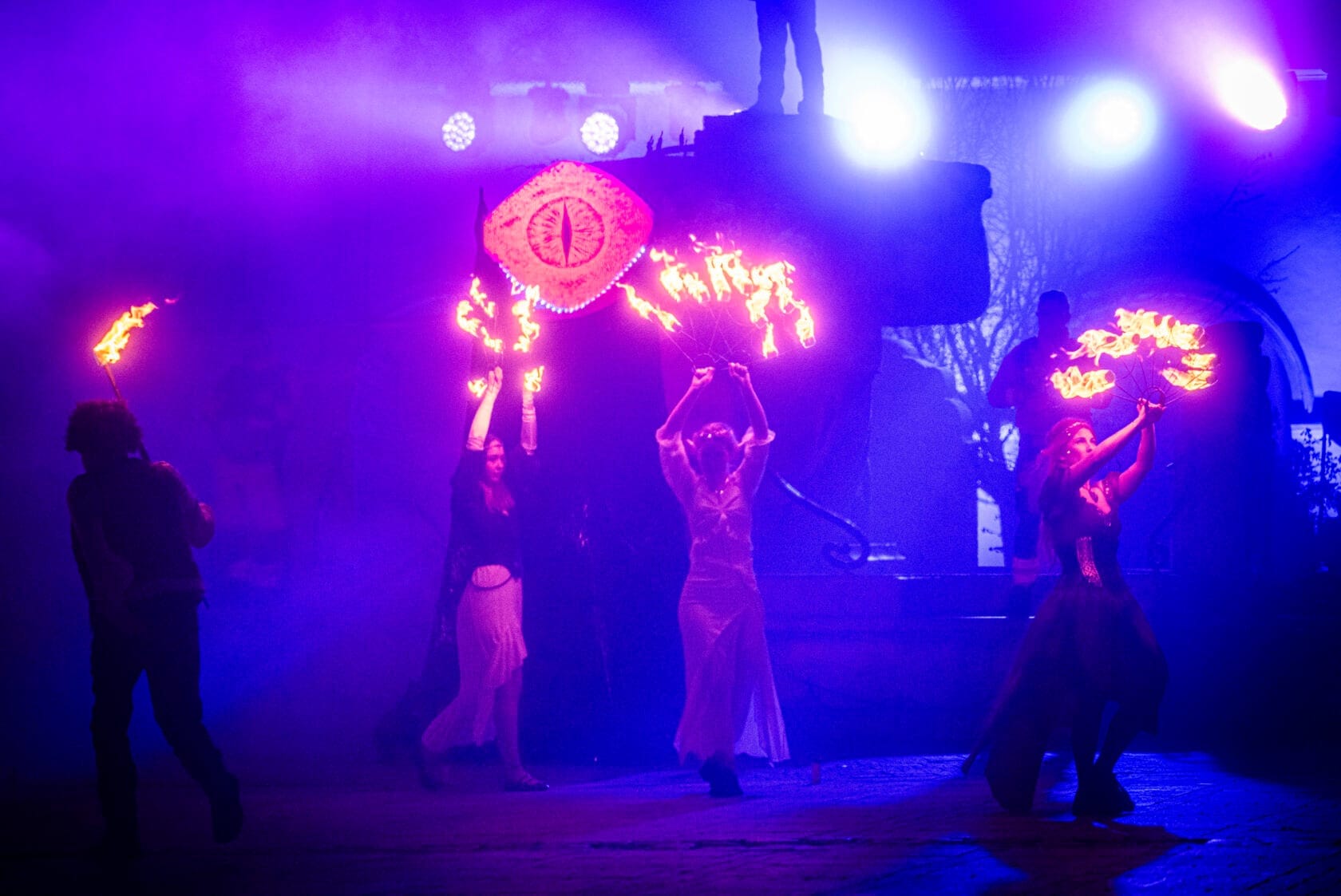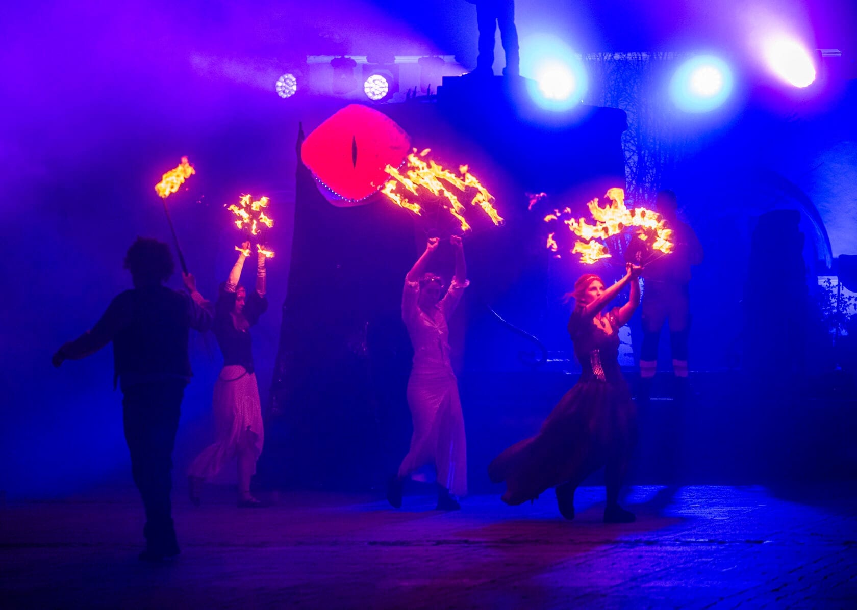 Kobiety tańczą z palącymi się pochodniami na scenie