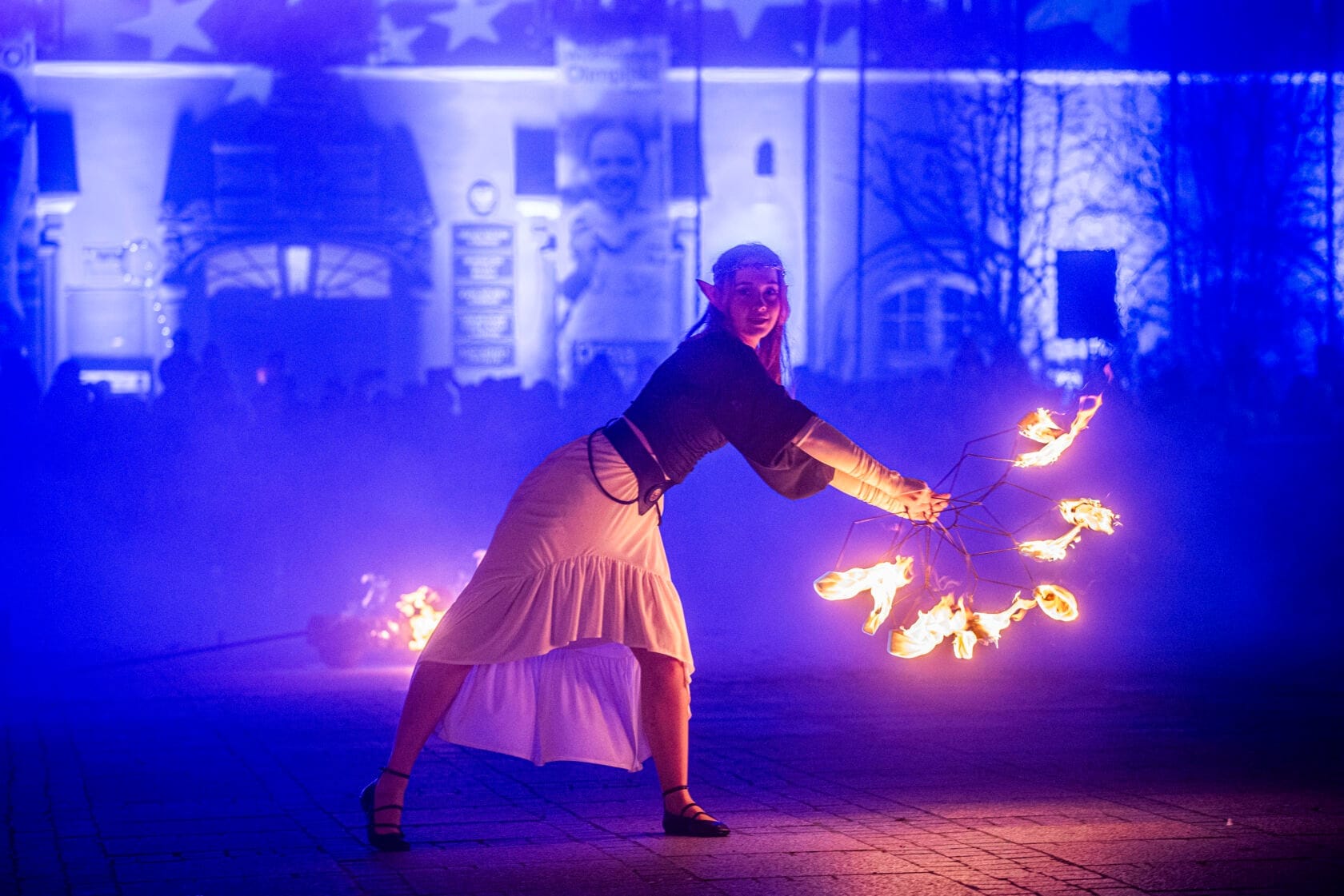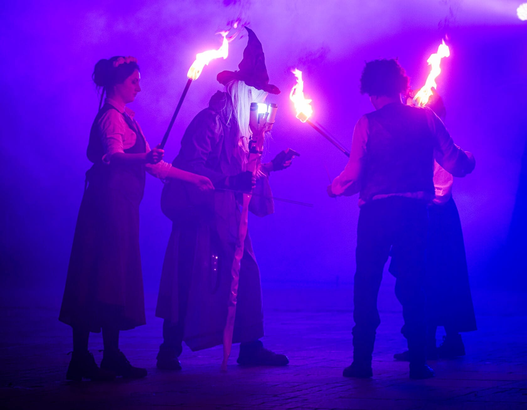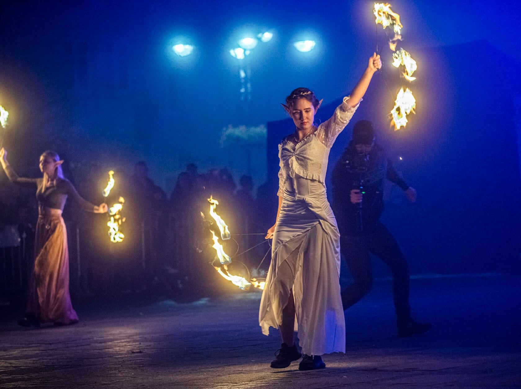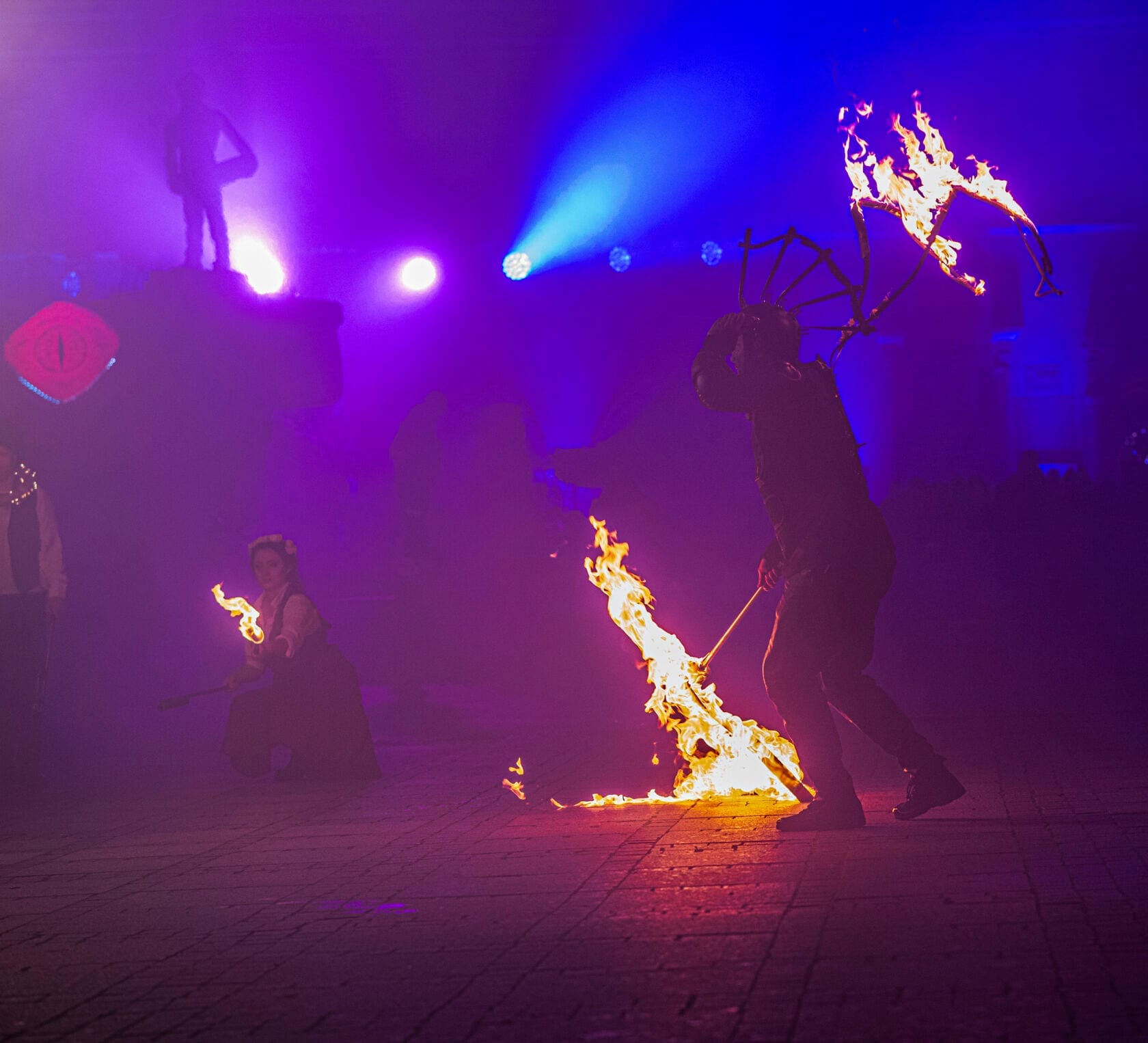 Kobiety tańczą z palącymi się pochodniami na scenie
