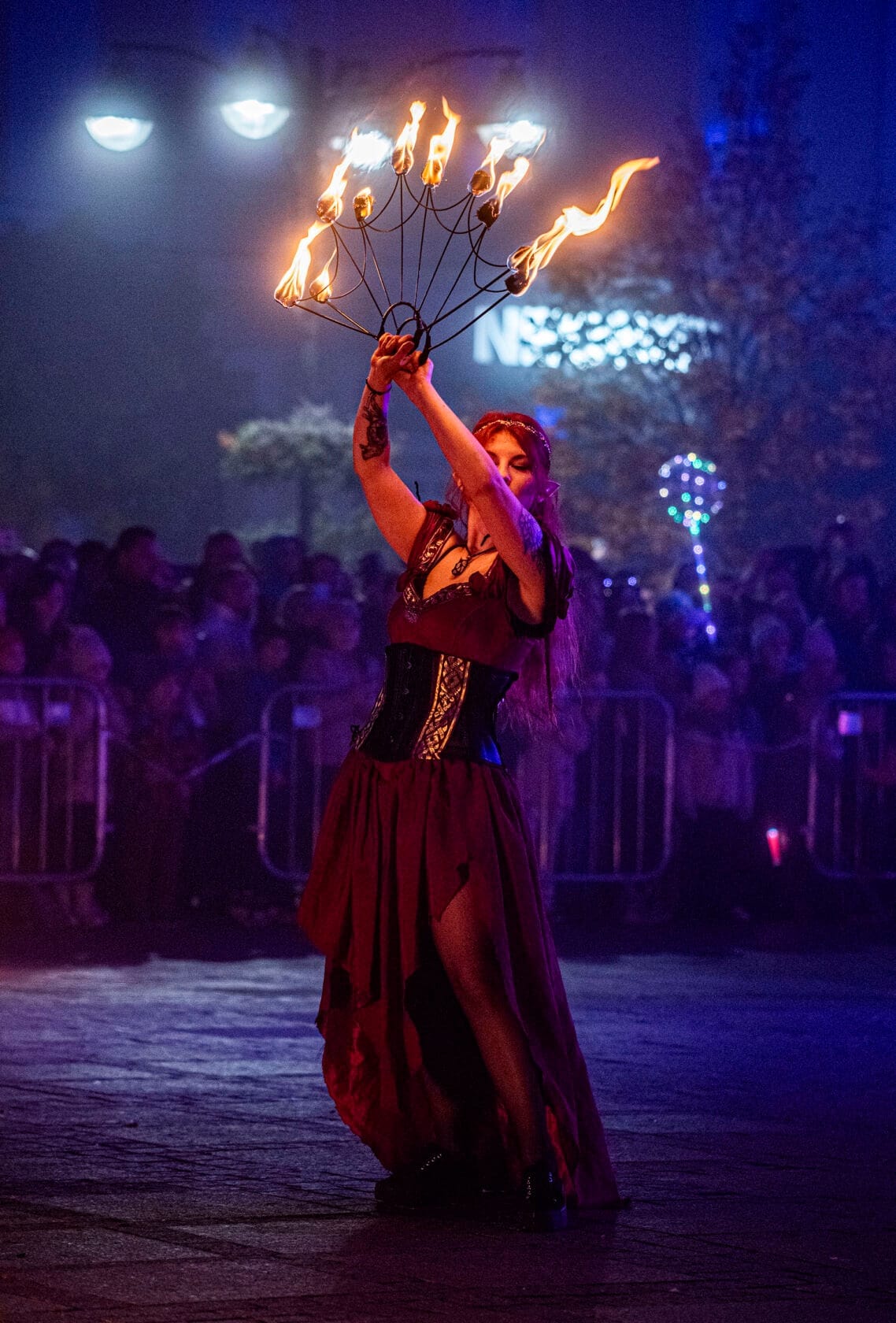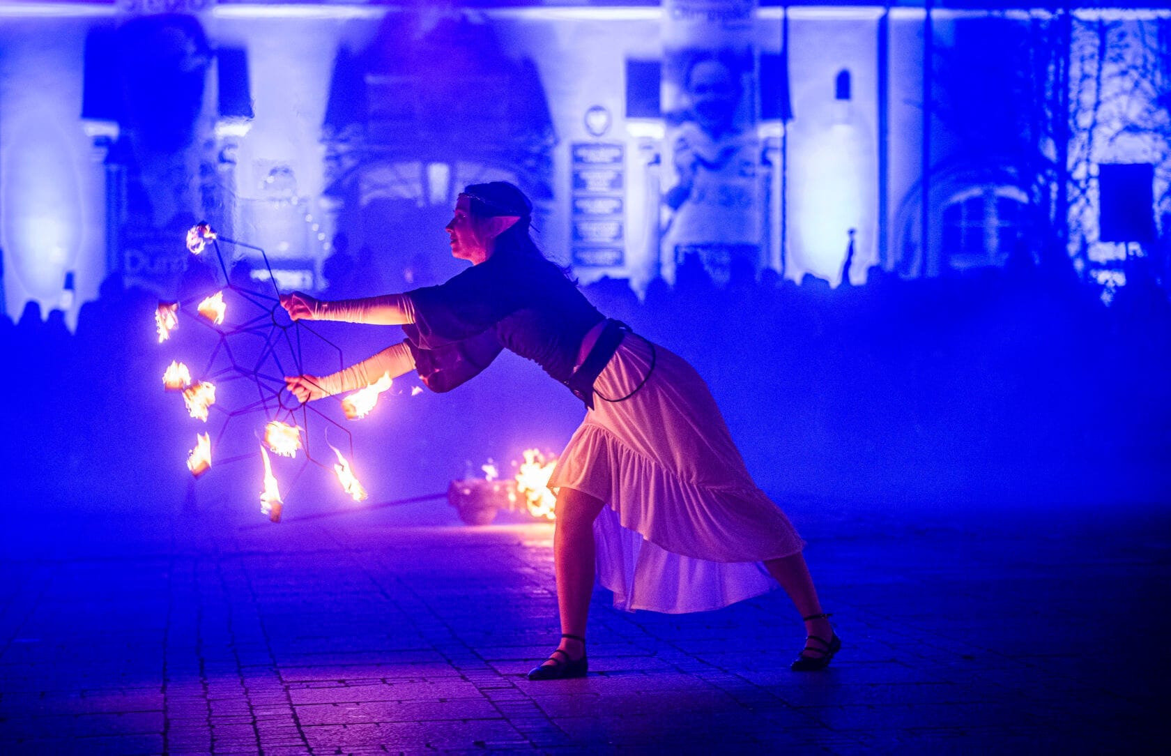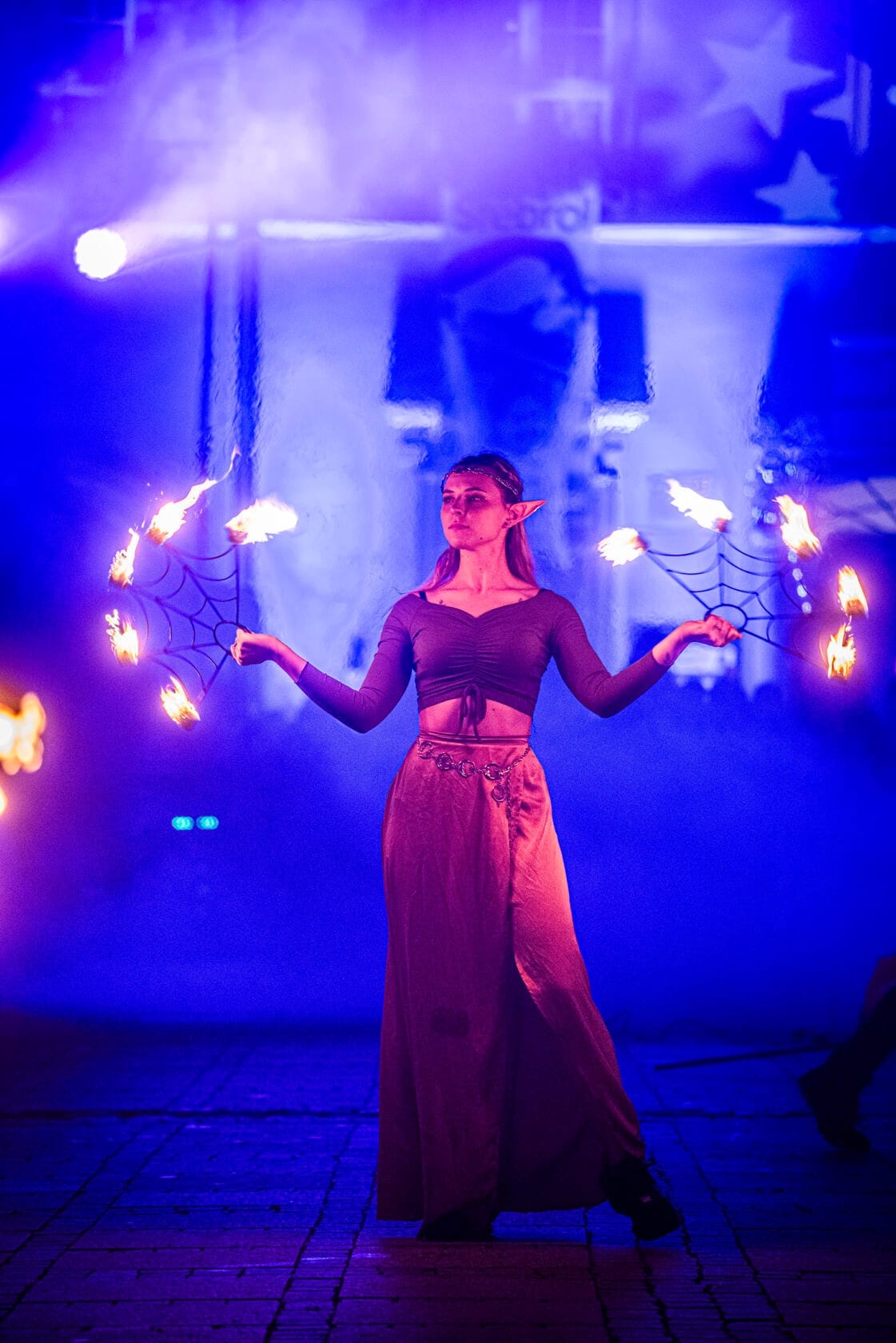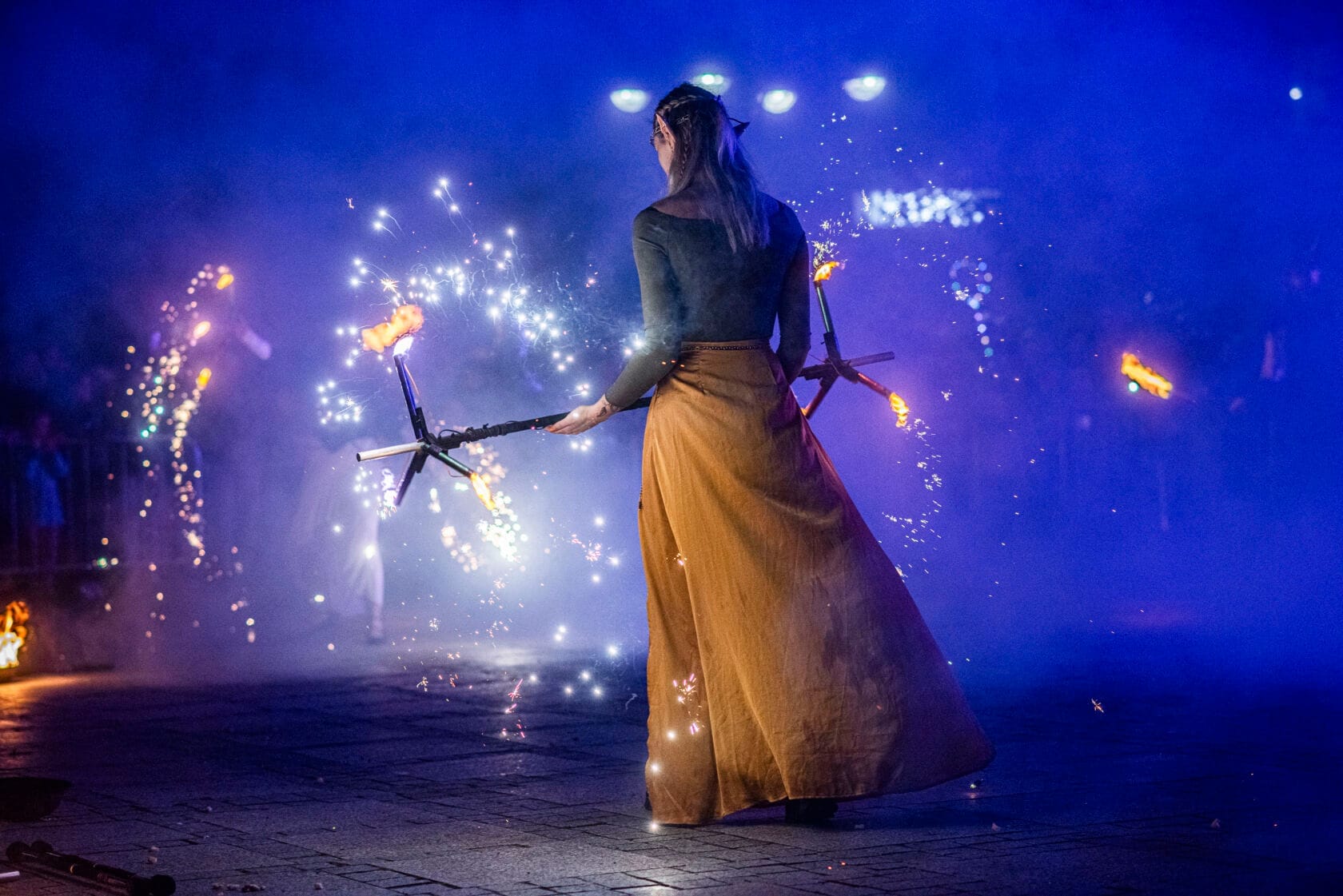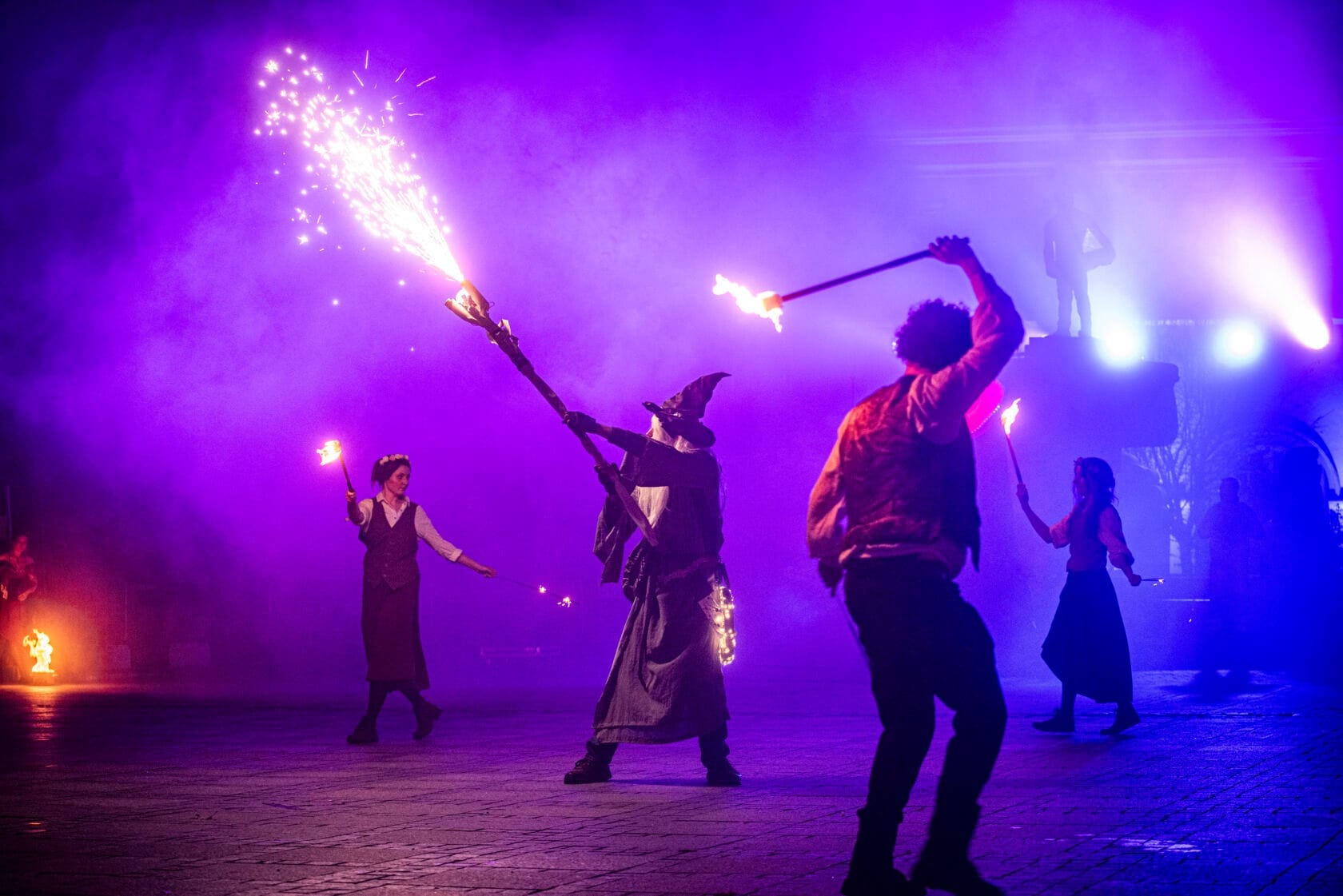 Kobiety tańczą z palącymi się pochodniami na scenie