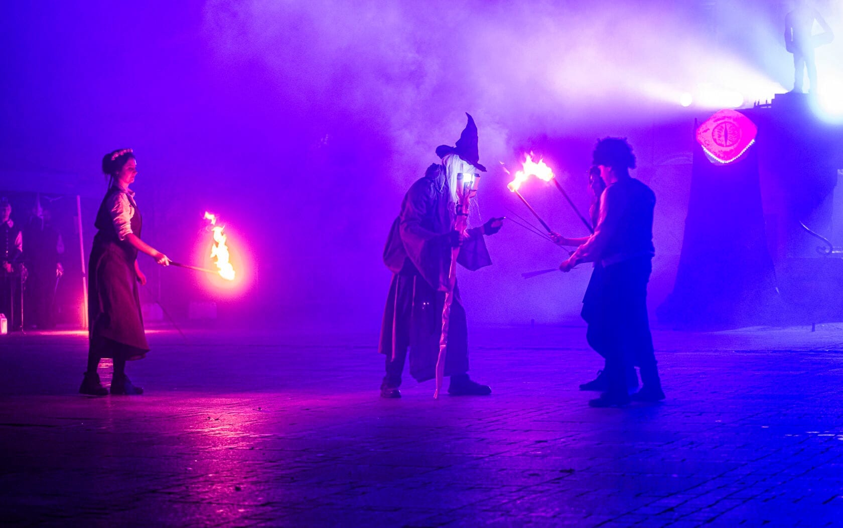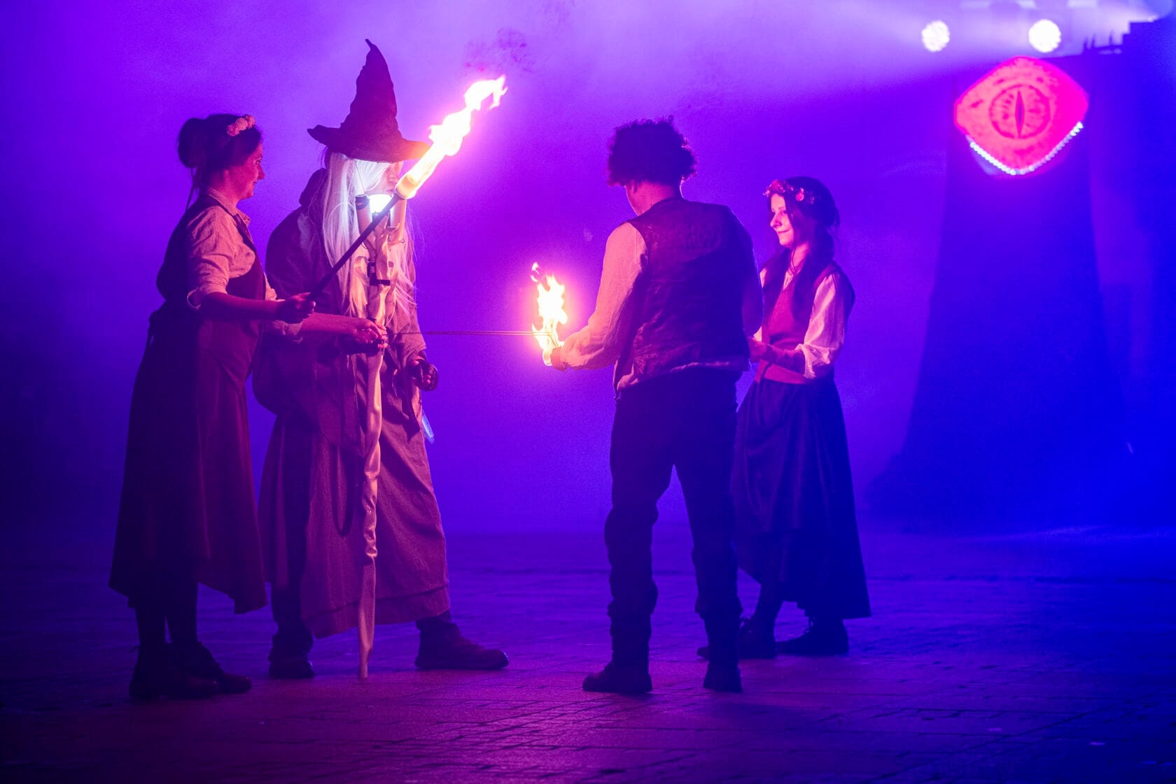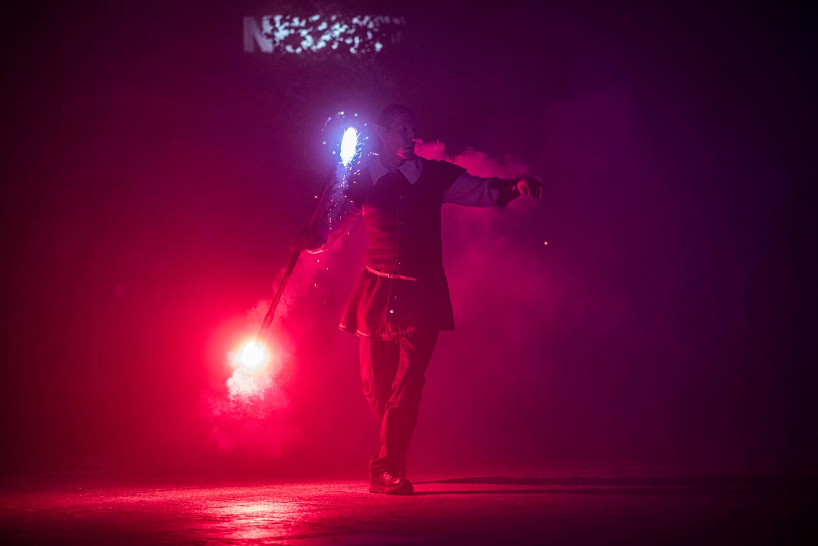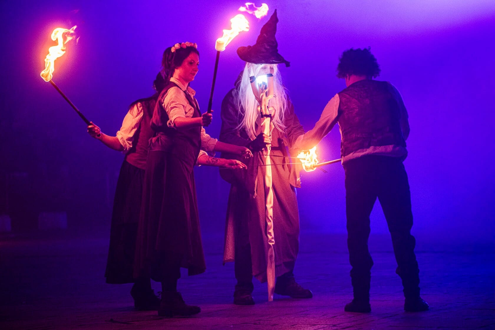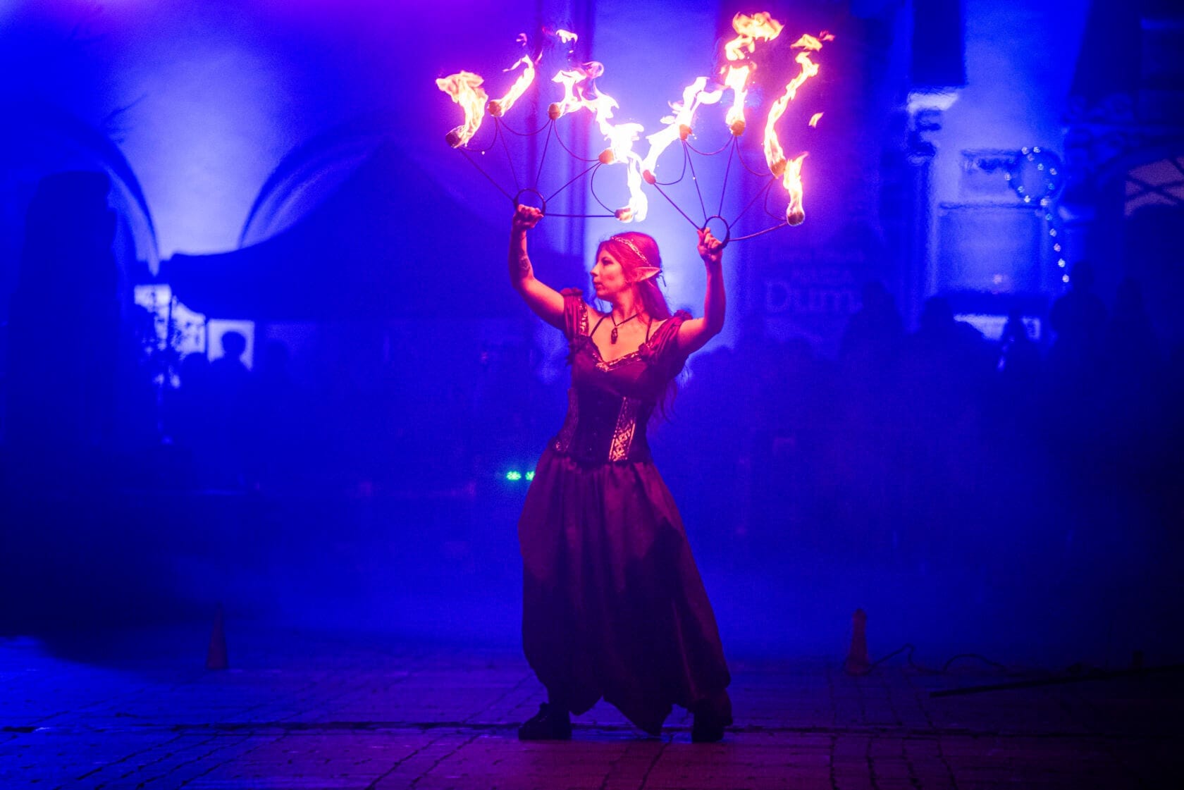 Kobiety tańczą z palącymi się pochodniami na scenie