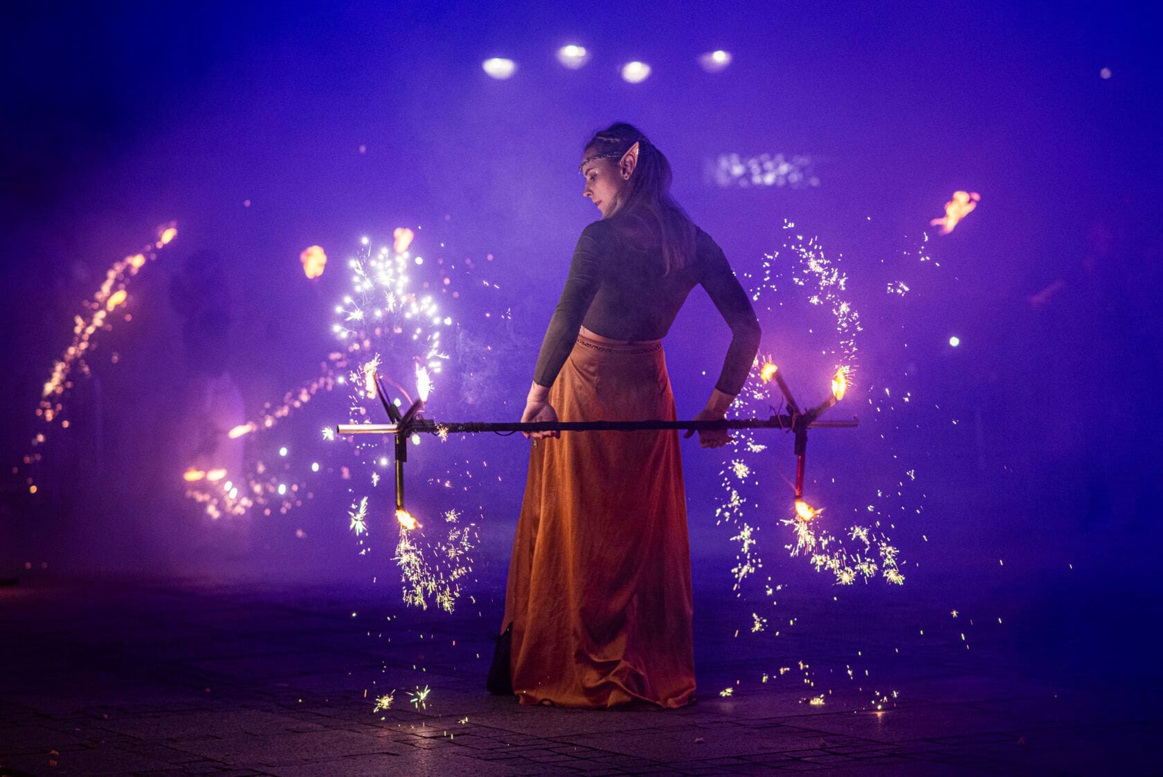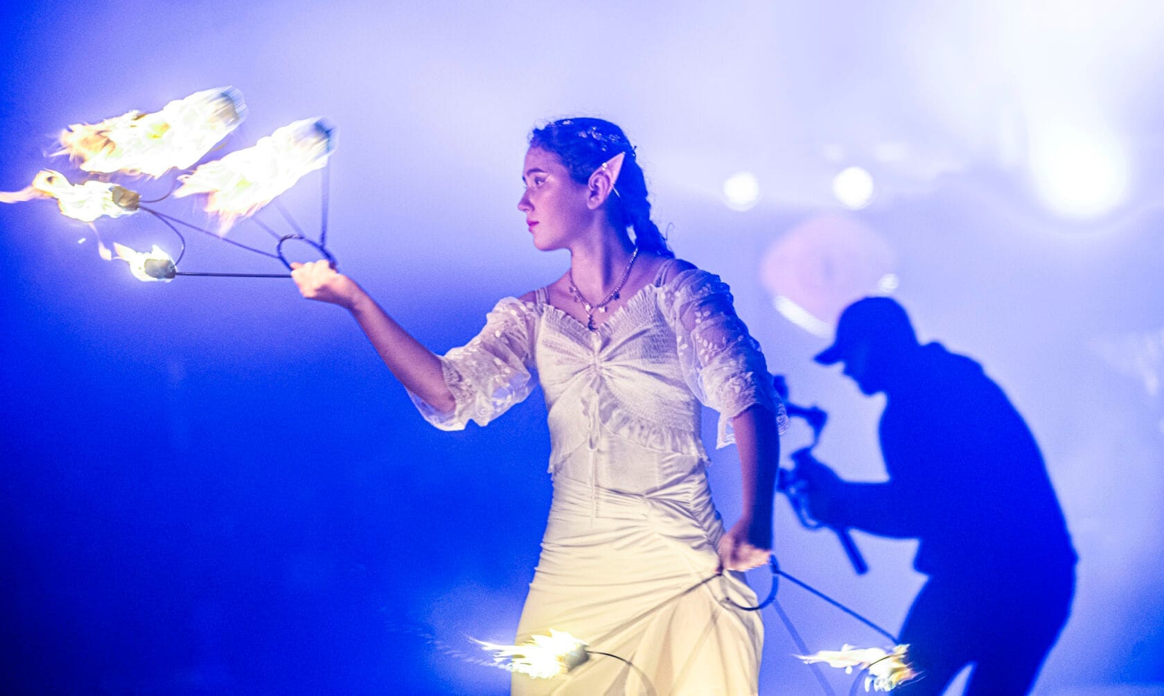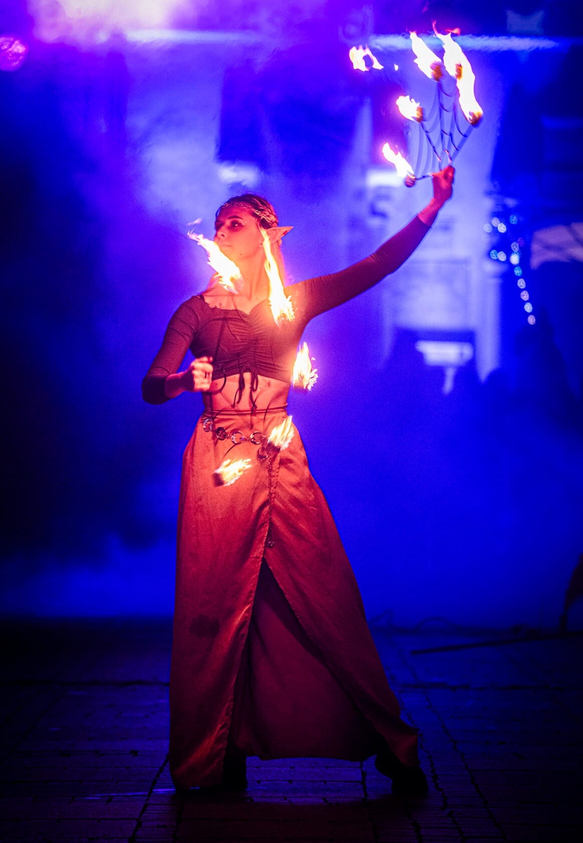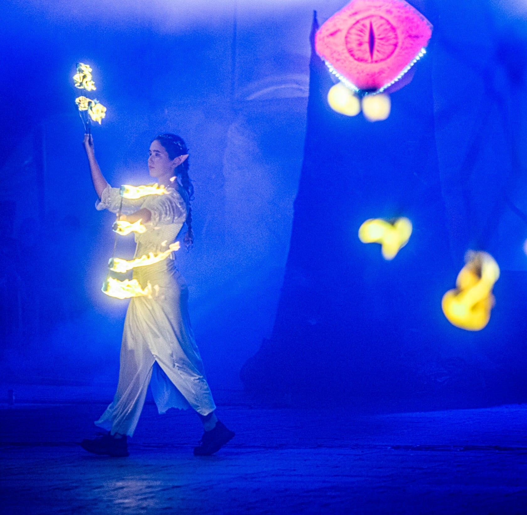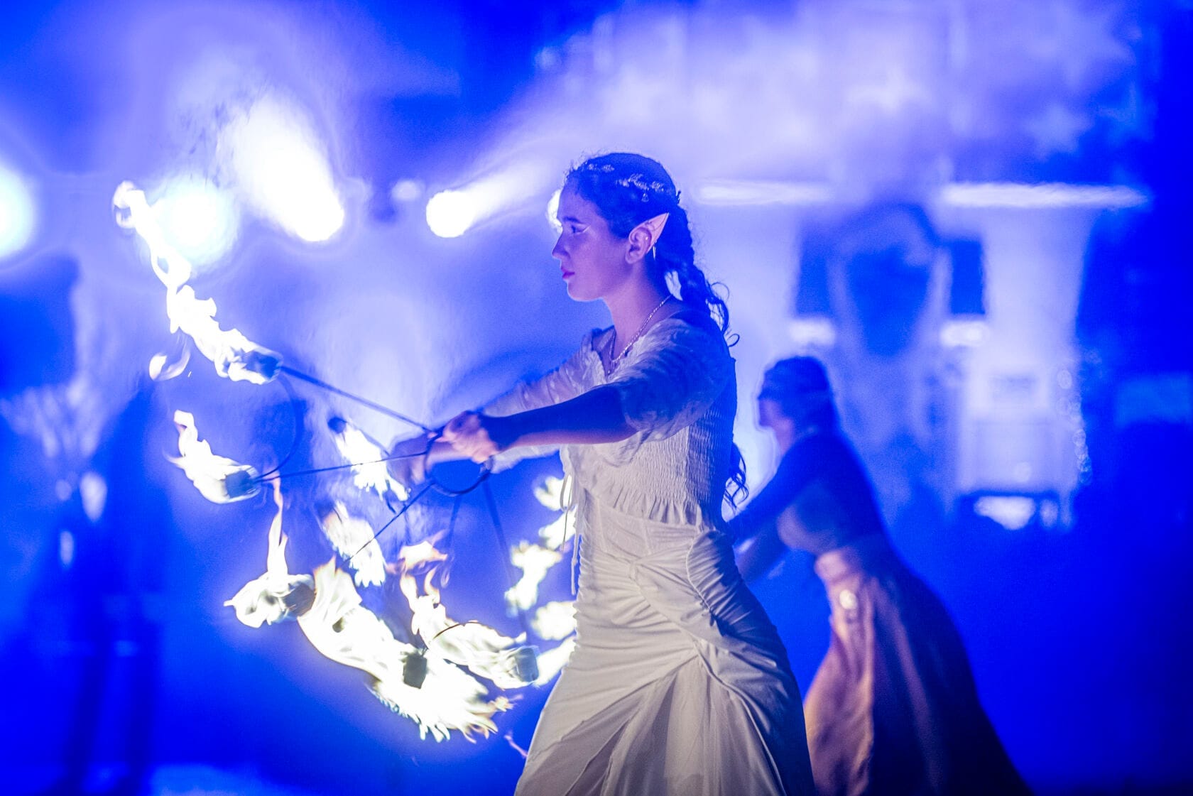 Kobiety tańczą z palącymi się pochodniami na scenie