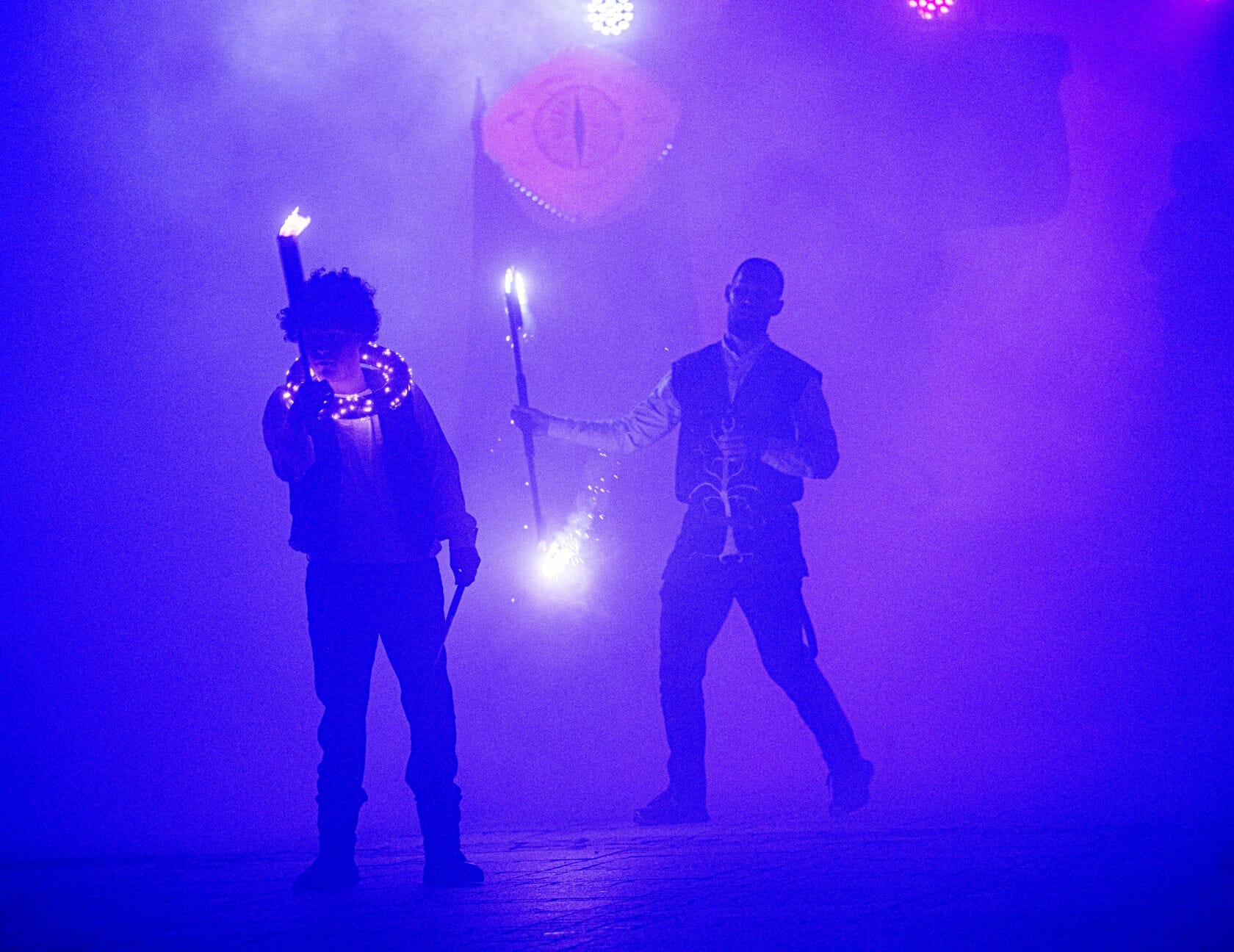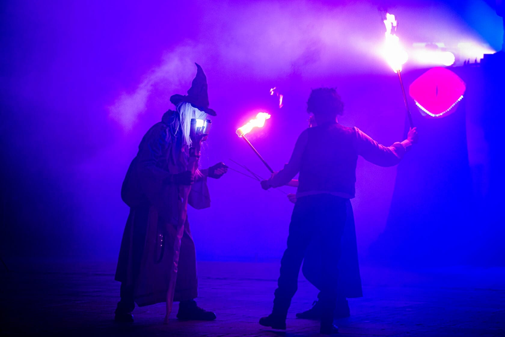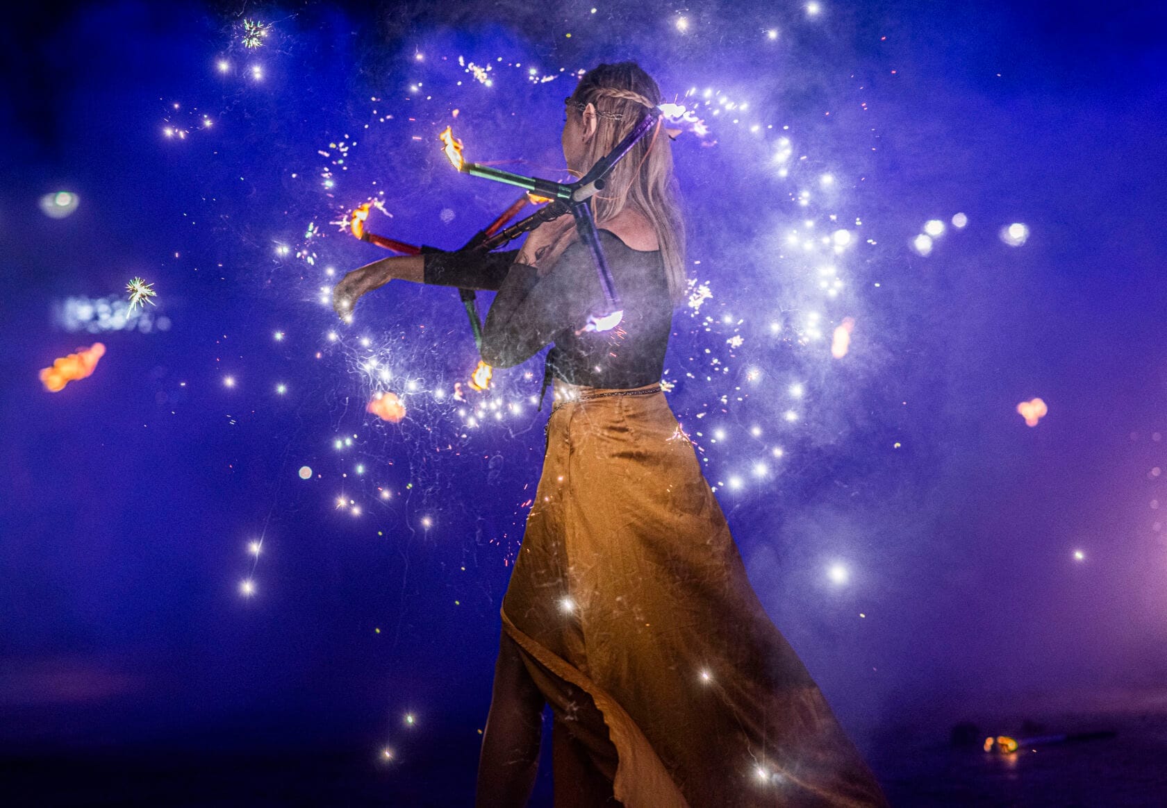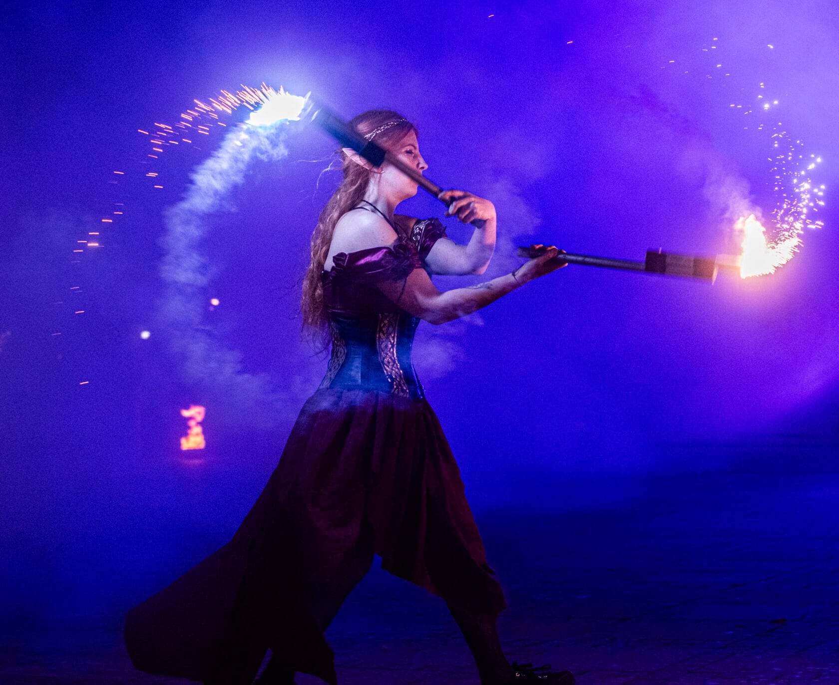 Kobiety tańczą z palącymi się pochodniami na scenie