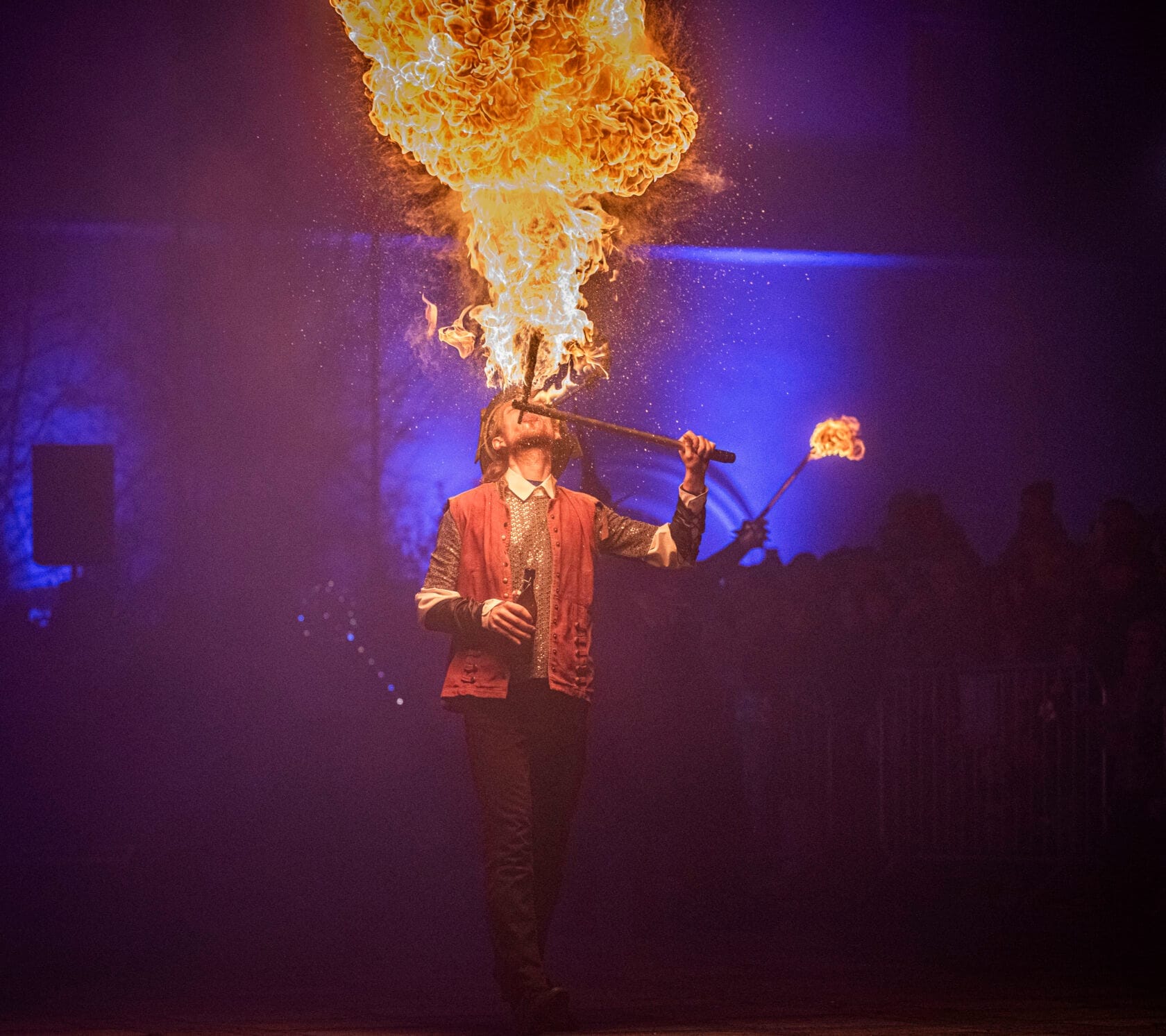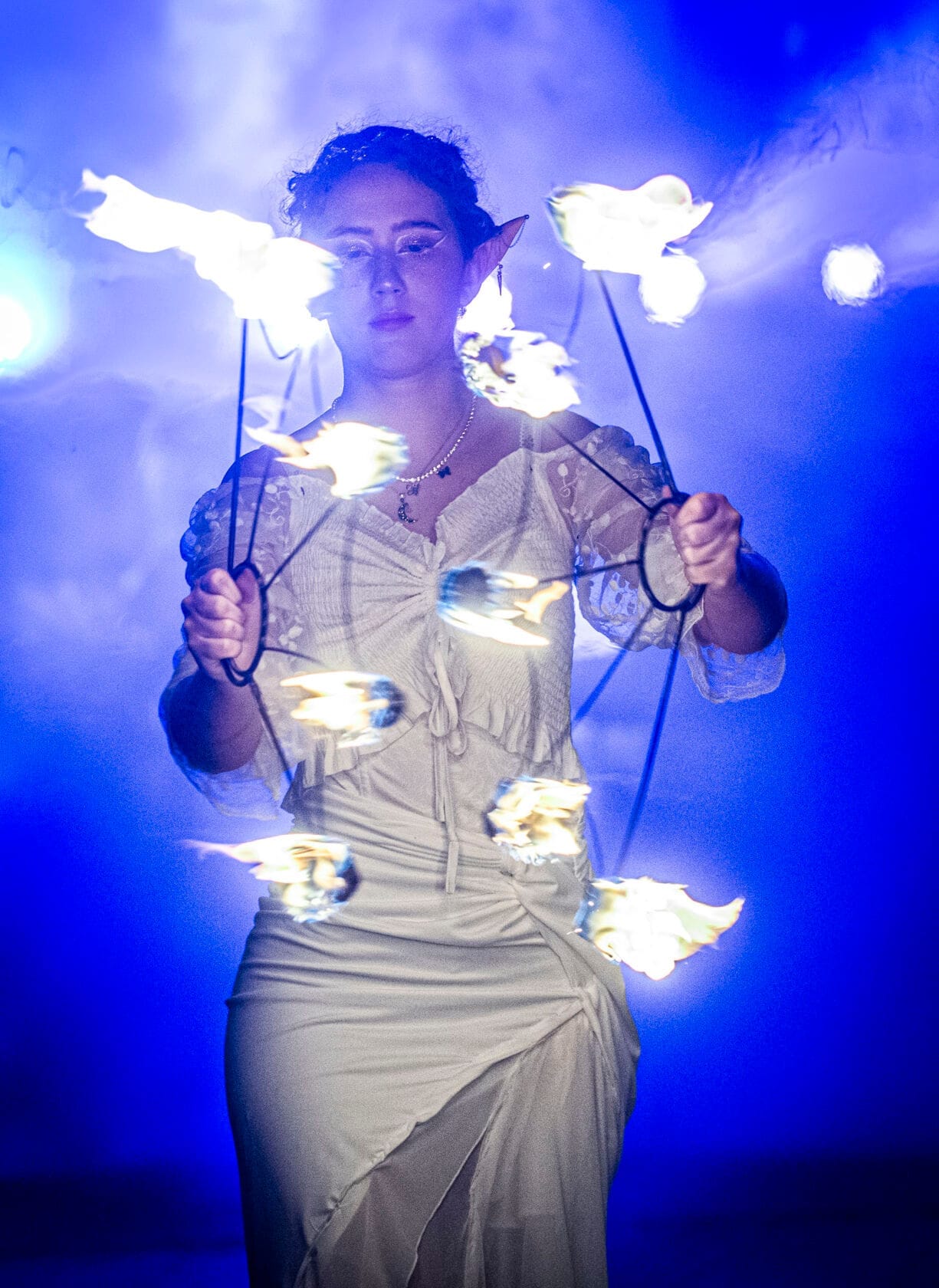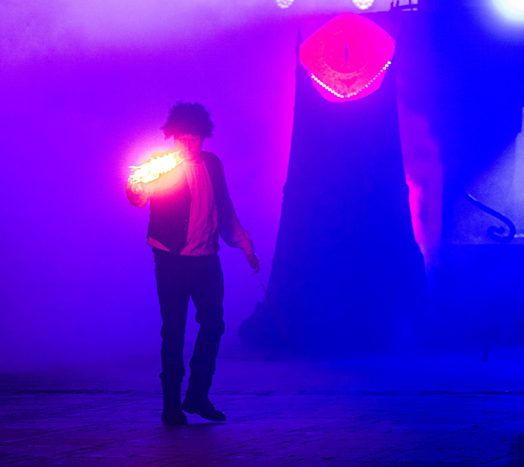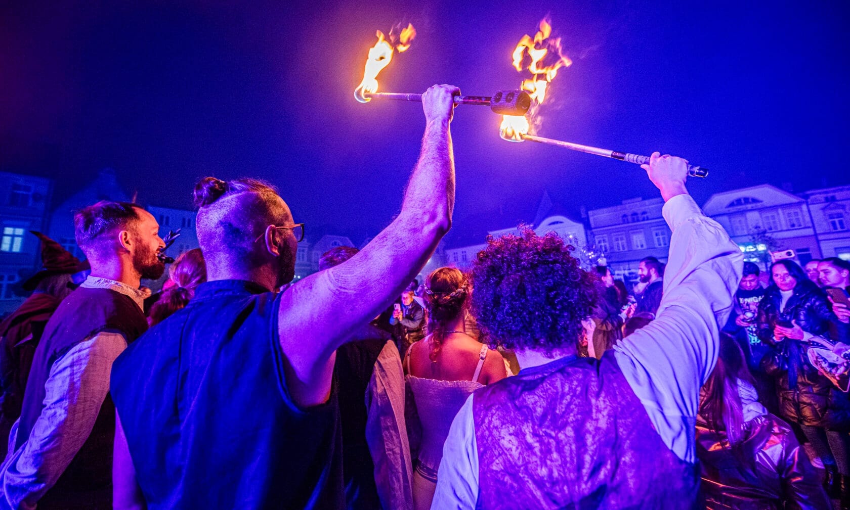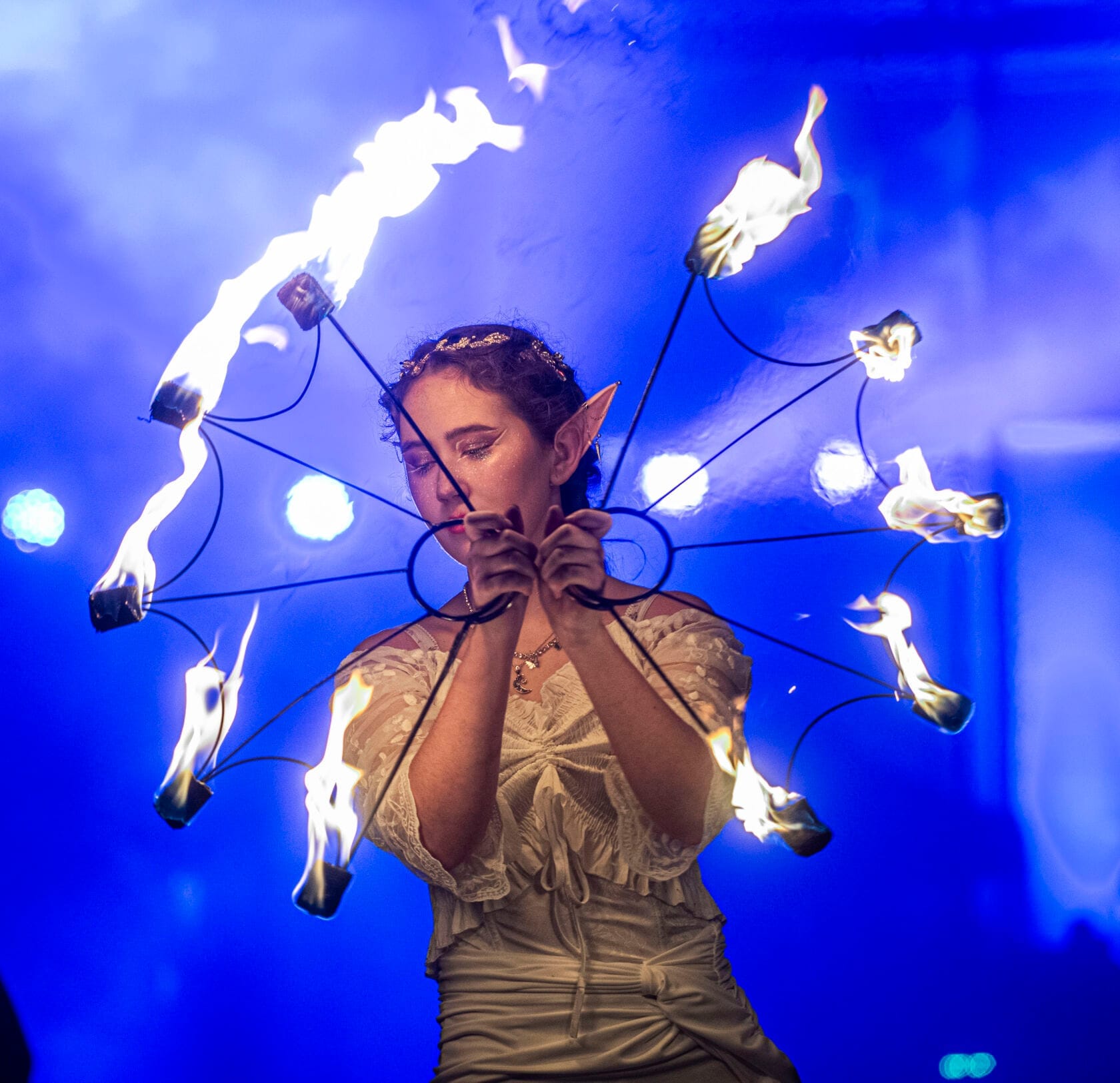 Kobiety tańczą z palącymi się pochodniami na scenie