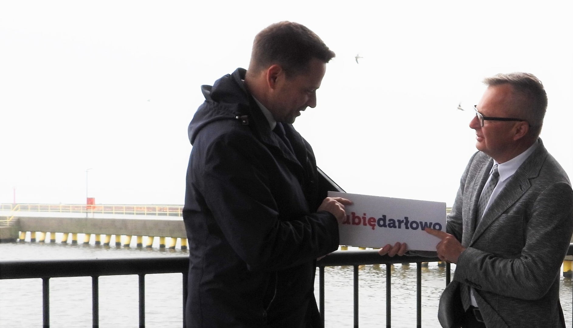 Dwóch mężczyzn trzymających napis 'lubiedarłowo' nad wodą