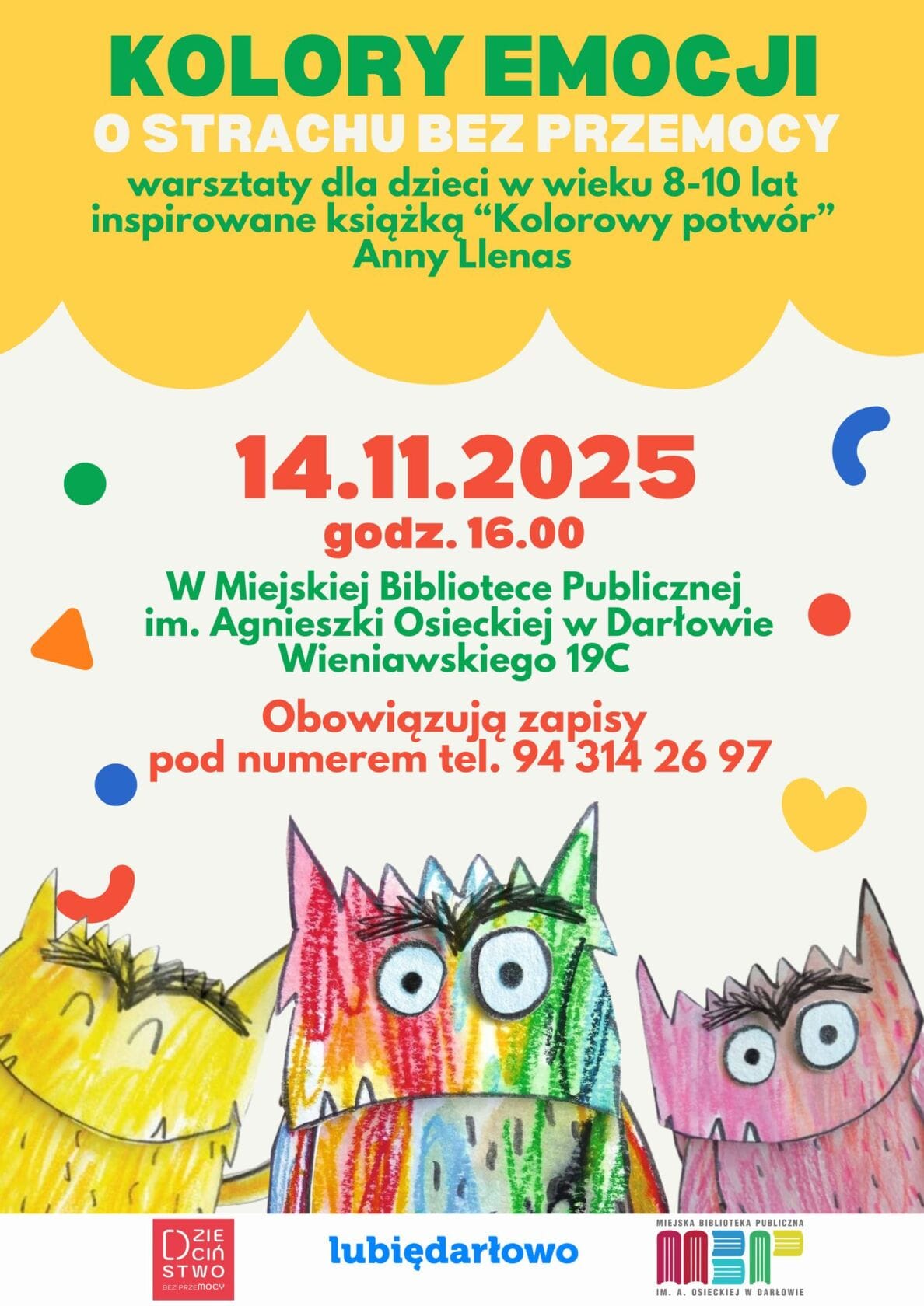 Miejska Biblioteka Publiczna zaprasza na warsztaty dla dzieci Kolory emocji, o strachu bez przemocy w ramach projektu dzieciństwo bez przemocy, warsztaty dla dzieci w wieku 8-10 lat, inspirowane książką ,,Kolorowy potwór” Anny Llenas.