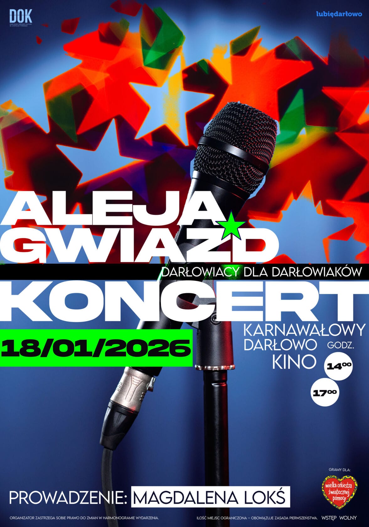 Darłowski Ośrodek Kultury zaprasza na koncert karnawałowy pt.: „Aleją Gwiazd”, który przygotują i zaśpiewają utalentowani mieszkańcy Darłowa oraz zaproszeni do projektu Goście. Koncertowi przyświecają dwa cele. Chęć tworzenia i dobrej zabawy a także zasilenie największej orkiestry dobrych serc na świecie jaką jest Wielka Orkiestra Świątecznej Pomocy.