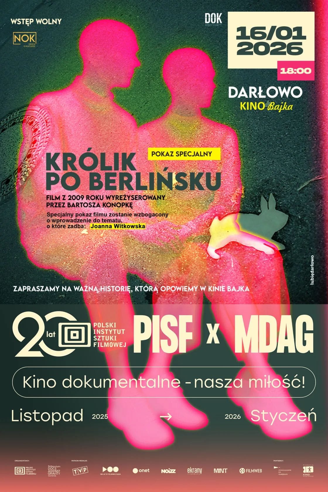 16 stycznia 2026 w kinie Bajka w Darłowie pokażemy film z 2009 roku wyreżyserowany przez Bartosza Konopkę pod tytułem: „Królik po Berlińsku”. Film w metaforyczny sposób opowiada historię muru berlińskiego i podziału Niemiec przez pryzmat królików, które żyły w strefie przygranicznej. To, że zamysł na pokazanie filmu z takiej perspektywy się udał – już wiemy. Tytuł ten zdobył międzynarodowe uznanie i przyniósł rozgłos Konopce. Był także wielokrotnie nagradzany i nominowany do Oscara w kategorii film dokumentalny.