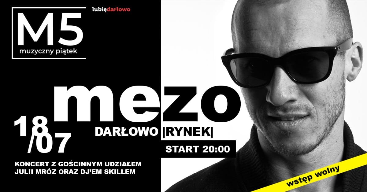 Śladem lat ubiegłych zapraszamy Państwa na kontynuację muzycznego cyklu pt. “Muzyczne Piątki w Darłowie”. W tym roku świętujemy jubileusz “80 lecia polskiego Darłowa” i z tej okazji zapraszamy na koncerty LEGEND polskiej muzyki. Na drugi Muzyczny Piątek M5 zaprosiliśmy dla Państwa legendę polskiej muzyki popowej i hip-hopowej: MEZO. Na koncercie w Darłowie Artysta występuje wspólnie z wokalistką JULIĄ MRÓZ i DJ SKILLEM