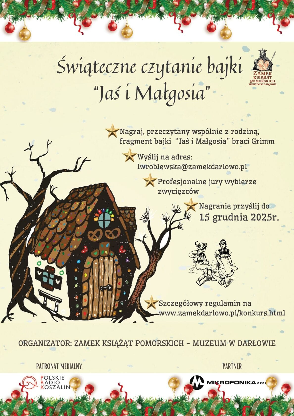 Zamek Książąt Pomorskich – Muzeum w Darłowie zaprasza do udziału w konkursie świątecznym „Rodzinne czytanie bajki Jaś i Małgosia”. Konkurs skierowany jest do mieszkańców powiatu sławieńskiego i jest organizowany jako wydarzenie towarzyszące wystawie „Baśniowy Zakątek – W piernikowej chacie”.