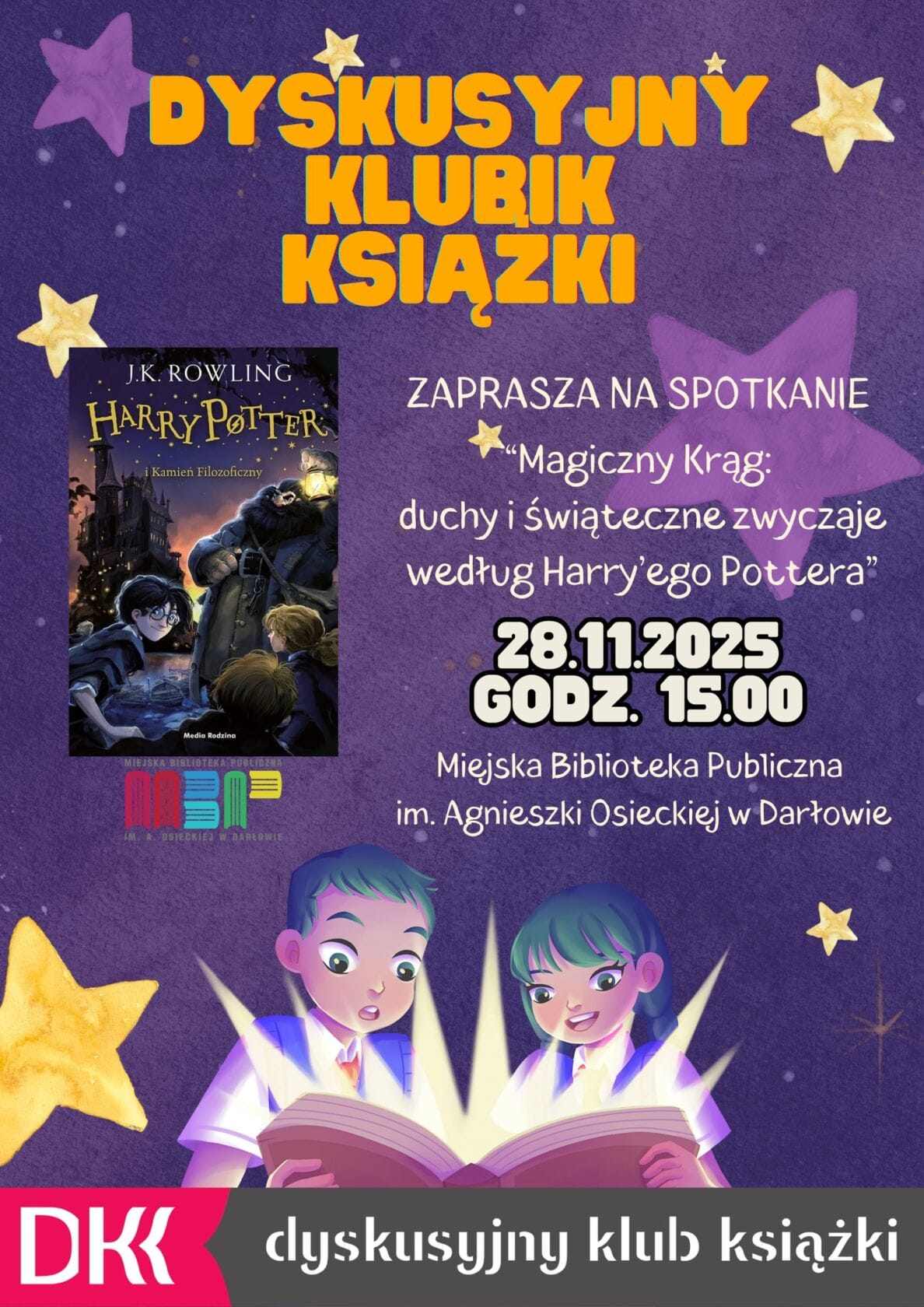 Zapraszamy na Dyskusyjny Klubik Książki!Tym razem przeniesiemy się do magicznego świata i poznamy duchowe zwyczaje z przyjęcia u Prawie Bezgłowego Nicka, a także odkryjemy czarodziejskie tradycje świąteczne. Czeka nas pełne magii spotkanie, rozmowy i świetna zabawa!Do zobaczenia w bibliotece!