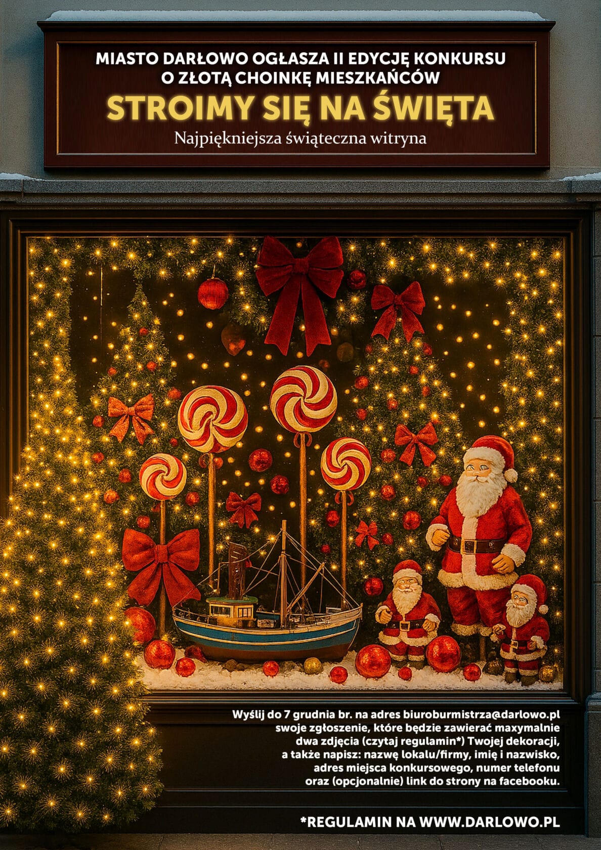 Miasto Darłowo ogłasza II edycję konkursu „Stroimy się na święta” czyli plebiscytu na najpiękniejszą witrynę bożonarodzeniową! Mieszkańcy zadecydują do kogo trafi w tym roku złota choinka. Prowadzisz sklep? Posiadasz zakład? Firmę? A może masz restaurację lub Twój lokal użytkowy stoi otworem dla mieszkańców i stanowi ważny też dla oka – punkt na mapie Darłowa? Pokaż, że u Ciebie też czuć świąteczny klimat! Celem konkursu jest podniesienie jakości estetyki w przestrzeni publicznej w okresie poprzedzającym Święta Bożego Narodzenia, a także zaangażowanie się lokalnych przedsiębiorców w kształtowanie pozytywnego wizerunku miasta. To również forma promocji lokalnych działalności gospodarczych.