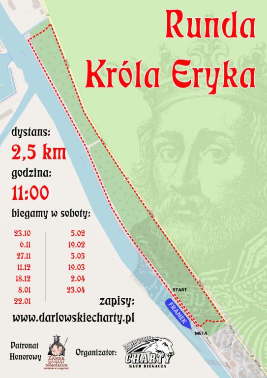 Klub Biegacza Darłowskie Charty zaprasza do udziału w kolejnej edycji Rundy Króla Eryka. Spotkania będą odbywać się w soboty o godzinie 11:00 w Parku Conrada przy Franku. Do pokonania 2,5 kilometra biegiem, marszem lub z kijkami. Na mecie na każdego uczestnika czekać będzie gorąca herbata.