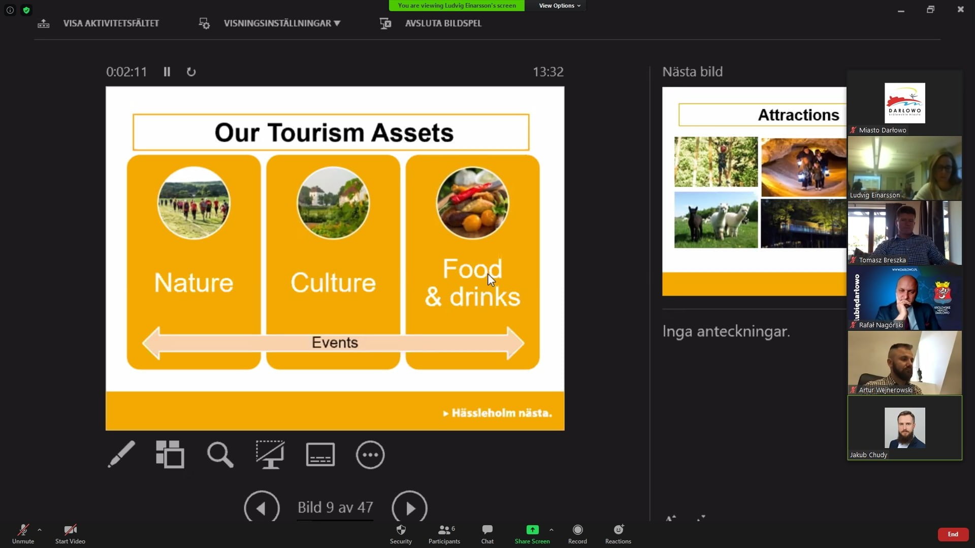 Z ramienia Gminy Hassleholm o polach do współpracy mówili: p. Anna Nordstrand – odpowiedzialna za turystykę, która podsumowała tamtejszy sezon turystyczny, zaznaczając przy tym, że jednym z głównych celów ich turystyki zagranicznej są właśnie mieszkańcy Polski. –Covid nie może pokrzyżować nam planów. Musimy się dostosować do obecnie panujących warunków. Skupiamy się w głównej mierze na prostej, bezpiecznej, ale i wygodnej ofercie dla naszych przyszłych gości. Regeneracja, odzyskiwanie sił jest tutaj kluczowe w jej budowaniu.