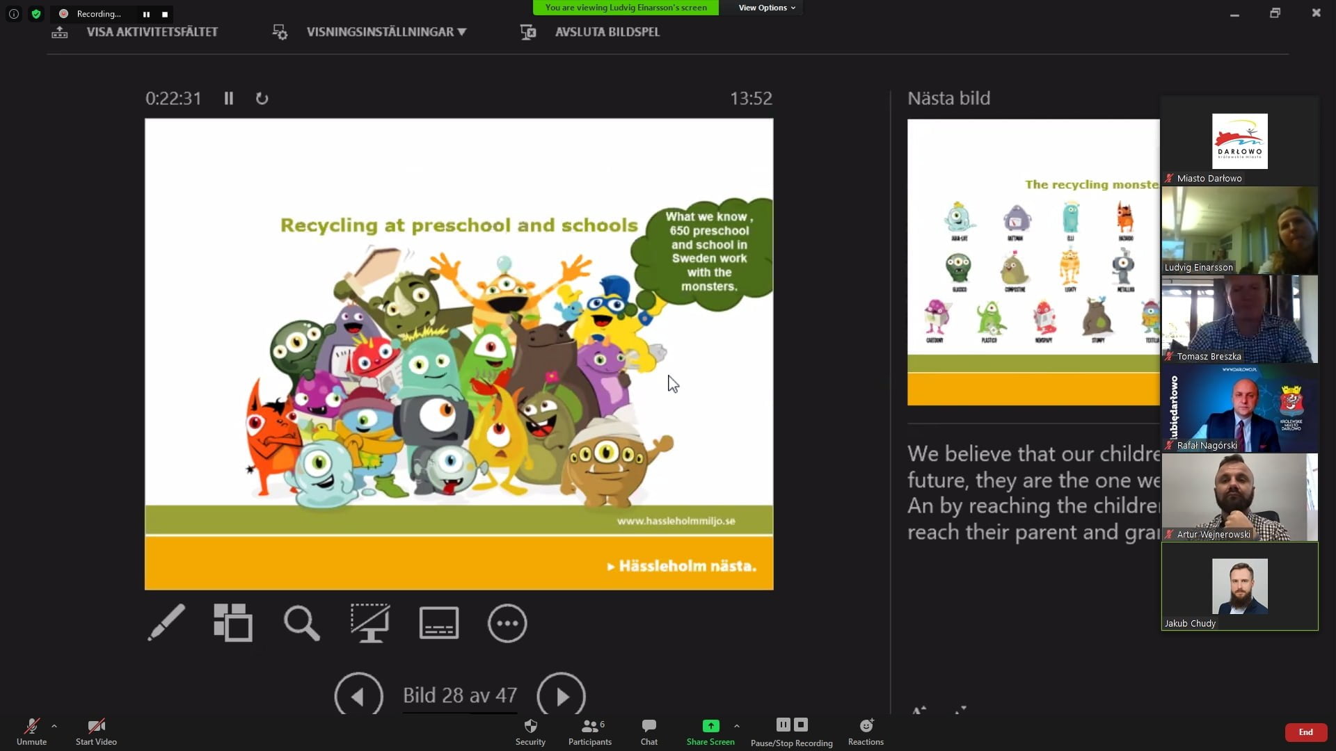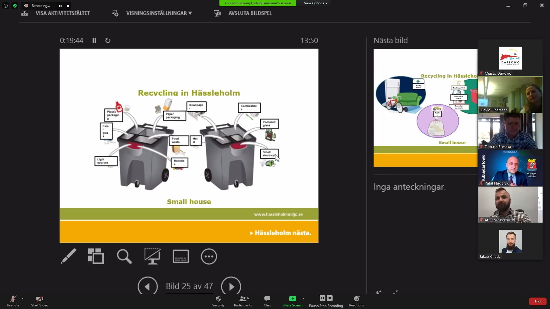 Na koniec prezentację wygłosiła Matilda Ehnberg, odpowiedzialna właśnie za ochronę środowiska – odpowiednik naszego Miejskiego Przedsiębiorstwa Gospodarki Komunalnej. Hassleholm należy do najaktywniejszych pod względem działań na rzecz ochrony środowiska gmin w Szwecji. Nie chodzi tu jedynie o wprowadzenie zwyczaju sortowania śmieci we wszystkich domach, odtworzenie struktury jeziora Finjasjó, lecz także o aktywną pomoc dla przedsiębiorstw, które zdecydują się odstąpić od szkodliwej dla środowiska działalności