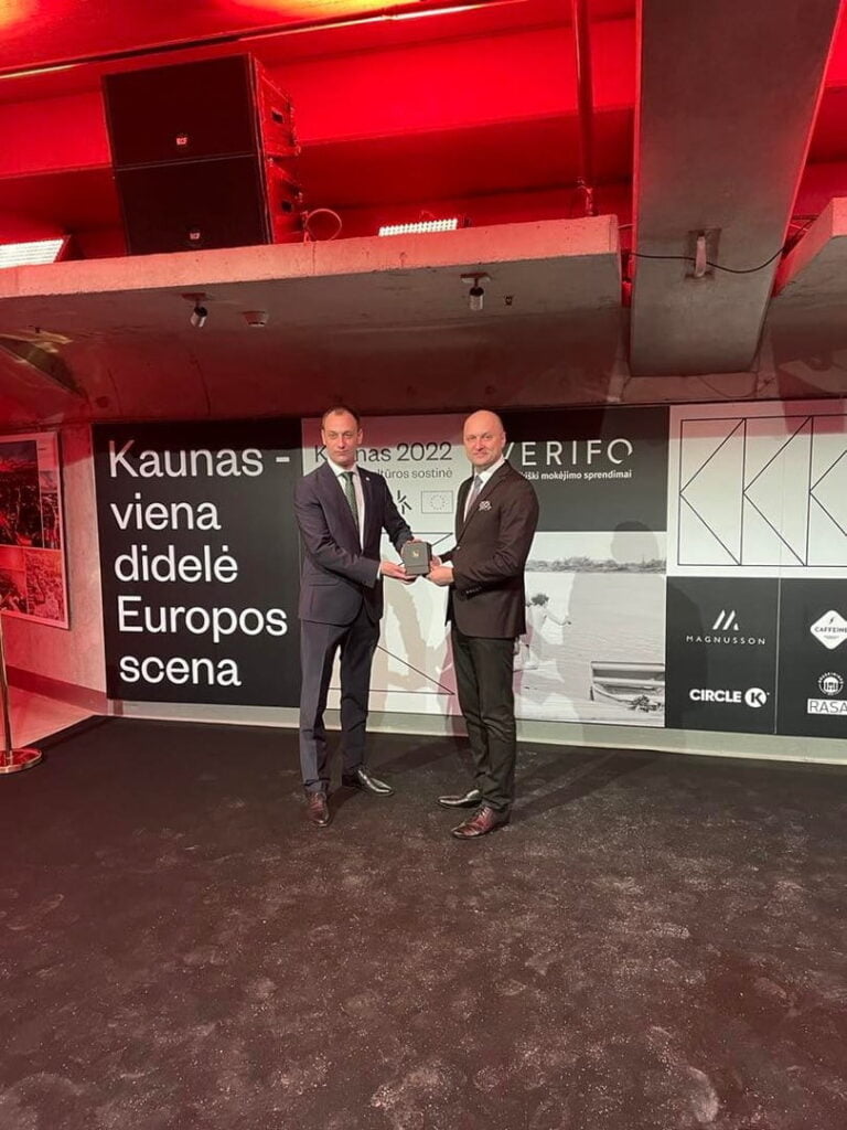– Jesteśmy małym miastem, ale kochamy kulturę i cieszymy się, że możemy nawiązać kontakty z wielkimi europejskimi ośrodkami – mówił Rafał Nagórski, zastępca burmistrza przekazując gratulacje i medal z okacji 75-lecia Polskiego Darłowa – Visvaldasowi Matijošaitisowi, burmistrzowi Kowna.