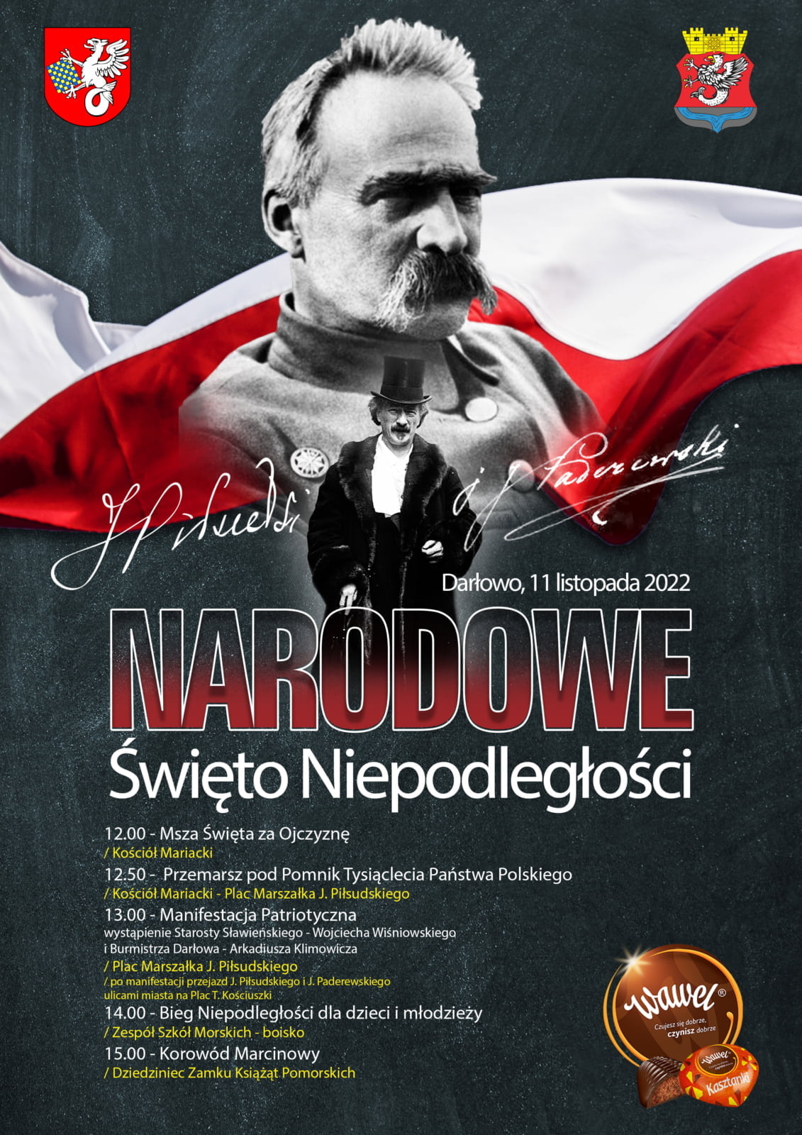 o godz. 13.00 – Manifestacja Patriotyczna (wystąpienie Starosty Sławieńskiego – Wojciecha Wiśniowskiego i Burmistrza Darłowa – Arkadiusza Klimowicza / Plac Marszałka J. Piłsudskiego. Manifestację Patriotyczną zwieńczy symboliczny pokaz sztucznych ogni i flar dymnych w barwach narodowych. Po manifestacji przejazd J. Piłsudskiego i J. Paderewskiego ulicami miasta na Plac T. Kościuszki). Spacerowicze będą mogli uwiecznić się z nimi na wspólnej fotografii.