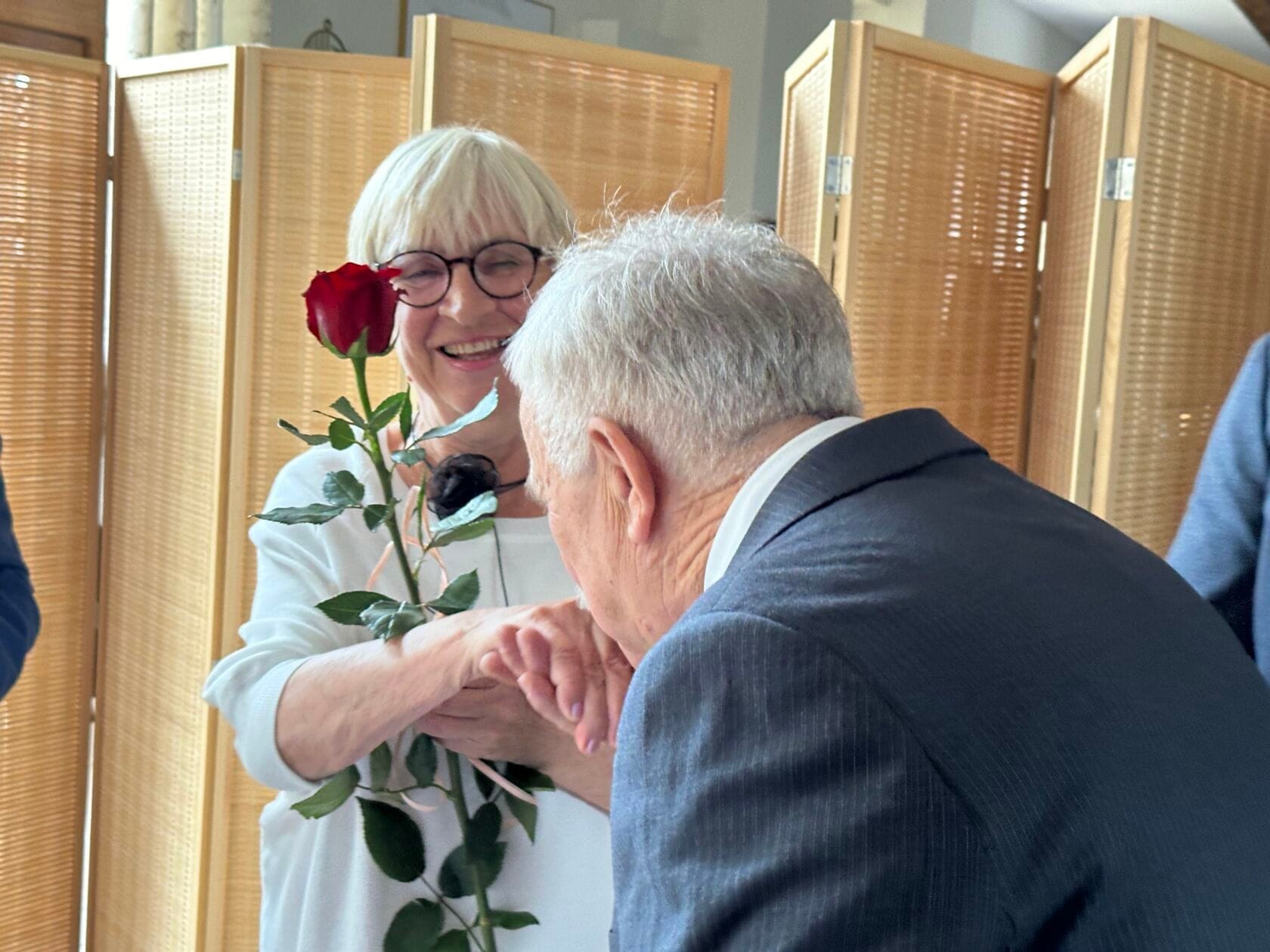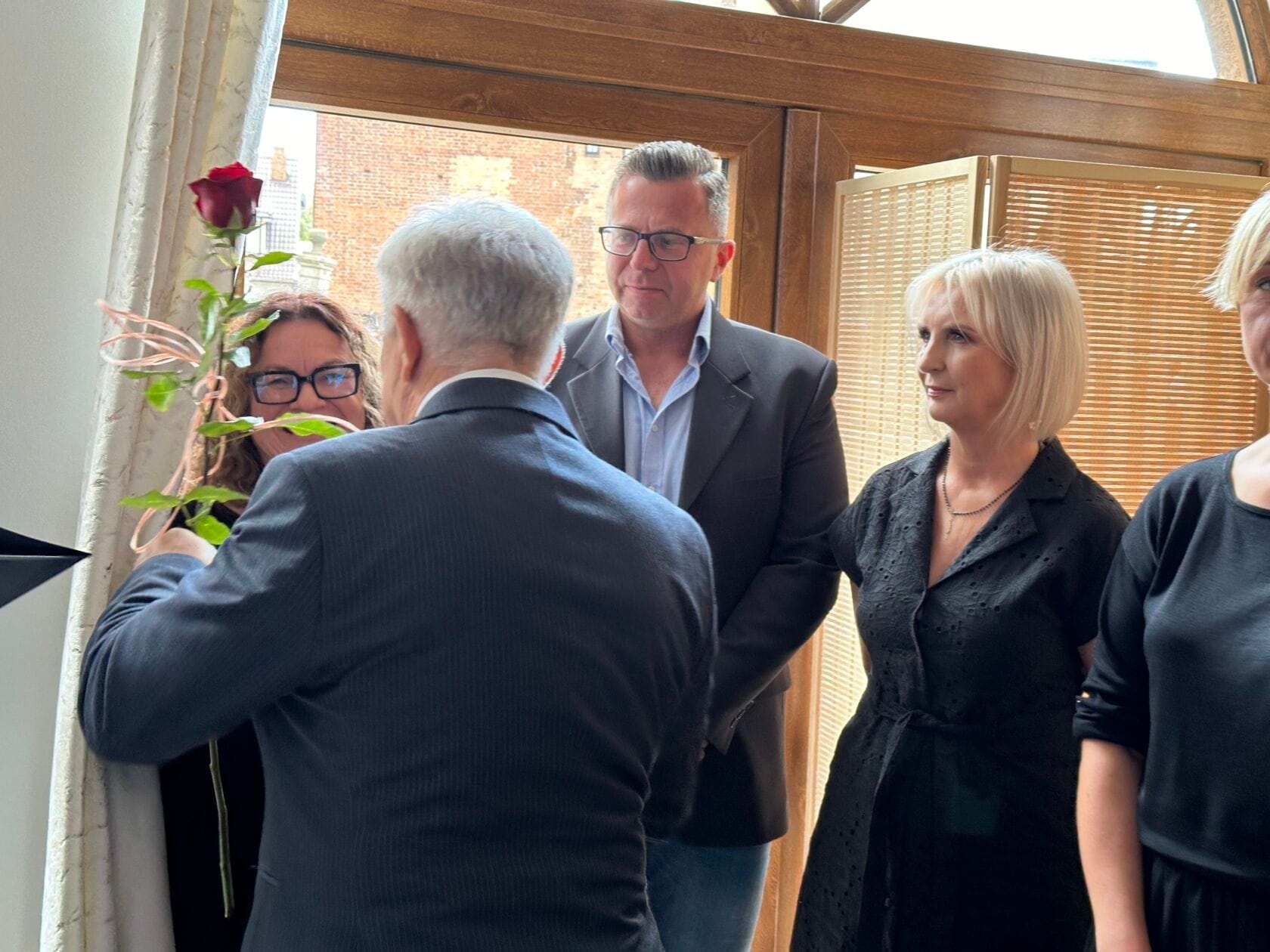 Grupa osób z certyfikatami i różami, świętuje sukces.