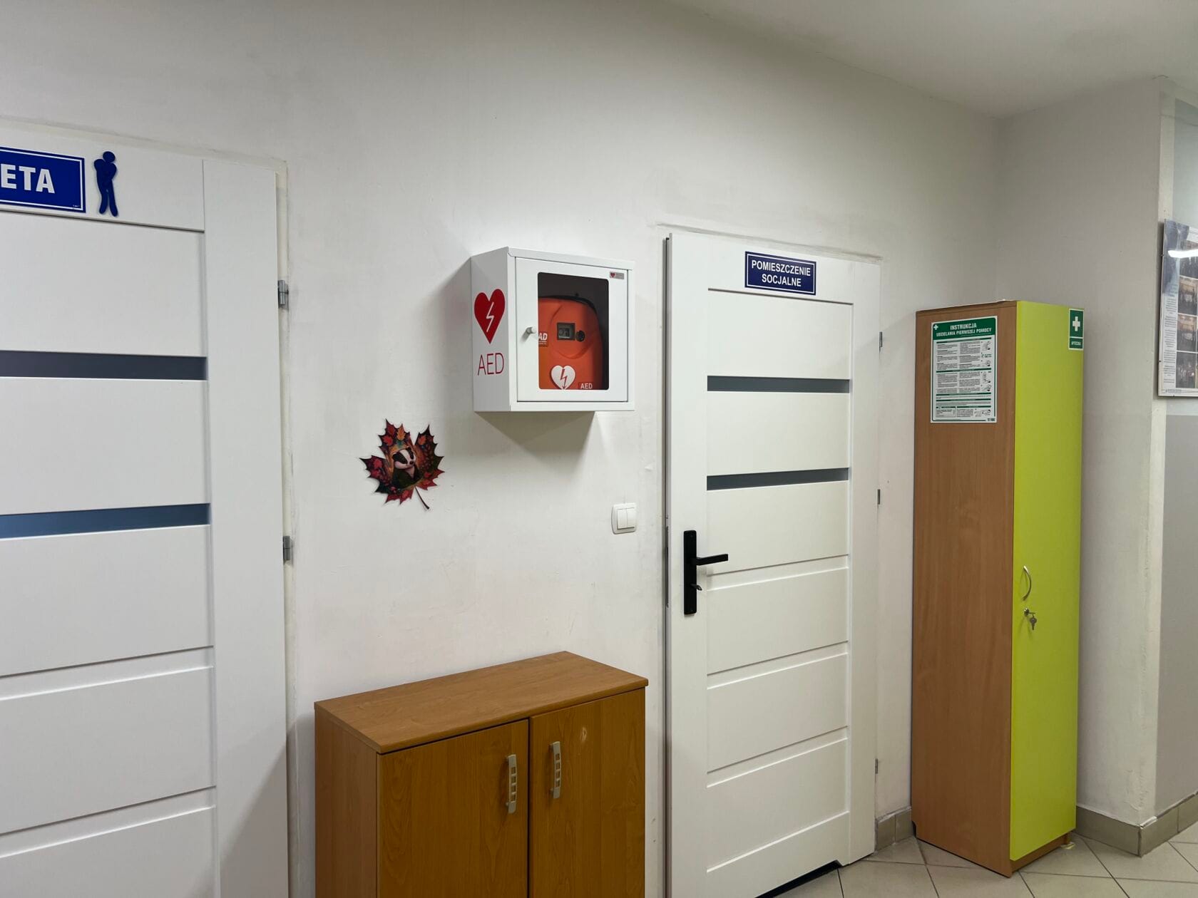 Najważniejsza informacja: w budynku, w ogólnodostępnym miejscu świetlicy, został na stałe zamontowany profesjonalny defibrylator AED z przełącznikiem pediatrycznym, umieszczony w szafce dźwiękowo-świetlnej.