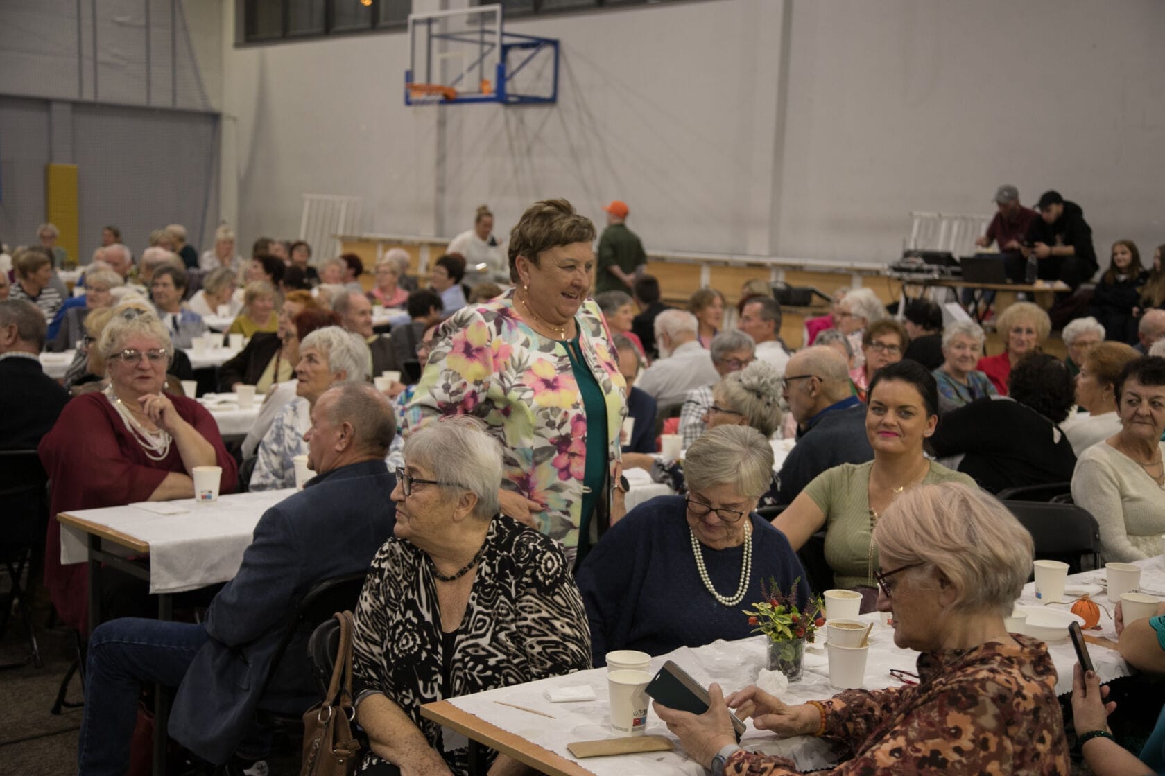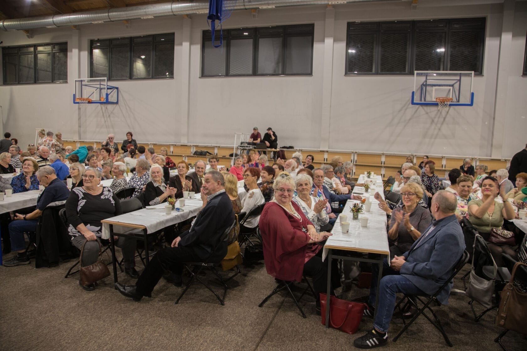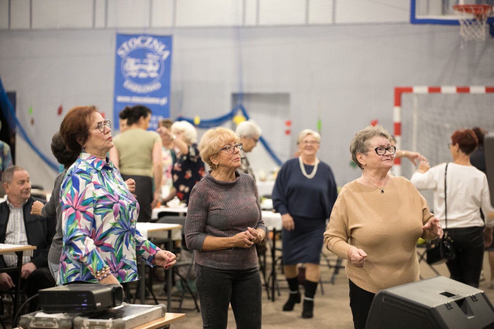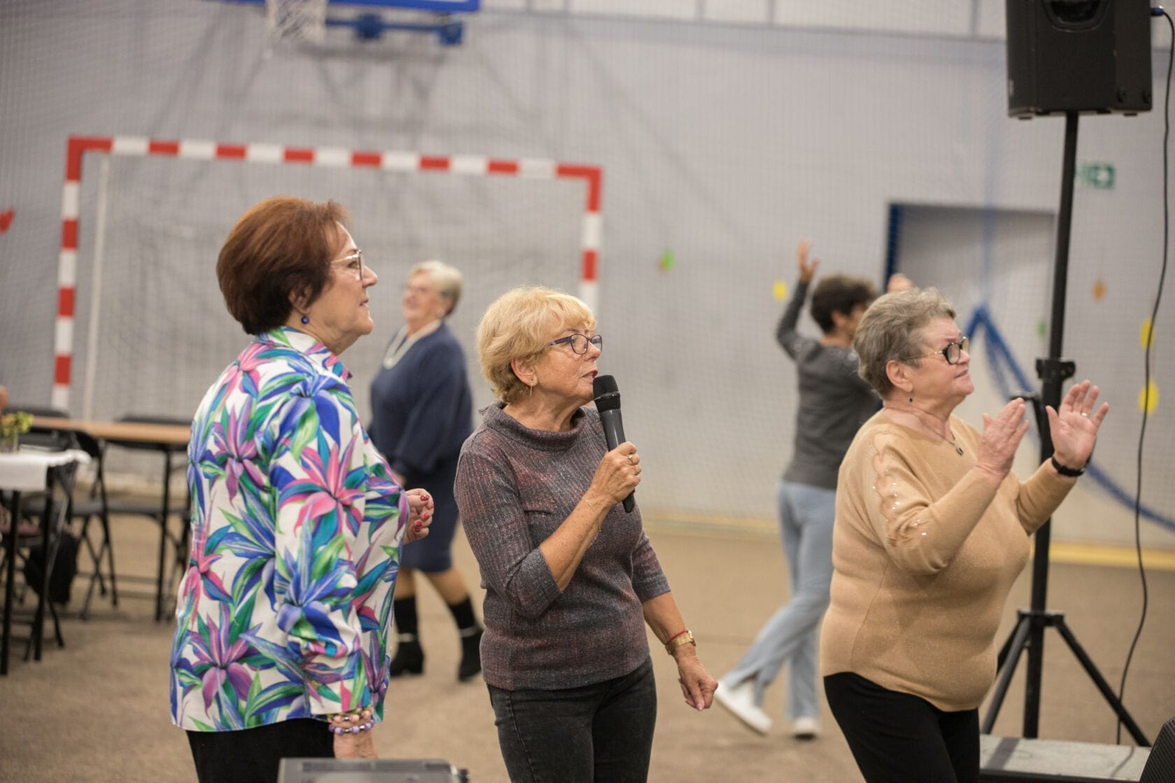Spotkanie społeczności starszych osób w sali gimnastycznej