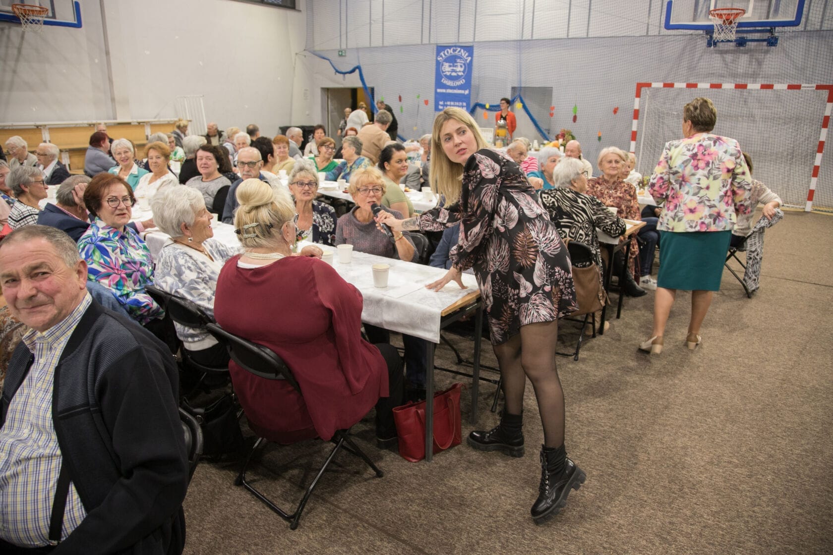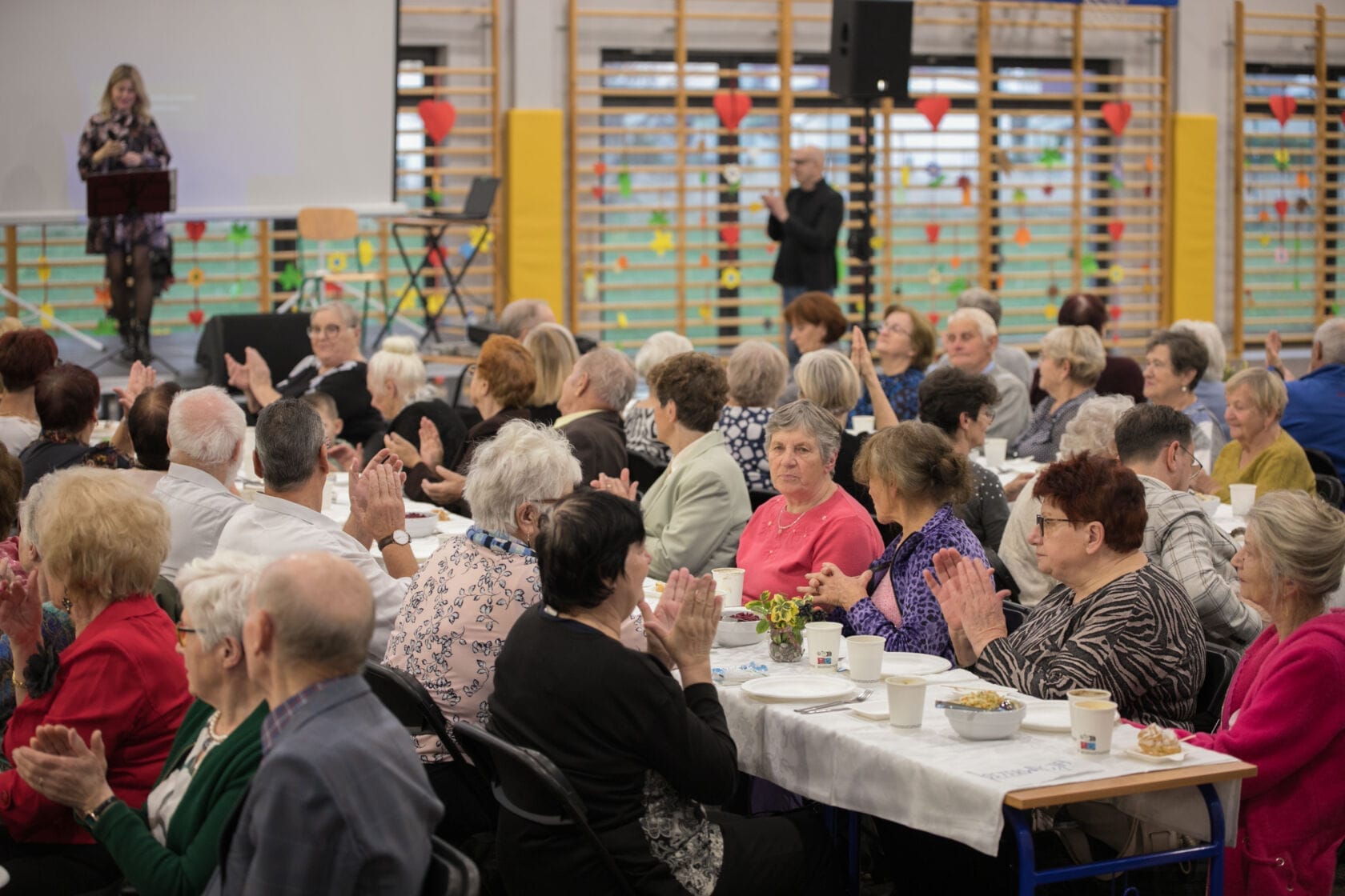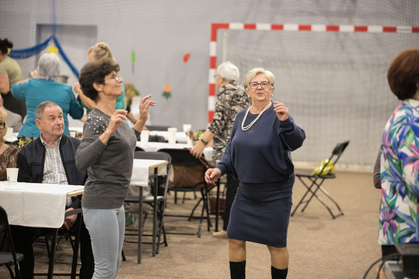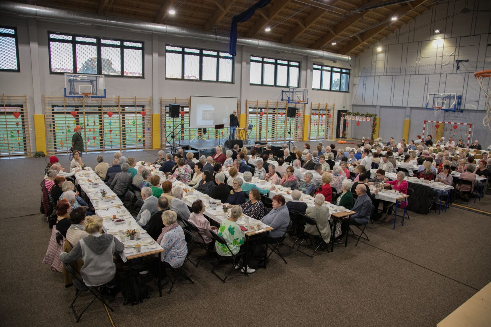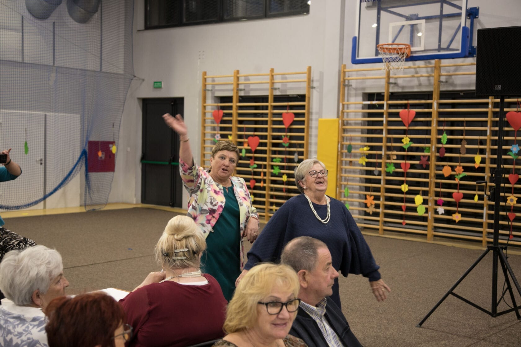 Spotkanie społeczności starszych osób w sali gimnastycznej