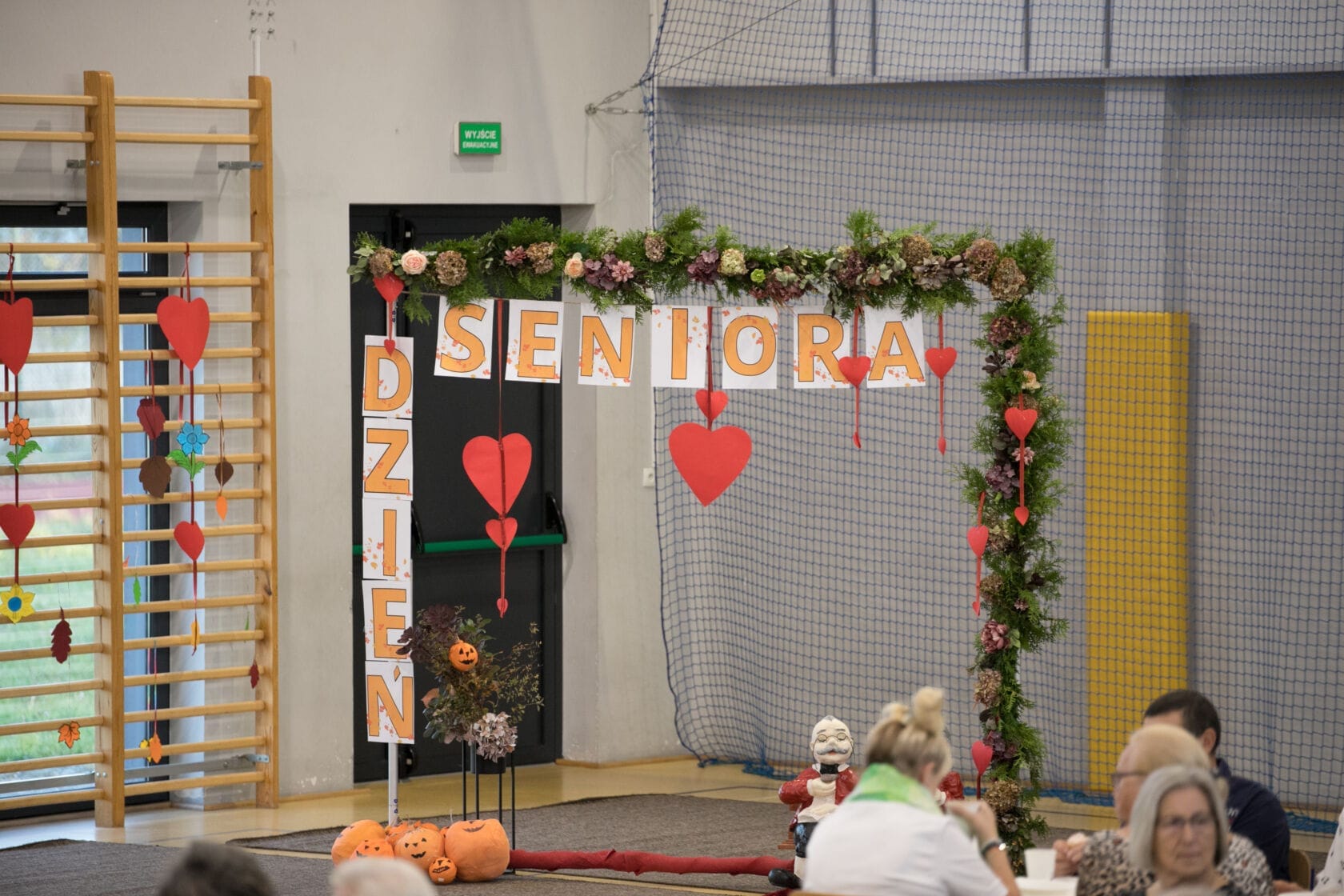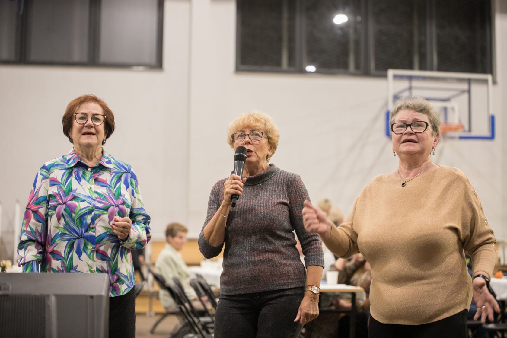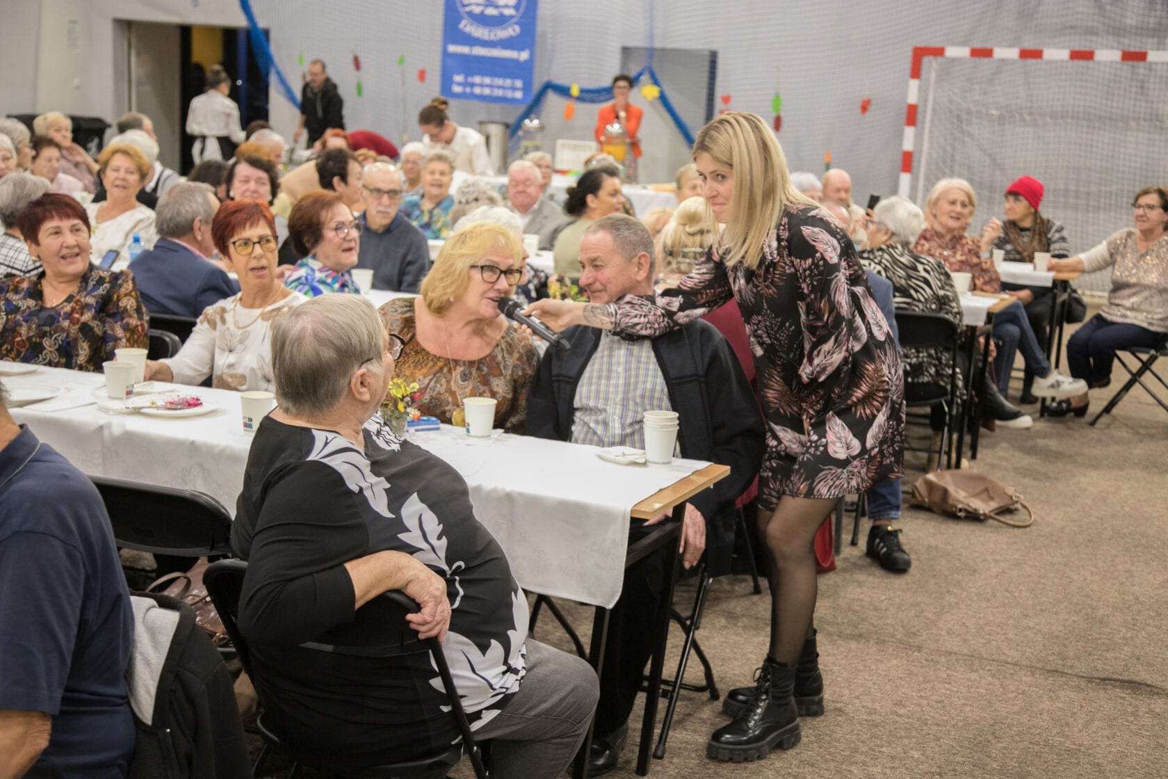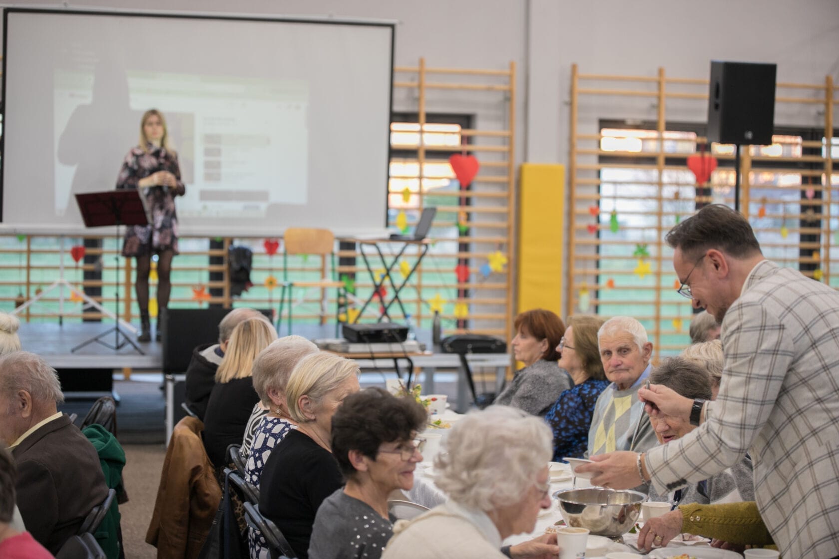 Spotkanie społeczności starszych osób w sali gimnastycznej