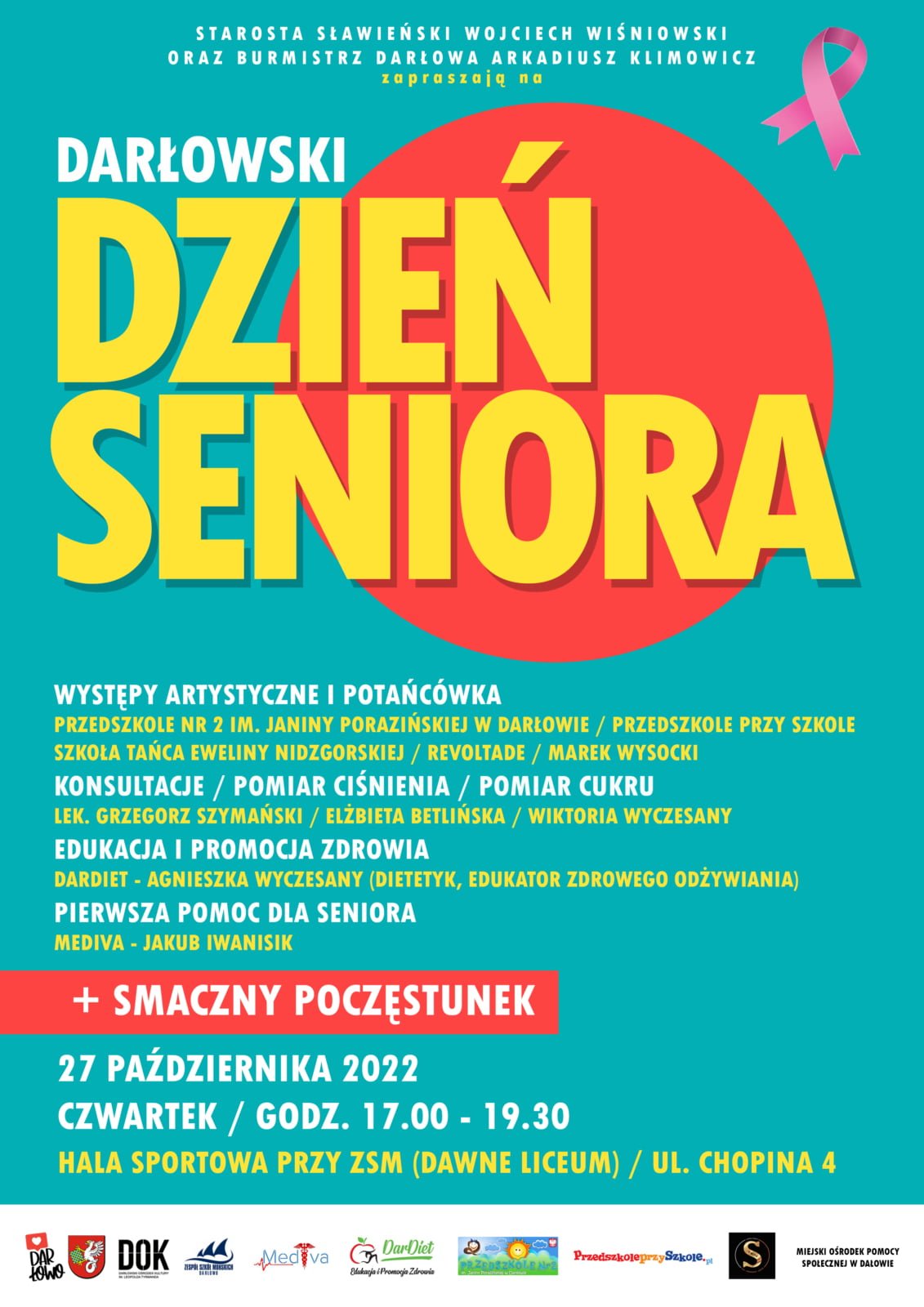 Już 27 października (czwartek) od godz. 17.00 w hali sportowej zlokalizowanej przy Zespole Szkół Morskich (dawne liceum) w Darłowie odbędzie się specjalnie przygotowany z tej okazji program. Nie zabraknie występów artystycznych, smacznego poczęstunku i dobrej zabawy. Dodatkowo seniorzy będą mogli skorzystać z konsultacji lekarskiej, zmierzyć podstawowe parametry jak ciśnienie, czy poziom cukru. Czekać na nich będzie również fachowa pomoc dietetyczna, a ratownicy medyczni podzielą się lekcją udzielenia pierwszej pomocy. Pamiętajmy również, że październik jest miesiącem świadomości nowotworu raka piersi. Tu też zostanie przedstawiona prelekcja pod symbolem różowej wstążki. Organizatorzy przygotowali wiele ważnych informacji jak np. harmonogram dyżurów aptek na najbliższy czas, a każdy z Gości otrzyma specjalny magnes na lodówkę z kompendium istotnych wskazówek dla zdrowia w wieku senioralnym.