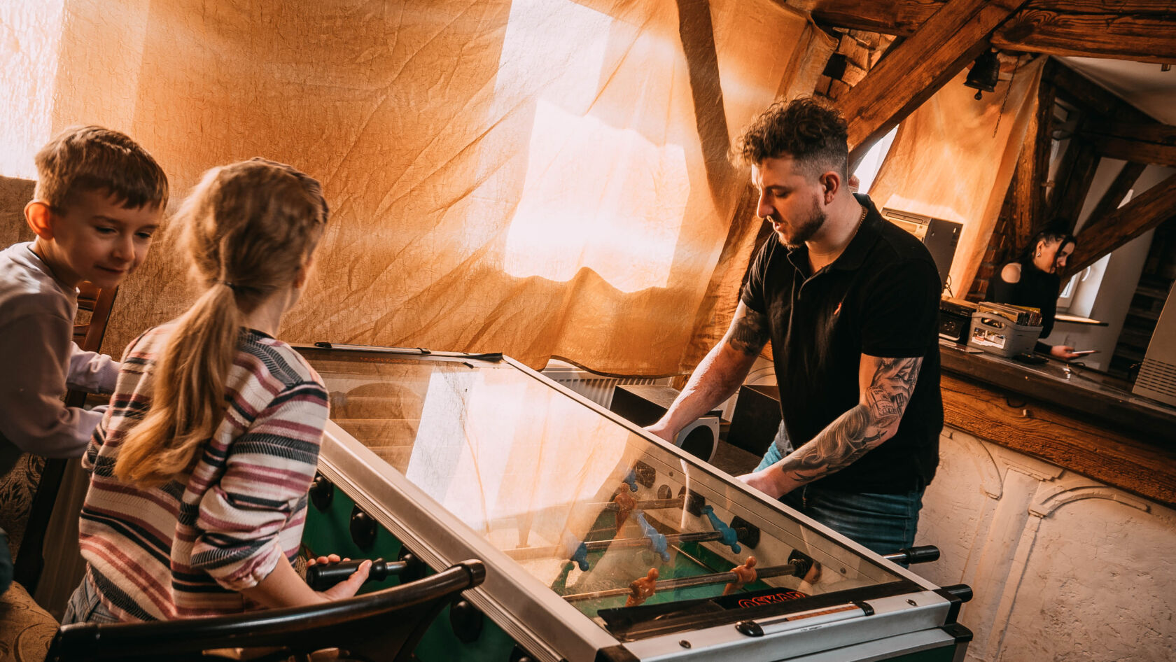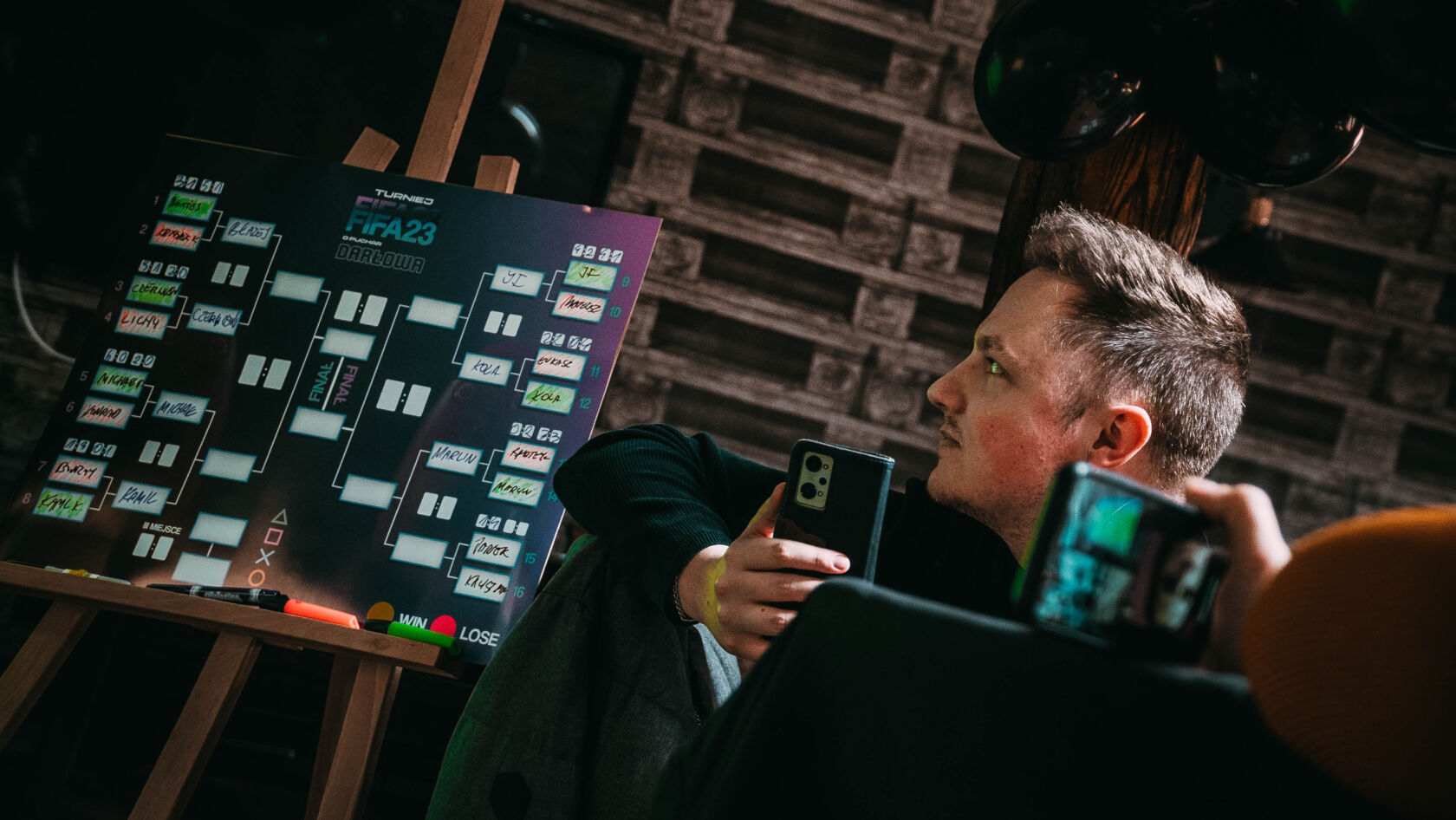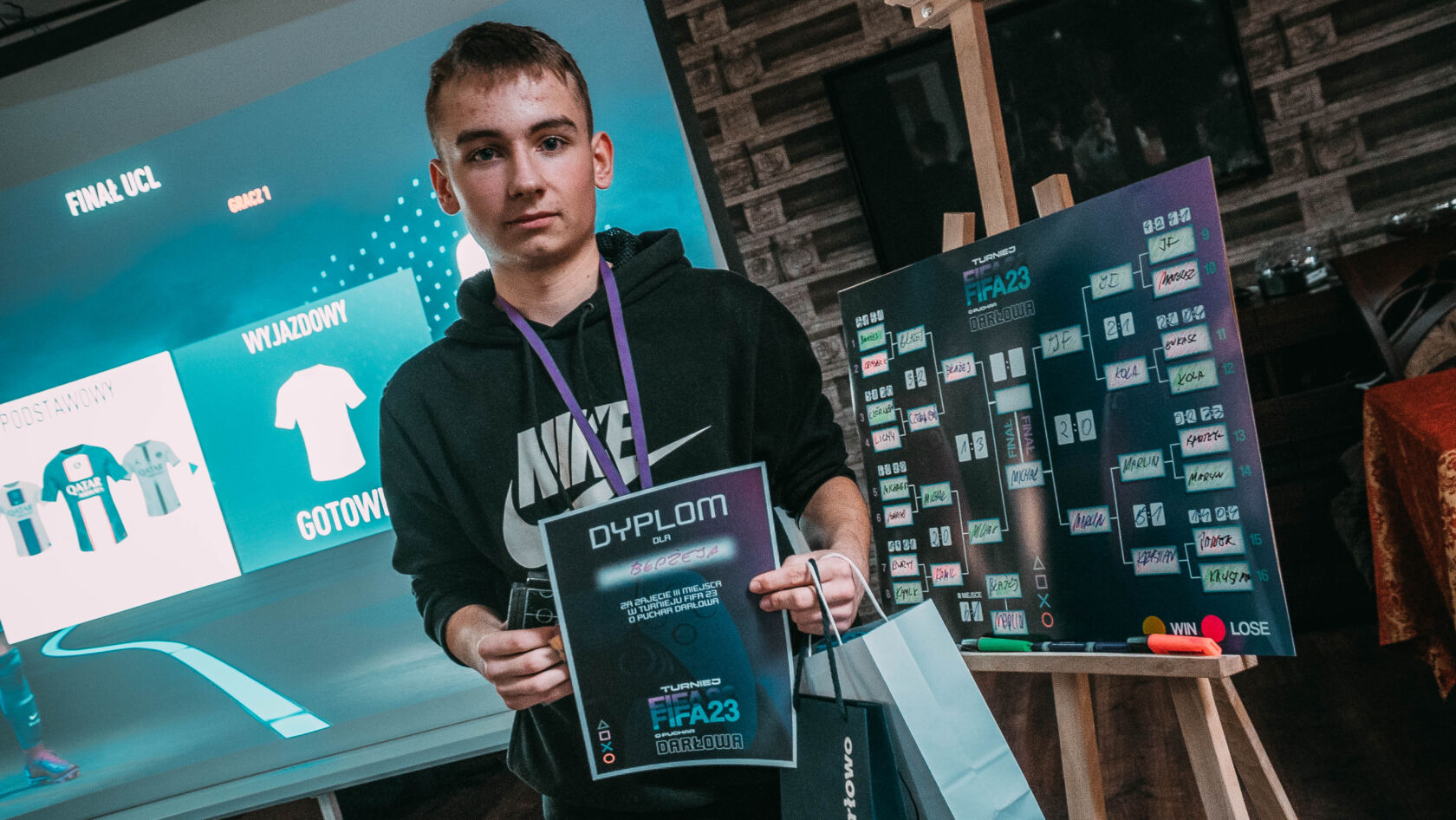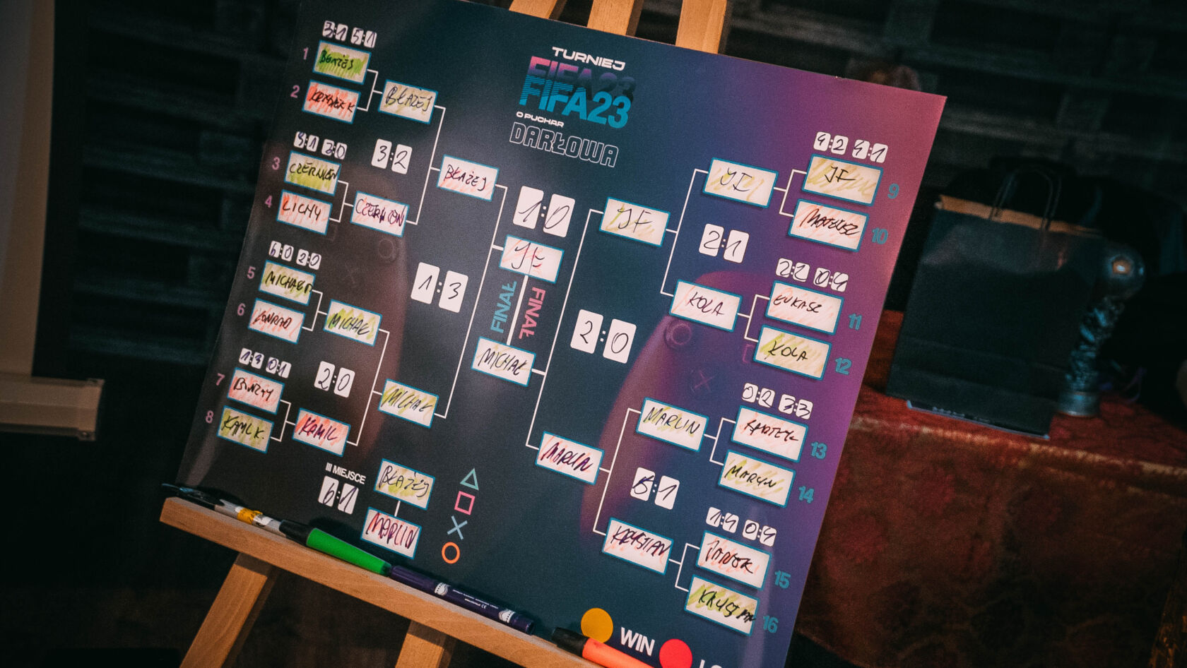 W minioną niedzielę 12 marca nad restauracją Karczma Rzymska w klimatycznym poddaszu zwanym „Klubem u Wampira” rozegrany został oficjalny turniej w grę FIFA 23 na platformie Playstation 5. Stawką było sięgnięcie po puchar Darłowa w tej rozgrywce. Do boju stanęło 16 wprawionych zawodników, którzy na początku kolejki rozgrywali w wylosowanych parach pomiędzy sobą – dwa mecze. Dzięki temu można było wyłonić ćwierćfinalistów, a w następstwie systemem pucharowym po tzw. drabince wspinać się na szczyt. To było, aż 6 godzin emocjonujących rozgrywek w zdrowym duchu rywalizacji i opartych na zasadach fairplay. Wśród zawodników królowały właściwie dwie ulubione drużyny: Manchester United i Paris Saint Germain. Słynny już „Mekambe” bardzo często po wciśniętym przez gracza „kwadracie” na padzie trafiał celnie do bramki. Zawodnicy i kibice w przerwach meczowych mogli również zagrać w barowe piłkarzyki, przypomnieć sobie edycję gry FIFA 99 na konsoli PSX, czy rozegrać mecze papierowe na kartkach w kratkę jak za szkolnych dawnych lat. Głównym zamiarem organizatora jednak była możliwość zintegrowania się ludzi, którzy mają wspólne pasje. Tą była piłka nożna. Zawodnicy wymienili się kontaktami (niczym koszulkami) i zapewne jeszcze nie raz zmierzą się między sobą w swoim prywatnym czasie. Po kilkugodzinnej rozgrywce niczym kapitalny Argetyńczyk – Leo Messi wznoszący puchar Mistrzostw Świata – dumnie najcenniejszą statuetkę darłowskiego turnieju wzniósł Michał Przychodzień. Drugie miejsce przypadło równie mocnemu zawodnikowi – Jakubowi Frycowi. Brązowym medalistą fifowych igrzysk został Błażej Zorn.