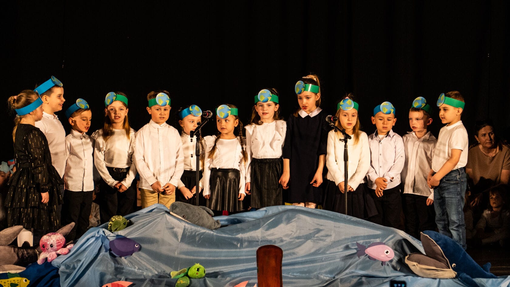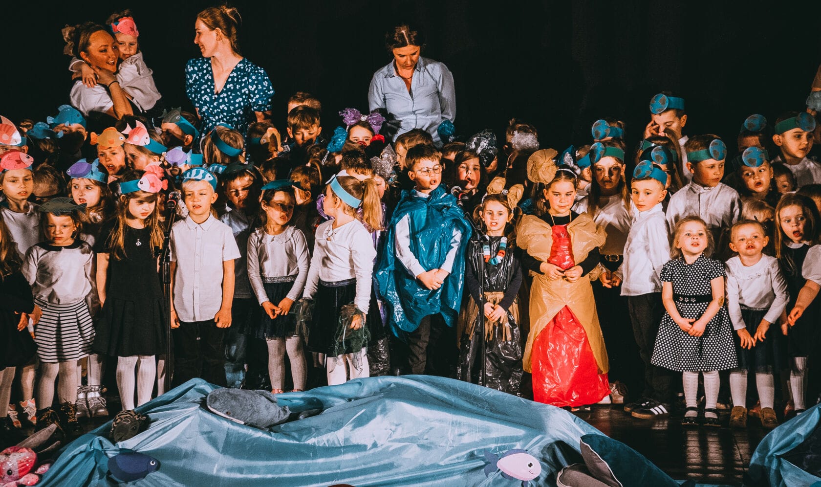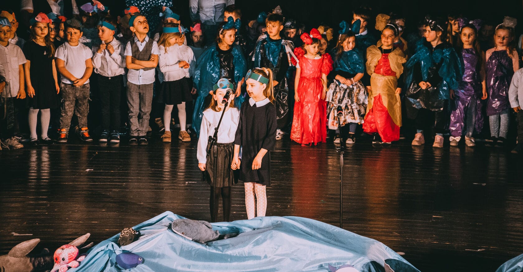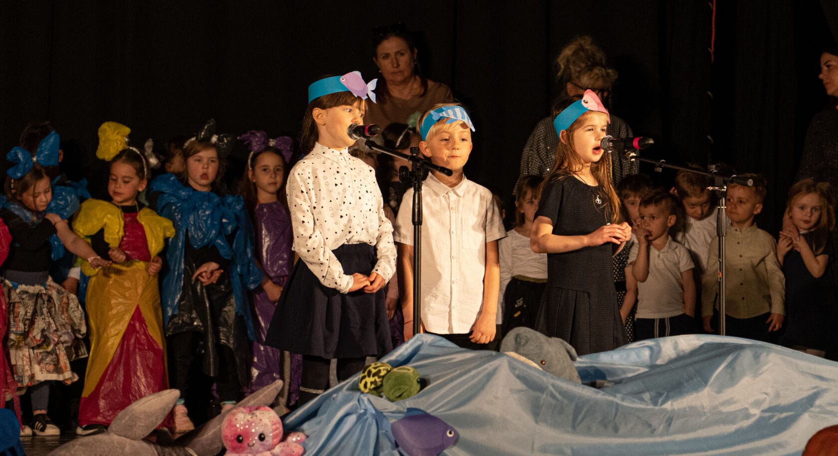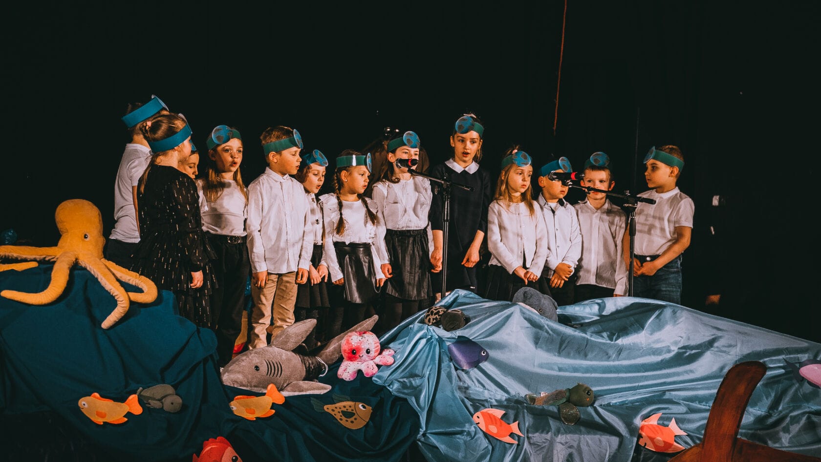 Dzieci występujące na szkolnym przedstawieniu o tematyce morskiej