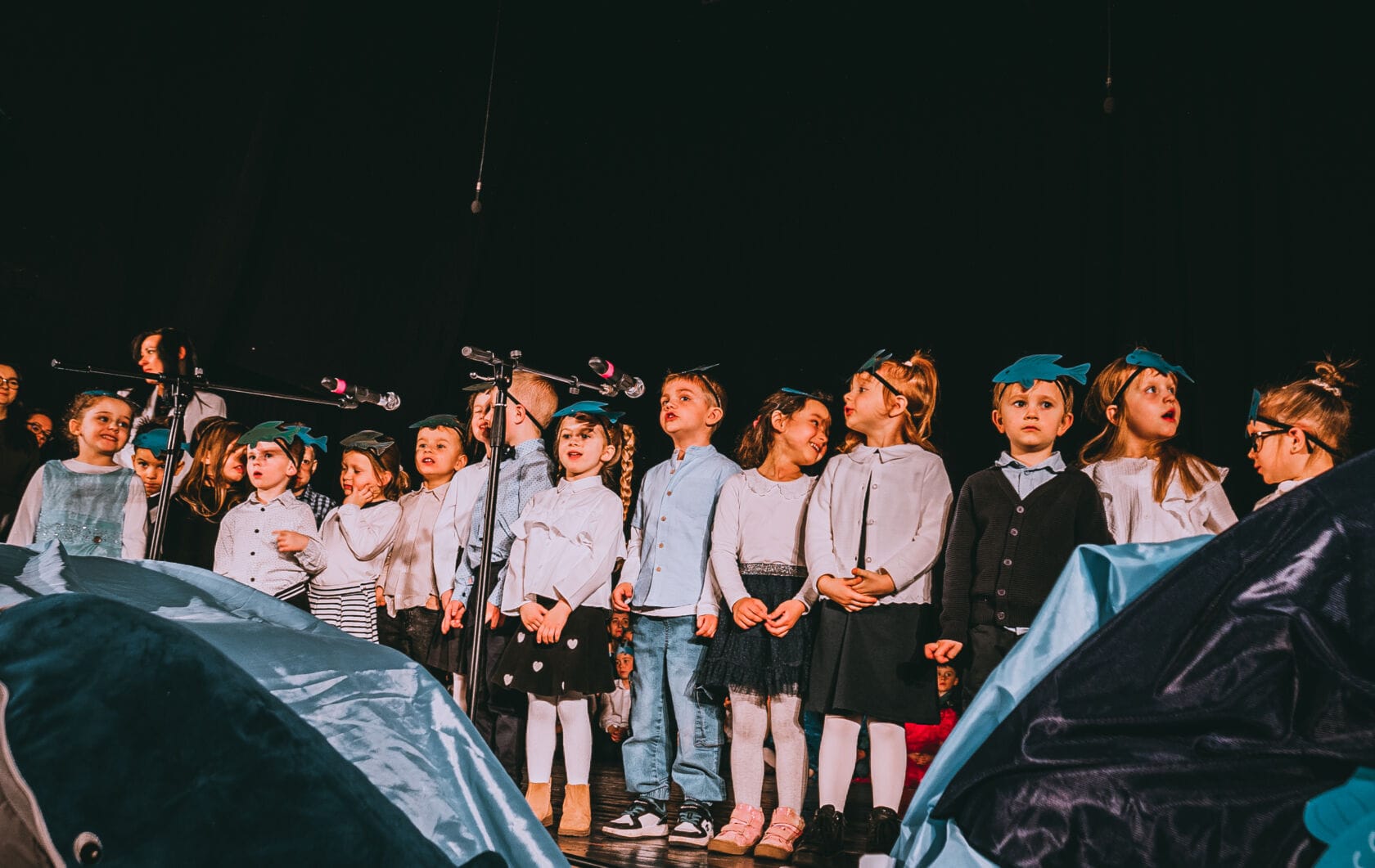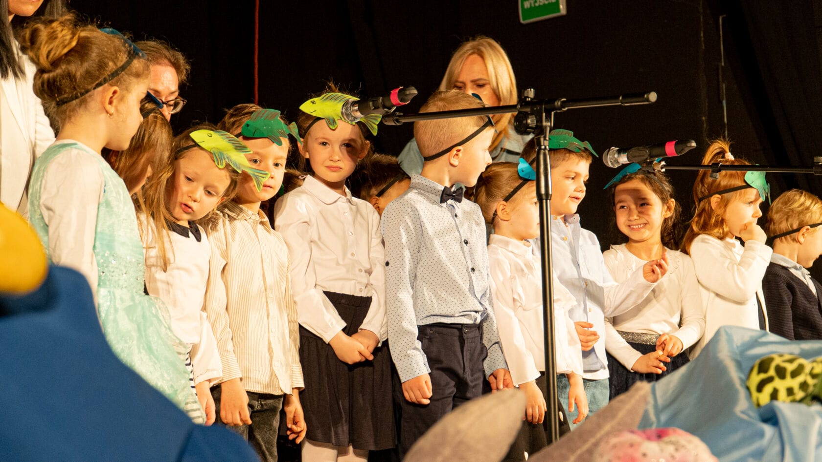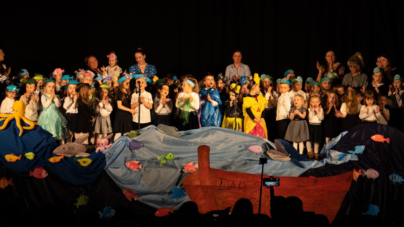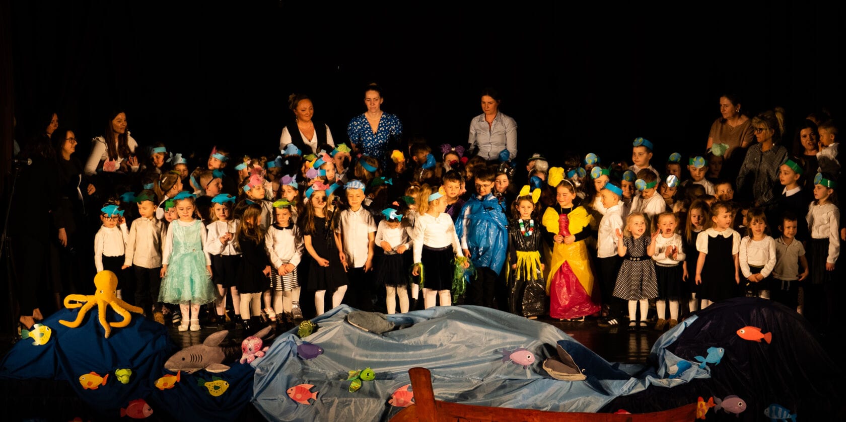 Dzieci występujące na szkolnym przedstawieniu o tematyce morskiej