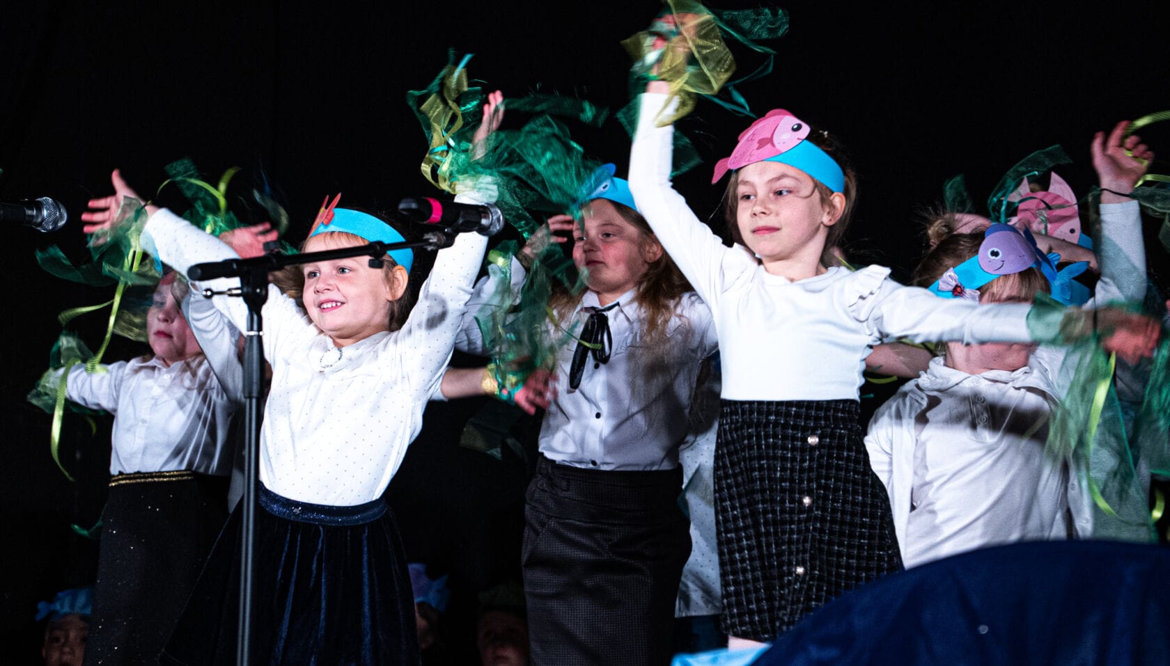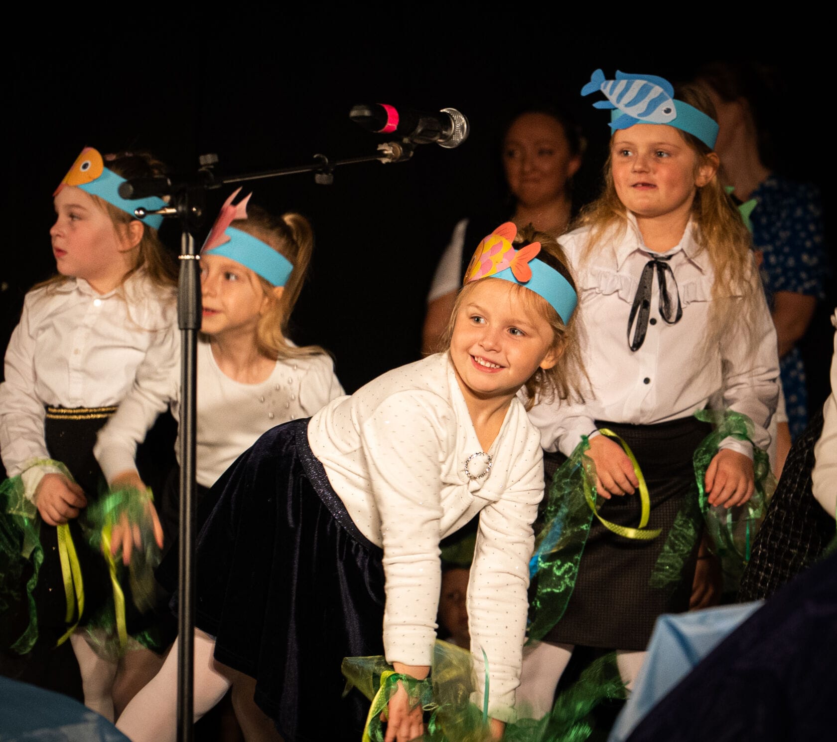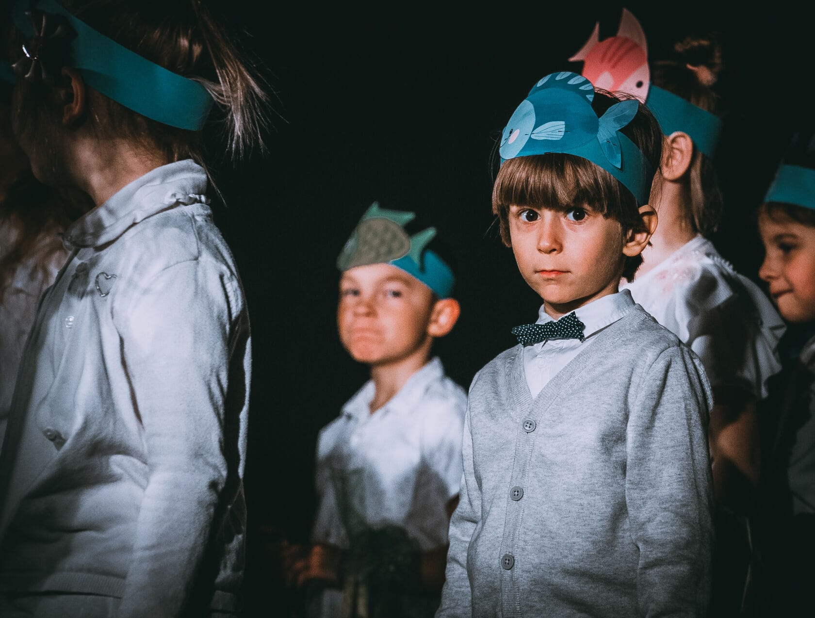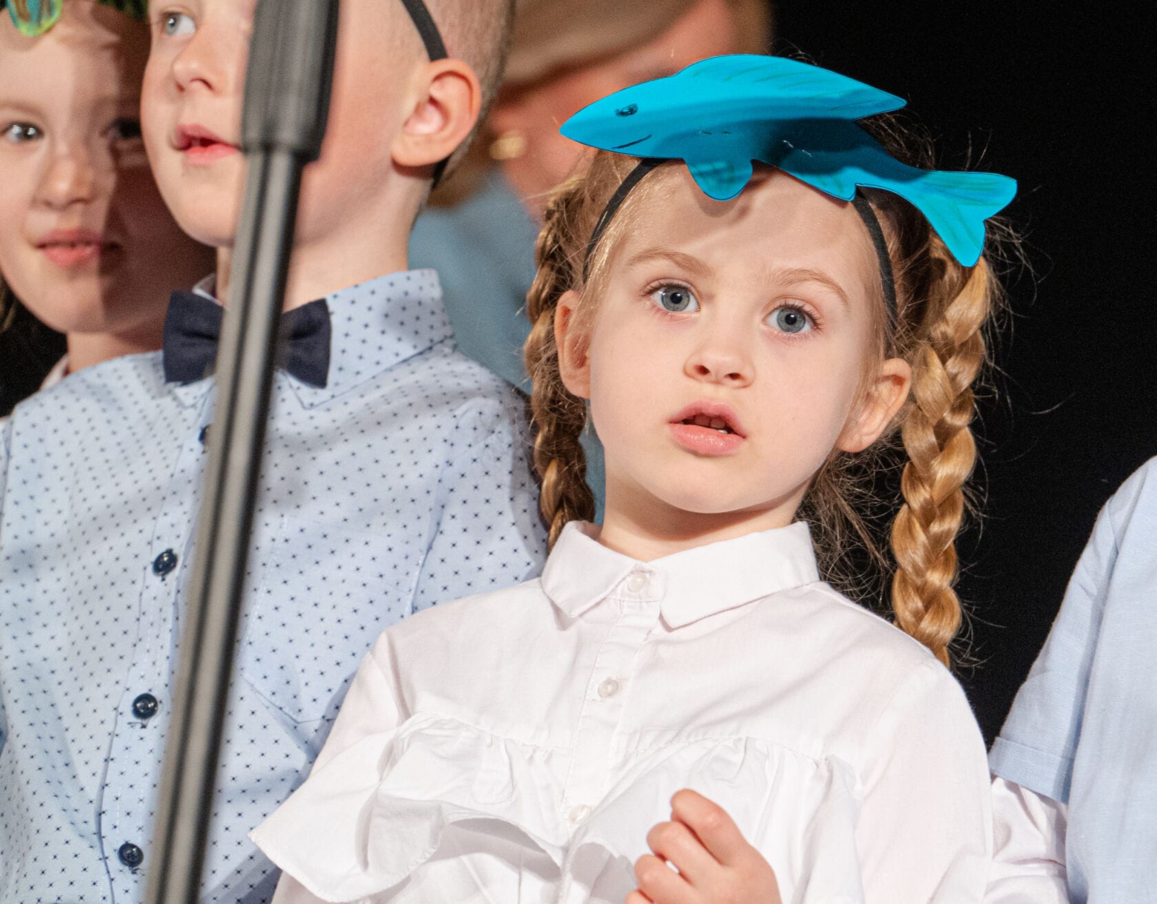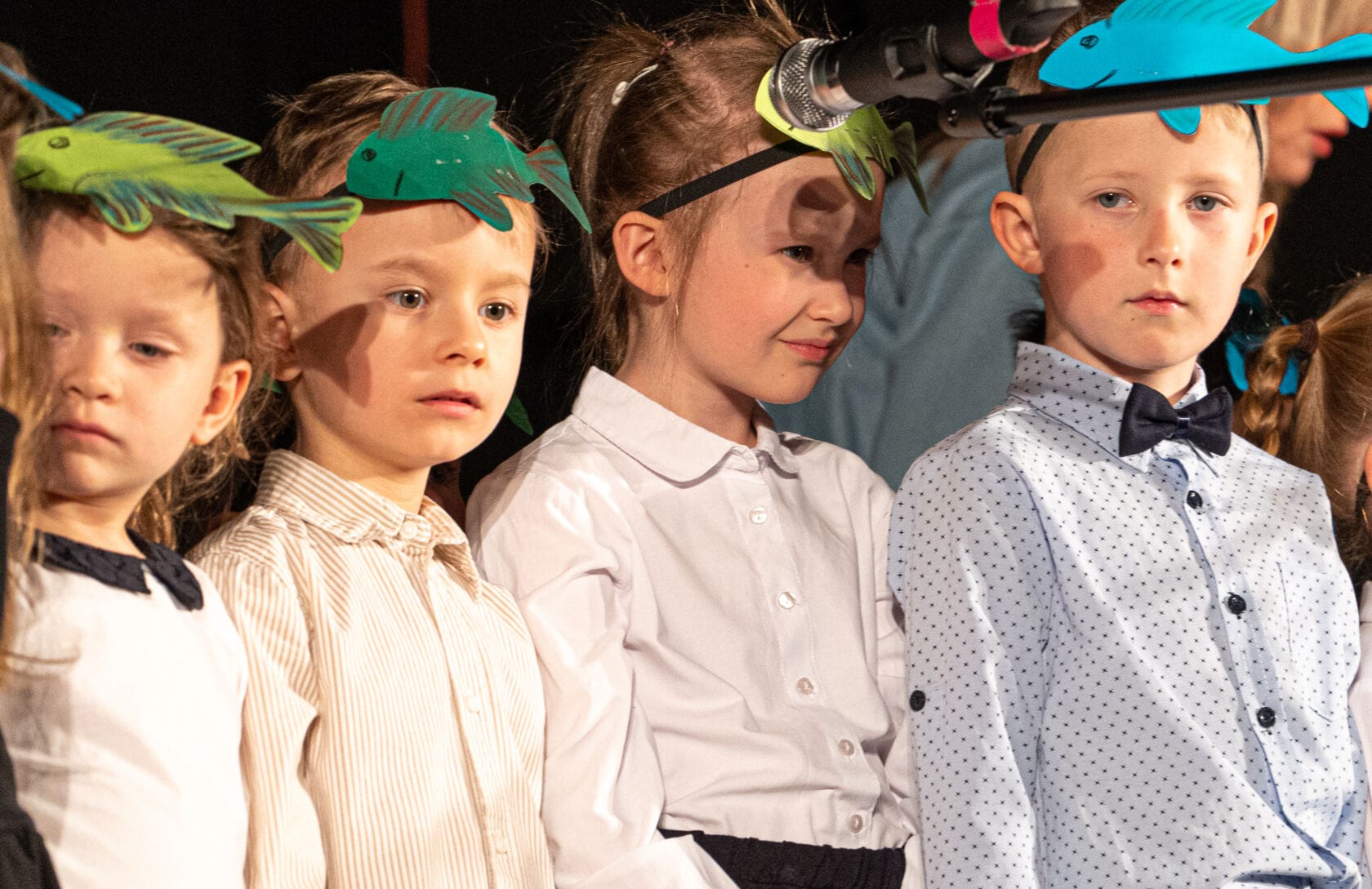 Dzieci występujące na szkolnym przedstawieniu o tematyce morskiej