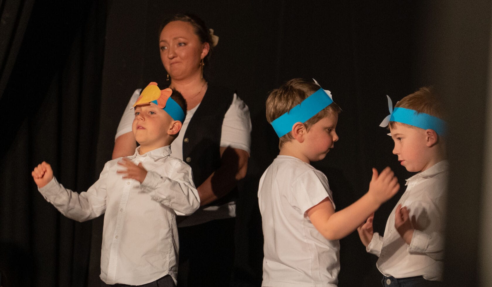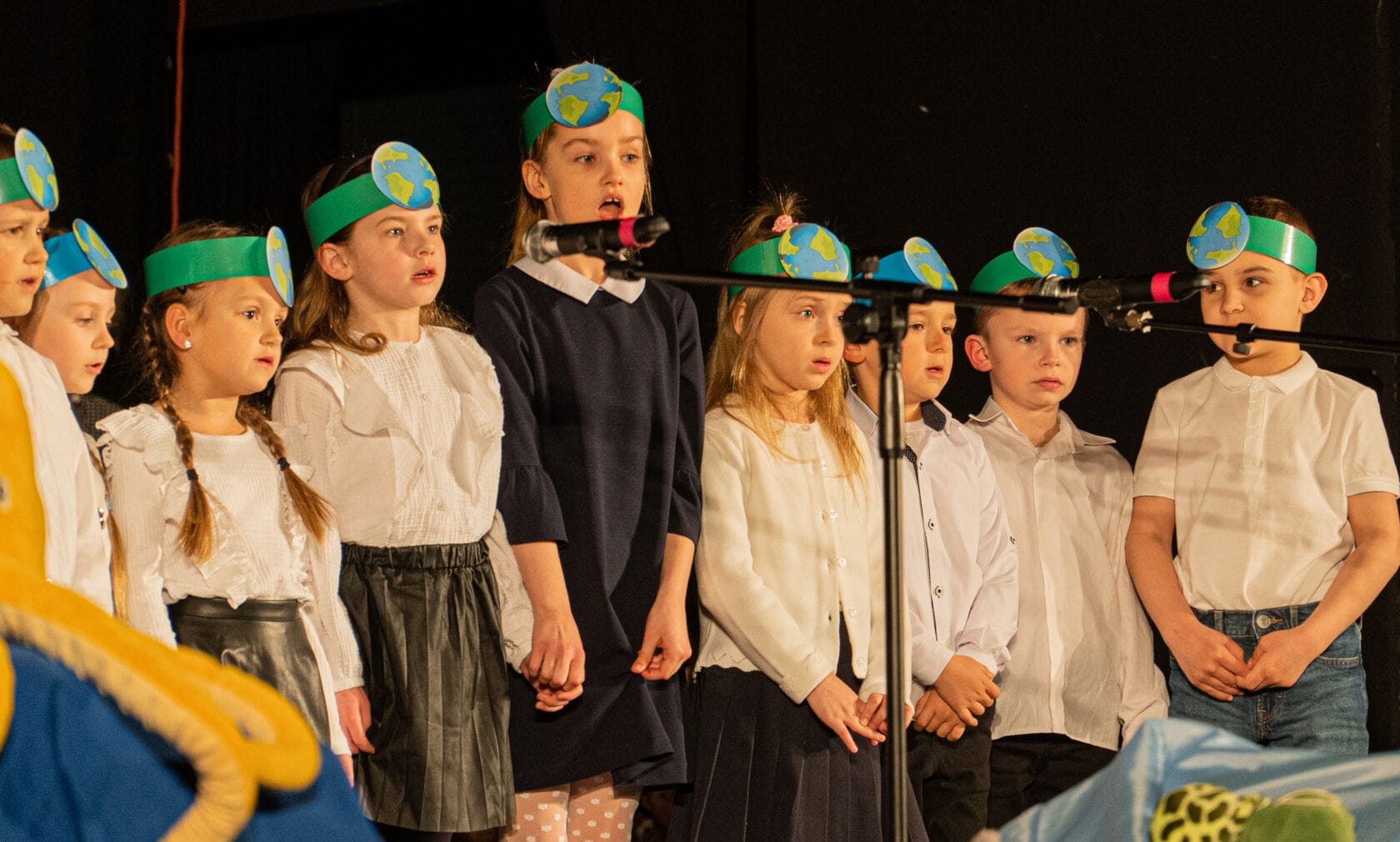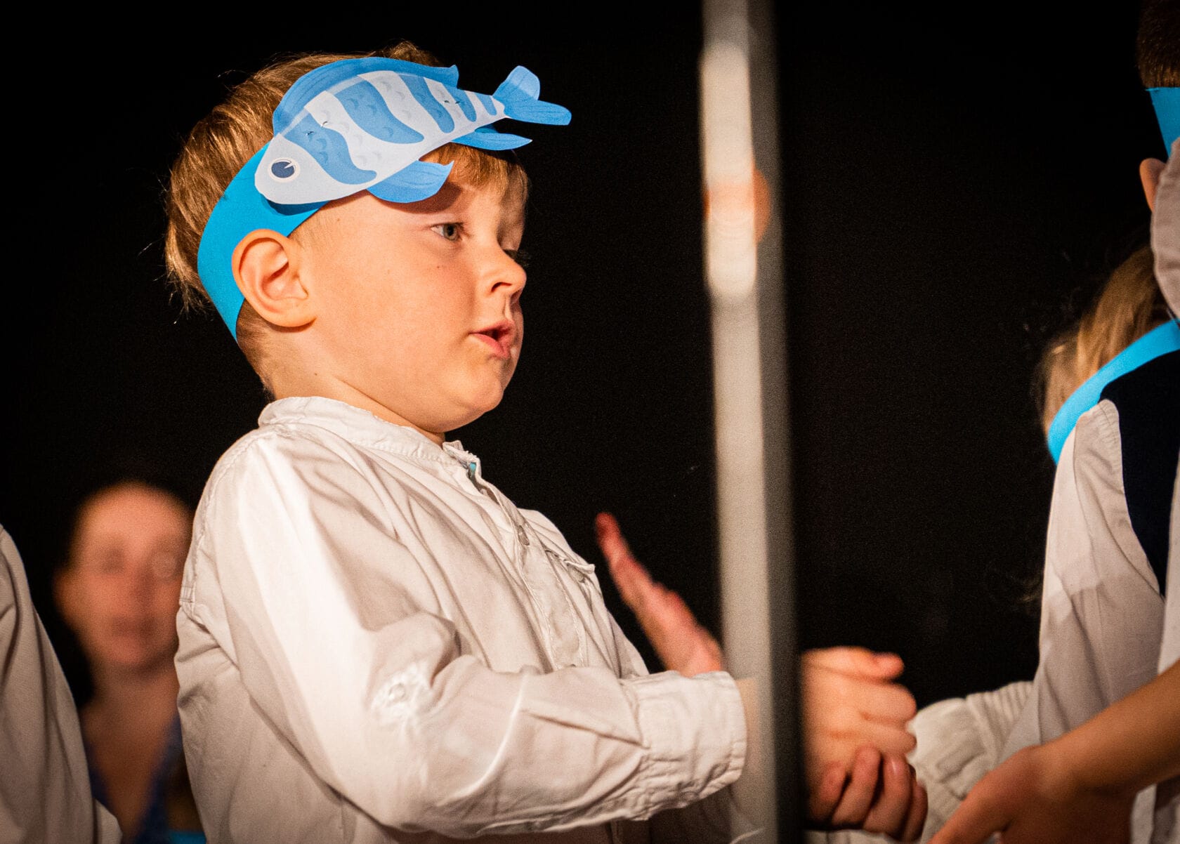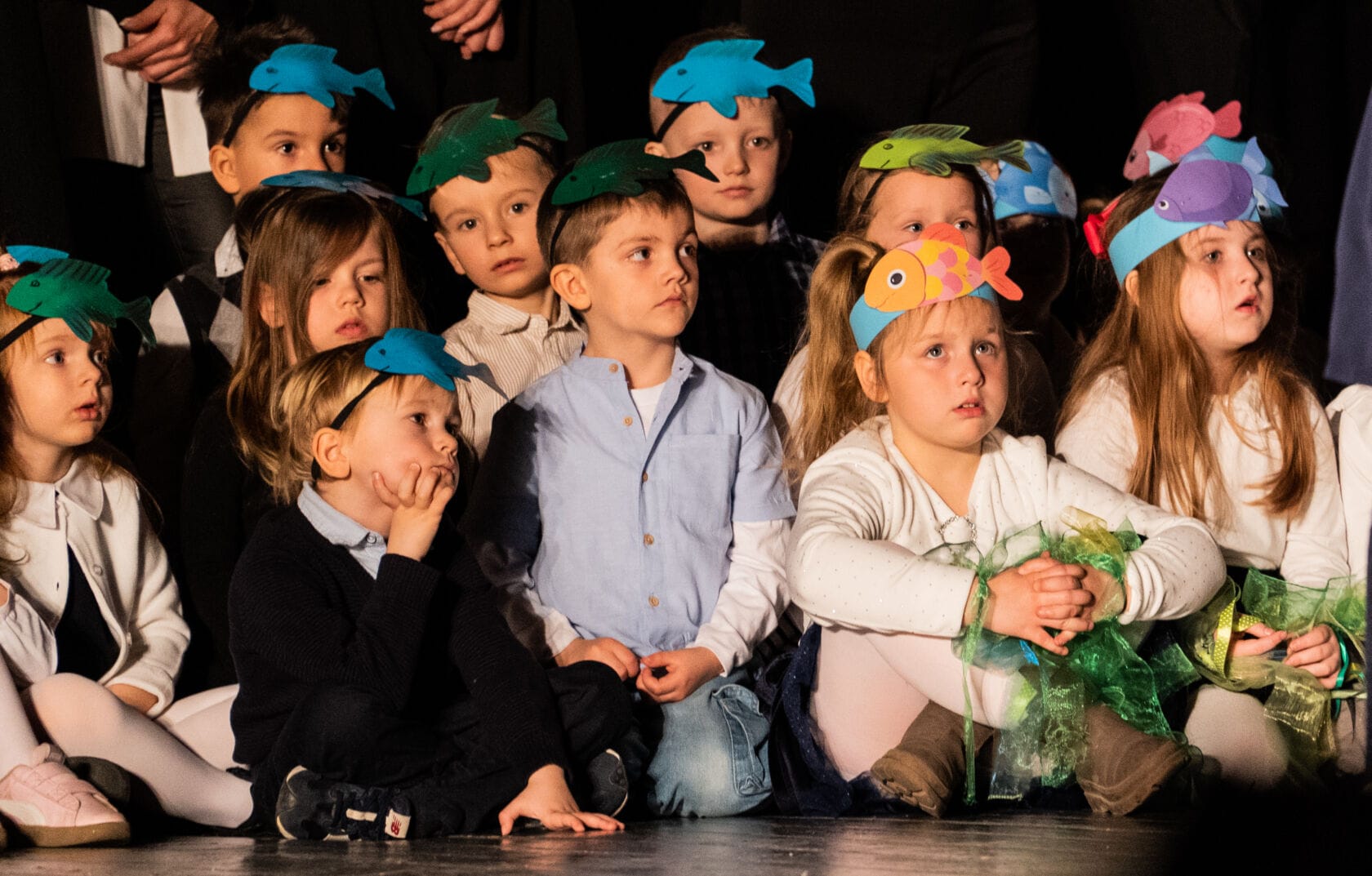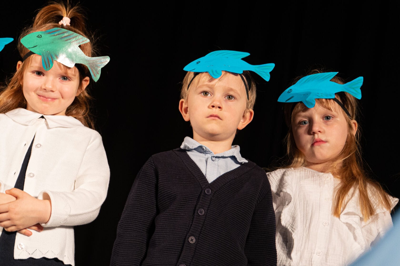 Dzieci występujące na szkolnym przedstawieniu o tematyce morskiej