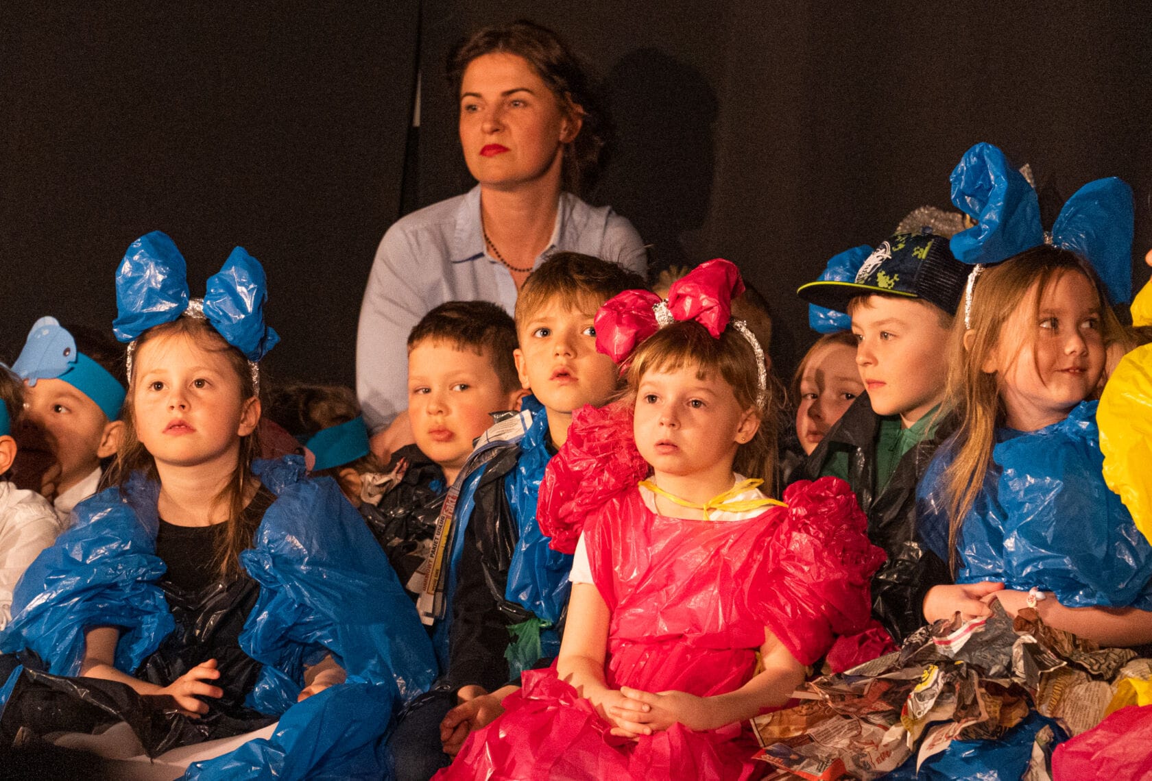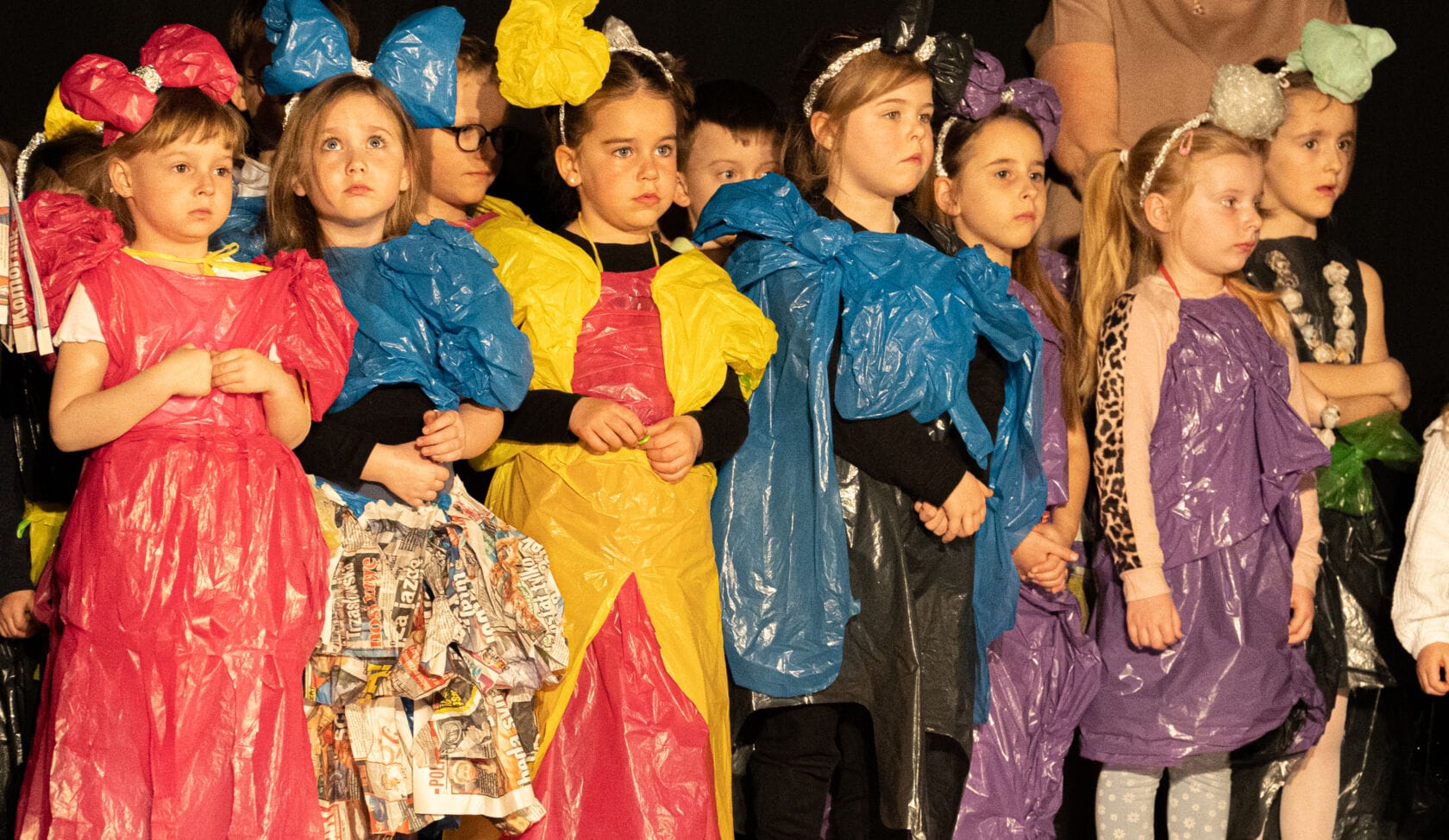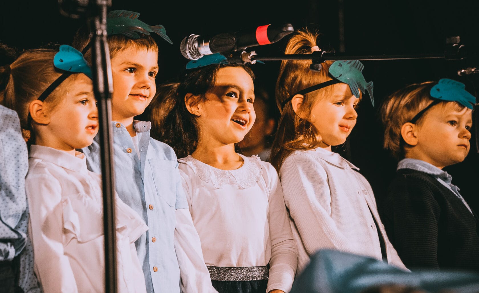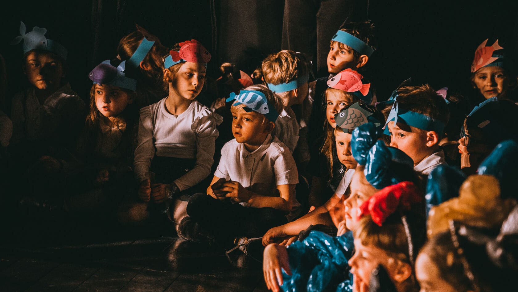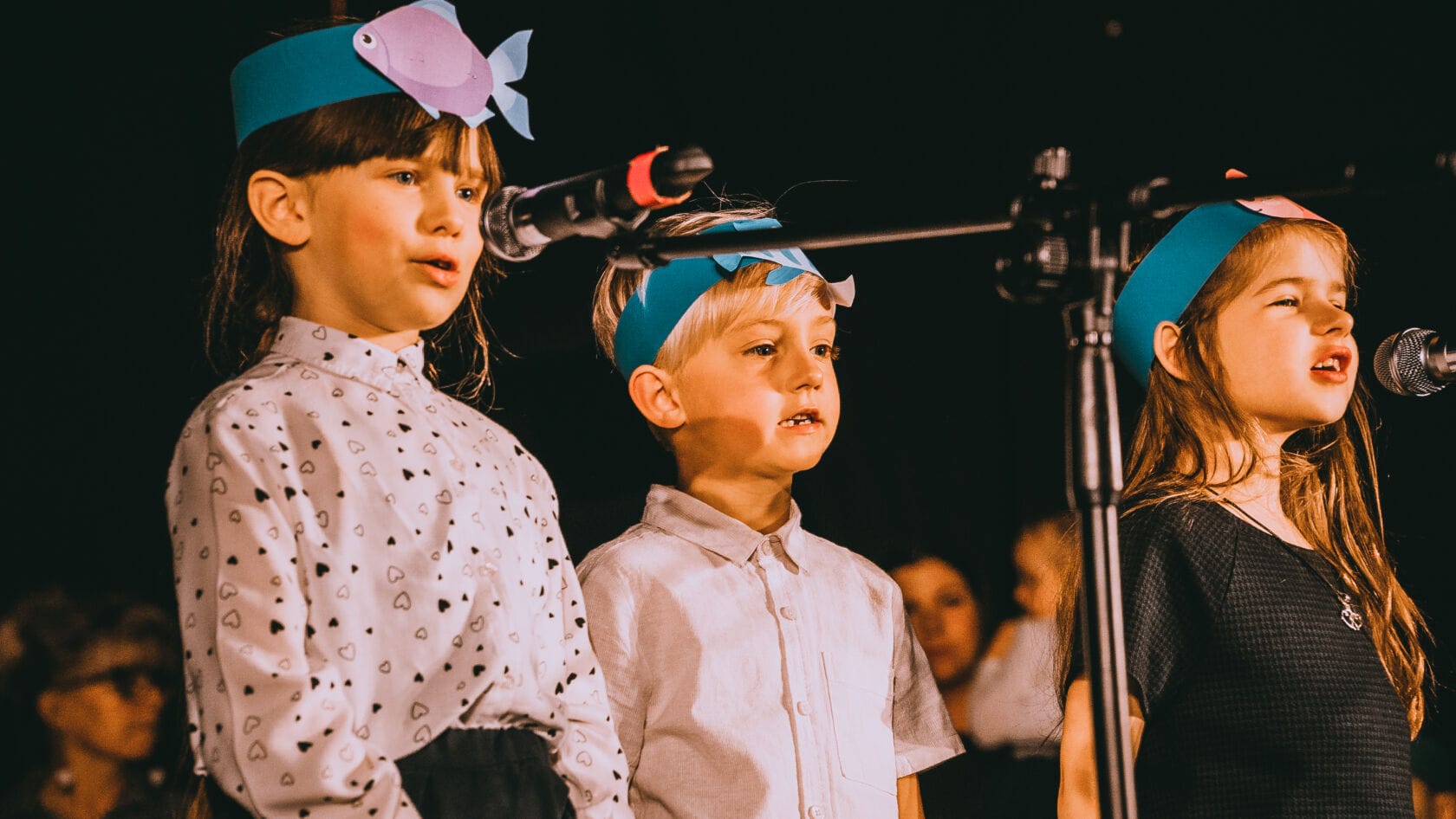 Dzieci występujące na szkolnym przedstawieniu o tematyce morskiej