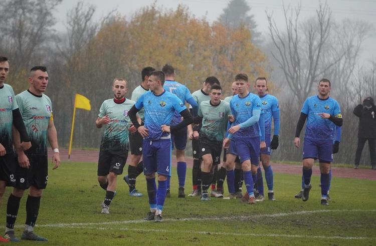 Piłkarze na boisku w mżawce, drużyny w turkusowych i szarych strojach