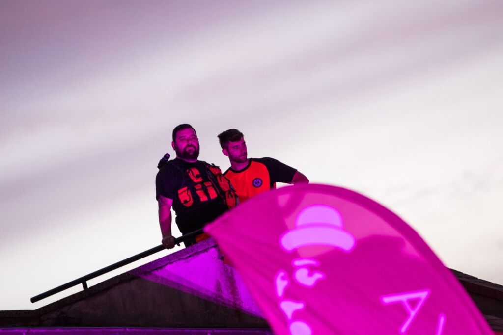 Grupa uśmiechniętych ludzi z kwiatami na wydarzeniu nocnym