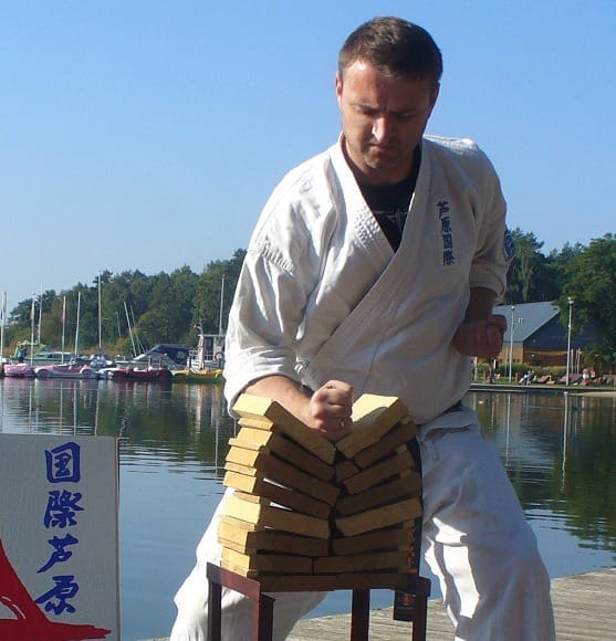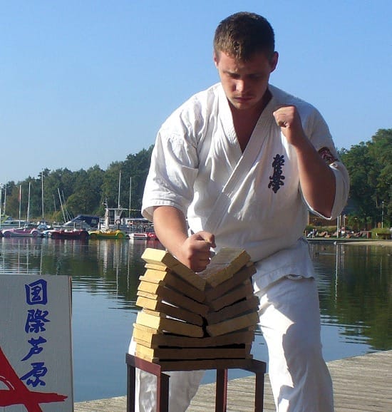 1. Zwycięzca turnieju tameshiwari Adam Kapuściński z Koszalina podczas konkurencji